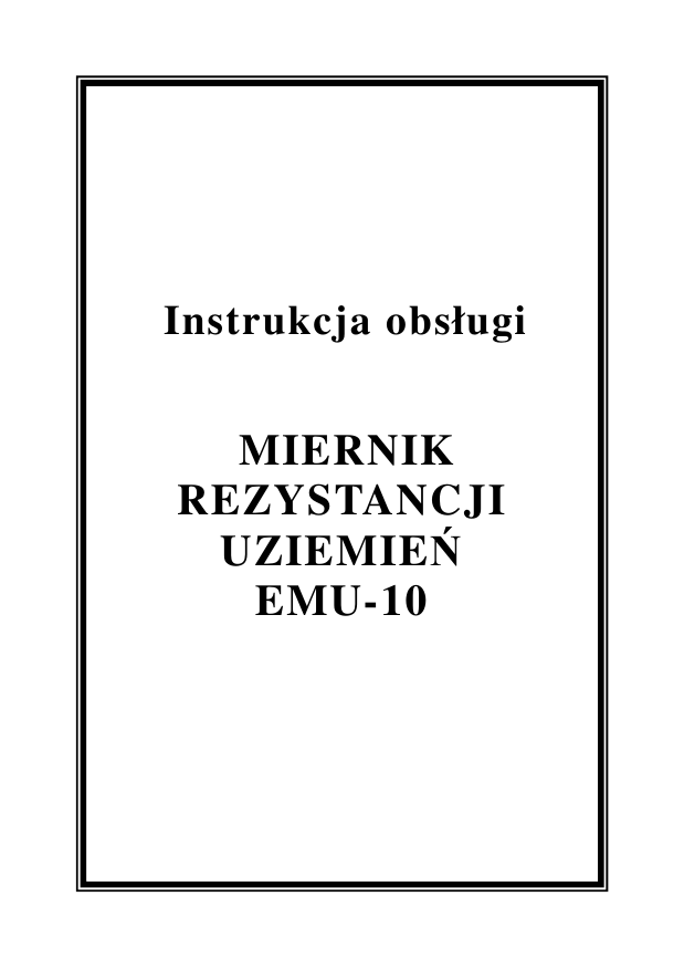 Instrukcja obsługi MIERNIK REZYSTANCJI UZIEMIEŃ EMU-10 SPIS TREŚCI 1. WSTĘP 3 2. ZASADY BEZPIECZNEGO UŻYTKOWANIA 3 3. SYMBOLE UŻYTE NA MIERNIKU 5 4. CHARAKTERYSTYKA MIERNIKA 6 5. ZASTOSOWANIE 6 6. DANE TECHNICZNE 7 7. WARUNKI EKSPLOATACJI 8 8. WYPOSAŻENIE 8 9. BUDOWA I ZASADA DZIAŁANIA 9 10. POMIARY 11 10.1. INFORMACJE OGÓLNE 11 10.2. KOLEJNOŚĆ CZYNNOŚCI PODCZAS WYKONYWANIA POMIARÓW 13 10.3. POMIAR REZYSTANCJI UZIEMIEŃ 14 10.4. POMIAR REZYSTYWNOŚCI GRUNTU 18 10.5. POMIAR MAŁYCH RERZYSTANCJI 20 2 1. WSTĘP Cyfrowy miernik EMU-10, przeznaczony jest do pomiaru rezystancji uziemień odgromowych, rezystancji uziemień ochronnych i roboczych oraz małych rezystancji, na przykład w połączeniach wyrównawczych. Dzięki temu, że nie potrzebuje zewnętrznego źródła zasilania oraz łatwej i bezpiecznej obsłudze, jest wysokiej jakości miernikiem. Jego wielofunkcyjność sprawia, iż jest to bardzo atrakcyjny produkt. 2. ZASADY BEZPIECZNEGO UŻYTKOWANIA Przed przystąpieniem do korzystania z miernika, użytkownik MUSI przeczytać wszystkie ostrzeżenia i instrukcję obsługi. Ostrzeżenia i zapisy instrukcji, muszą być bezwzględnie przestrzegane podczas używania miernika. • Instrukcja obsługi obowiązuje tylko dla miernika, do którego została dołączona. • Inne zastosowanie miernika, niż podane w instrukcji może spowodować jego uszkodzenie lub być zagrożeniem dla użytkownika. • Osoba wykonująca pomiary powinna być odpowiednio wykwalifikowana. Użytkowanie miernika przez osoby niewykwalifikowane, grozi jego uszkodzeniem lub może być źródłem niebezpieczeństwa dla zdrowia i życia ludzkiego. • Sam miernik nie wytwarza napięć, które mogłyby być niebezpieczne dla użytkownika. Natomiast badane obwody elektryczne oraz warunki, w jakich wykonuje się pomiary rezystancji uziemień, mogą przy bardzo niekorzystnym zbiegu okoliczności stworzyć zagrożenie dla zdrowia i życia obsługującego. 3 • Nie należy wykonywać pomiarów uziemień, podczas zapowiadanej aktywności burzowej na obszarach obejmujących badany obiekt, badaną stację i zasilane z niej sieci energetyczne. Jeżeli wystąpi zagrożenie burzowe, należy przerwać pomiary i odłączyć sondy pomiarowe. • Należy stosować gumowe rękawice i gumowe buty, podczas badania rozbudowanych systemów uziemienia pod napięciem, gdzie mogą wystąpić niebezpieczne napięcia na przewodach uziomowych oraz wysokie napięcia krokowe, spowodowane awarią w pobliskiej stacji. • Należy unikać dotykania gołymi rękami, nieizolowanych części rozciągniętych przewodów pomiarowych. • Osoba wykonująca pomiary powinna posiadać całkowitą pewność, co do sprawności używanego miernika. • Miernik oraz osprzęt dodatkowy taki, jak przewody i końcówki pomiarowe, nie mogą być użytkowane, jeżeli jakieś ich elementy są uszkodzone. • Nie należy dokonywać żadnych napraw miernika, przewodów oraz sond pomiarowych. • Naprawy serwisowe może wykonywać jedynie producent. • Podłączanie przewodów innych, niż tych dostarczonych przez producenta, niedostosowanych do wysokiego napięcia, grozi porażeniem. • Miernik nie może być pozostawiony bez dozoru, jeśli jest podłączony do badanego obwodu. • Badane uziemienie powinno być odłączone od obwodu prądowego, jeżeli pozwalają na to warunki techniczne. • Podczas wymiany baterii, miernik należy odłączyć od wszystkich obwodów zewnętrznych. • Przepisy BHP wymagają przeprowadzenia oceny, ryzyka przy wykonywaniu pracy z urządzeniami elektrycznymi oraz zidentyfikowanie potencjalnych źródeł zagrożenia i ryzyka. 4 3. SYMBOLE UŻYTE NA MIERNIKU -Oznaczenie CE symbolizuje zgodność wyrobu z regulacjami Unii Europejskiej, które mają do tego wyrobu zastosowanie. -Urządzenie chronione jest za pomocą izolacji podwójnej lub wzmocnionej. -Uwaga: Miernik posiada wytyczne obsługi i konserwacji, w postaci pisemnej bądź elektronicznej instrukcji, załączonej do egzemplarza urządzenia. Instrukcja musi być przeczytana przed rozpoczęciem użytkowania miernika! -Uwaga: Ostrzeżenie przed porażeniem elektrycznym. -To urządzenie jest oznaczone zgodnie z Dyrektywą Europejską 2002/96/WE oraz polską Ustawą o zużytym sprzęcie elektrycznym i elektronicznym symbolem przekreślonego kontenera na odpady. Takie oznakowanie informuje, że sprzęt ten, po okresie użytkowania nie może być umieszczany łącznie z innymi odpadami pochodzącymi z gospodarstwa domowego. Użytkownik zobowiązany jest do oddania go prowadzącym zbieranie zużytego sprzętu elektrycznego i elektronicznego. Prowadzący zbieranie, w tym lokalne punkty zbiórki, sklepy oraz gminne jednostki, tworzą odpowiedni system umożliwiający oddanie tego sprzętu. 5 4. CHARAKTERYSTYKA MIERNIKA Cechy charakterystyczne miernika: - Niezawodny w działaniu. - Pomiar rezystancji uziemienia metodą techniczną 4-, 3-, lub 2-przewodową. - Bezpośredni odczyt wyniku pomiaru na wyświetlaczu LCD. - Zasilanie bateryjne. - Sygnalizacja, zbyt dużej rezystancji obwodu napięciowego RP, mogącej spowodować błąd pomiaru za pomocą diody LED „RP”. - Sygnalizacja, zbyt dużej rezystancji obwodu prądowego RC, mogącej spowodować błąd pomiaru za pomocą diody LED „RC”. - Sygnalizacja, zbyt dużego napięcia zakłócającego UZ, mogącego spowodować błąd pomiaru za pomocą diody LED „UZ”. - Zabezpieczenie obwodów pomiarowych. - Ergonomiczny futerał ułatwiający przenoszenie i wykonywanie pomiarów w trudnych warunkach. Miernik IMU-10 spełnia zalecenia normy PN-EN 61557-5, dotyczące pomiarów w gospodarstwach rolnych, górna granica napięcia przy otwartym obwodzie (25V RMS lub 35V wartości szczytowej). 5. ZASTOSOWANIE Miernik rezystancji uziemień EMU-10, przeznaczony jest do pomiaru rezystancji uziemień, rezystywności gruntów oraz małych rezystancji do 2000Ω. Pomiar realizowany jest metodą 4-przewodową, dzięki czemu długość i rezy