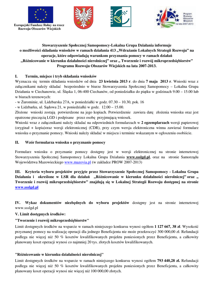 Stowarzyszenie Społecznej Samopomocy-Lokalna Grupa Działania informuje o możliwości składania wniosków w ramach działania 413 „Wdrażanie Lokalnych Strategii Rozwoju” na operacje, które odpowiadają warunkom przyznania pomocy w ramach działań „Różnicowanie w kierunku działalności nierolniczej” oraz ,, Tworzenie i rozwój mikroprzedsiębiorstw” Programu Rozwoju Obszarów Wiejskich na lata 2007-2013. I. Termin, miejsce i tryb składania wniosków Wyznacza się termin składania wniosków od dnia 23 kwietnia 2013 r. do dnia 7 maja 2013 r. Wnioski wraz z załącznikami należy składać bezpośrednio w biurze Stowarzyszenia Społecznej Samopomocy – Lokalna Grupa Działania w Ciechanowie, ul. Śląska 1, 06-400 Ciechanów, od poniedziałku do piątku w godzinach 9.00 – 15.00 lub w biurach terenowych: - w Żurominie, ul. Lidzbarska 27A, w poniedziałki w godz. 07.30 – 10.30, pok. 16 - w Lidzbarku, ul. Sądowa 21, w poniedziałki w godz. 12.00 – 15.00. Złożone wnioski zostają potwierdzone na jego kopiach. Potwierdzenie zawiera datę złożenia wniosku oraz jest opatrzone pieczęcią LGD i podpisane przez osobę przyjmującą wniosek. Wnioski wraz z załącznikami należy składać na odpowiednich formularzach w 2 egzemplarzach wersji papierowej (oryginał + kopia)oraz wersji elektronicznej (CDR), przy czym wersja elektroniczna winna zawierać formularz wniosku o przyznanie pomocy. Wnioski należy składać w miejscu i terminie wskazanym w ogłoszeniu osobiście. II. Wzór formularza wniosku o przyznanie pomocy Formularz wniosku o przyznanie pomocy dostępny jest w wersji elektronicznej na stronie internetowej Stowarzyszenia Społecznej Samopomocy Lokalna Grupa Działania www.ssslgd.pl, oraz na stronie Samorządu Województwa Mazowieckiego www.mazovia.pl (w zakładce PROW 2007-2013) III. Kryteria wyboru projektów przyjęte przez Stowarzyszenie Społecznej Samopomocy - Lokalna Grupa Działania i określone w LSR dla działań „Różnicowanie w kierunku działalności nierolniczej” oraz ,, Tworzenie i rozwój mikroprzedsiębiorstw” znajdują się w Lokalnej Strategii Rozwoju dostępnej na stronie www.ssslgd.pl IV. Wykaz dokumentów niezbędnych do wyboru projektów dostępny jest na stronie internetowej www.ssslgd.pl V. Limit dostępnych środków: "Tworzenie i rozwój mikroprzedsiębiorstw" Limit dostępnych środków na wsparcie w ramach niniejszego konkursu wynosi ogółem 1 127 667, 38 zł. Wysokość przyznanej pomocy na realizację operacji dla jednego Beneficjenta nie może przekroczyć 300 000,00 zł. Refundacji podlega nie więcej niż 50 % kosztów kwalifikowanych projektu poniesionych przez Beneficjenta, a całkowity planowany koszt operacji wynosi co najmniej 20 tys. złotych kosztów kwalifikowanych. "Różnicowanie w kierunku działalności nierolniczej" Limit dostępnych środków na wsparcie w ramach niniejszego konkursu wynosi ogółem 793 440,28 zł. Refundacji podlega nie więcej niż 50 % kosztów kwalifikowanych projektu poniesionych przez Beneficjenta, a całkowity planowany koszt operacji wynosi nie więcej niż 100 000,00 złotych. VI. Minimalne wymagania, których spełnienie jest niezbędne do wyboru projektu: Operacja zostanie wybrana do dofinansowania jeżeli: 1. Operacja została uznana za zgodną z LSR, czyli przyczynia się do osiągnięcia przynajmniej jednego celu ogólnego, jednego celu szczegółowego oraz realizuje co najmniej jedno z przedsięwzięć. 2. Pula środków finansowych w ramach naboru nie została wykorzystana przez operacje o większej liczbie punktów. 3. Minimalna liczba punktów niezbędna do wyboru operacji: 30%. Stowarzyszenie Społecznej Samopomocy - Lokalna Grupa Działania zapewnia bezpłatną pomoc w przygotowaniu wniosku. Szczegółowe informacje w siedzibie Stowarzyszenia w Ciechanowie, ul. Śląska 1, w godz. 8.00 - 16.00 .tel: 23 672-13-79, fax :23 672-13-82, email: [email protected] Wniosek powinien być podpisany przez osoby uprawnione do reprezentowania podmiotu oraz zawierać adres Beneficjenta. Za prawidłowe sporządzenie wniosku odpowiada wnioskodawca.