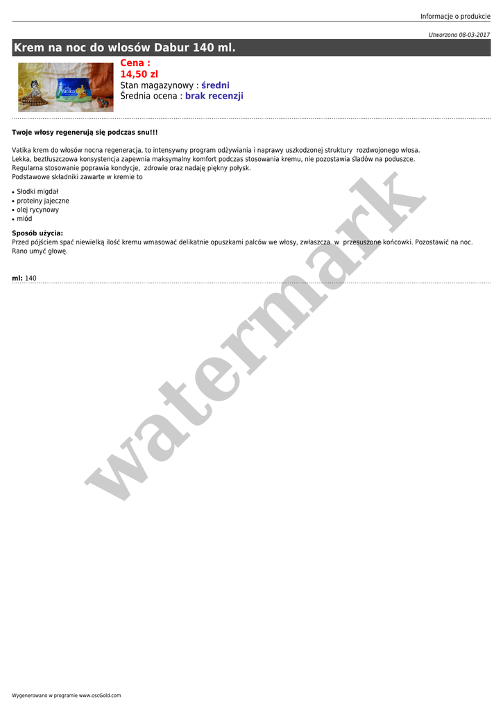 Informacje o produkcie Utworzono 08-03-2017 Krem na noc do wlosów Dabur 140 ml. Cena : 14,50 zl Stan magazynowy : średni Średnia ocena : brak recenzji Twoje włosy regenerują się podczas snu!!! Vatika krem do włosów nocna regeneracja, to intensywny program odżywiania i naprawy uszkodzonej struktury rozdwojonego włosa. Lekka, beztłuszczowa konsystencja zapewnia maksymalny komfort podczas stosowania kremu, nie pozostawia śladów na poduszce. Regularna stosowanie poprawia kondycje, zdrowie oraz nadaję piękny połysk. Podstawowe składniki zawarte w kremie to ● ● ● Słodki migdał proteiny jajeczne olej rycynowy miód er m ar k ● Sposób użycia: Przed pójściem spać niewielką ilość kremu wmasować delikatnie opuszkami palców we włosy, zwłaszcza w przesuszone końcowki. Pozostawić na noc. Rano umyć głowę. w at ml: 140 Wygenerowano w programie www.oscGold.com