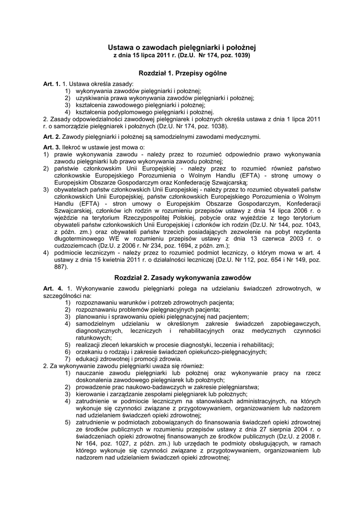 Ustawa o zawodach pielęgniarki i połoŜnej z dnia 15 lipca 2011 r. (Dz.U. Nr 174, poz. 1039) Rozdział 1. Przepisy ogólne Art. 1. 1. Ustawa określa zasady: 1) wykonywania zawodów pielęgniarki i połoŜnej; 2) uzyskiwania prawa wykonywania zawodów pielęgniarki i połoŜnej; 3) kształcenia zawodowego pielęgniarki i połoŜnej; 4) kształcenia podyplomowego pielęgniarki i połoŜnej. 2. Zasady odpowiedzialności zawodowej pielęgniarek i połoŜnych określa ustawa z dnia 1 lipca 2011 r. o samorządzie pielęgniarek i połoŜnych (Dz.U. Nr 174, poz. 1038). Art. 2. Zawody pielęgniarki i połoŜnej są samodzielnymi zawodami medycznymi. Art. 3. Ilekroć w ustawie jest mowa o: 1) prawie wykonywania zawodu - naleŜy przez to rozumieć odpowiednio prawo wykonywania zawodu pielęgniarki lub prawo wykonywania zawodu połoŜnej; 2) państwie członkowskim Unii Europejskiej - naleŜy przez to rozumieć równieŜ państwo członkowskie Europejskiego Porozumienia o Wolnym Handlu (EFTA) - stronę umowy o Europejskim Obszarze Gospodarczym oraz Konfederację Szwajcarską; 3) obywatelach państw członkowskich Unii Europejskiej - naleŜy przez to rozumieć obywateli państw członkowskich Unii Europejskiej, państw członkowskich Europejskiego Porozumienia o Wolnym Handlu (EFTA) - stron umowy o Europejskim Obszarze Gospodarczym, Konfederacji Szwajcarskiej, członków ich rodzin w rozumieniu przepisów ustawy z dnia 14 lipca 2006 r. o wjeździe na terytorium Rzeczypospolitej Polskiej, pobycie oraz wyjeździe z tego terytorium obywateli państw członkowskich Unii Europejskiej i członków ich rodzin (Dz.U. Nr 144, poz. 1043, z późn. zm.) oraz obywateli państw trzecich posiadających zezwolenie na pobyt rezydenta długoterminowego WE w rozumieniu przepisów ustawy z dnia 13 czerwca 2003 r. o cudzoziemcach (Dz.U. z 2006 r. Nr 234, poz. 1694, z późn. zm.); 4) podmiocie leczniczym - naleŜy przez to rozumieć podmiot leczniczy, o którym mowa w art. 4 ustawy z dnia 15 kwietnia 2011 r. o działalności leczniczej (Dz.U. Nr 112, poz. 654 i Nr 149, poz. 887). Rozdział 2. Zasady wykonywania zawodów Art. 4. 1. Wykonywanie zawodu pielęgniarki polega na udzielaniu świadczeń zdrowotnych, w szczególności na: 1) rozpoznawaniu warunków i potrzeb zdrowotnych pacjenta; 2) rozpoznawaniu problemów pielęgnacyjnych pacjenta; 3) planowaniu i sprawowaniu opieki pielęgnacyjnej nad pacjentem; 4) samodzielnym udzielaniu w określonym zakresie świadczeń zapobiegawczych, diagnostycznych, leczniczych i rehabilitacyjnych oraz medycznych czynności ratunkowych; 5) realizacji zleceń lekarskich w procesie diagnostyki, leczenia i rehabilitacji; 6) orzekaniu o rodzaju i zakresie świadczeń opiekuńczo-pielęgnacyjnych; 7) edukacji zdrowotnej i promocji zdrowia. 2. Za wykonywanie zawodu pielęgniarki uwaŜa się równieŜ: 1) nauczanie zawodu pielęgniarki lub połoŜnej oraz wykonywanie pracy na rzecz doskonalenia zawodowego pielęgniarek lub połoŜnych; 2) prowadzenie prac naukowo-badawczych w zakresie pielęgniarstwa; 3) kierowanie i zarządzanie zespołami pielęgniarek lub połoŜnych; 4) zatrudnienie w podmiocie leczniczym na stanowiskach administracyjnych, na których wykonuje się czynności związane z przygotowywaniem, organizowaniem lub nadzorem nad udzielaniem świadczeń opieki zdrowotnej; 5) zatrudnienie w podmiotach zobowiązanych do finansowania świadczeń opieki zdrowotnej ze środków publicznych w rozumieniu przepisów ustawy z dnia 27 sierpnia 2004 r. o świadczeniach opieki zdrowotnej finansowanych ze środków publicznych (Dz.U. z 2008 r. Nr 164, poz. 1027, z późn. zm.) lub urzędach te podmioty obsługujących, w ramach którego wykonuje się czynności związane z przygotowywaniem, organizowaniem lub nadzorem nad udzielaniem świadczeń opieki zdrowotnej; 6) zatrudnienie w organach administracji publicznej, których zakres działania obejmuje nadzór nad ochroną zdrowia; 7) pełnienie słuŜby na stanowiskach słuŜbowych w Inspektoracie Wojskowej SłuŜby Zdrowia i innych jednostkach organizacyjnych Sił Zbrojnych Rzeczypospolitej Polskiej, na których wykonuje się czynności związane z ochroną zdrowia i opieką zdrowotną; 8) pełnienie słuŜby na stanowiskach słuŜbowych w Centralnym Zarządzie SłuŜby Więziennej i innych stanowiskach SłuŜby Więziennej, na których wykonuje się czynności związane z przygotowywaniem, organizowaniem i nadzorem nad udzielaniem świadczeń opieki zdrowotnej przez podmiot leczniczy dla osób pozbawionych wolności; 9) zatrudnienie w domach pomocy społecznej określonych w przepisach o pomocy społecznej, z uwzględnieniem uprawnień zawodowych pielęgniarki określonych w ustawie; 10) zatrudnienie na stanowisku pielęgniarki w Ŝłobku lub klubie dziecięcym, o których mowa w ustawie z dnia 4 lutego 2011 r. o opiece nad dziećmi w wieku do lat 3 (Dz.U. Nr 45, poz. 235, Nr 131, poz. 764 i Nr 171, poz. 1016); 11) sprawowanie funkcji z wyboru w organach samorządu pielęgniarek i połoŜnych lub wykonywanie pracy na rzecz samorządu; 12) powołanie do pełnienia z wyboru funkcji związkowej poza zakładem pracy pielęgniarki, jeŜeli z wyboru wynika obowiązek wykonywania tej funkcji w charakterze pracownika, albo pełnienie funkcji w zarządzie zakładowej organizacji związkowej, jeŜeli z pełnieniem tej funkcji jest związane zwolnienie z obowiązku świadczenia pracy. Art. 5. 1. Wykonywanie zawodu połoŜnej polega na udzielaniu świadczeń zdrowotnych, w szczególności na: 1) rozpoznawaniu ciąŜy, sprawowaniu opieki nad kobietą w przebiegu ciąŜy fizjologicznej, a takŜe prowadzeniu w określonym zakresie badań niezbędnych w monitorowaniu ciąŜy fizjologicznej; 2) kierowaniu na badania konieczne do jak najwcześniejszego rozpoznania ciąŜy wysokiego ryzyka; 3) prowadzeniu porodu fizjologicznego oraz monitorowaniu płodu z wykorzystaniem aparatury medycznej; 4) przyjmowaniu porodów naturalnych, w przypadku konieczności tak