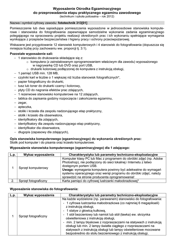 Wyposażenie Ośrodka Egzaminacyjnego do przeprowadzenia etapu praktycznego egzaminu zawodowego (technikum i szkoła policealna – rok 2012) Nazwa i symbol cyfrowy zawodu: fototechnik 313[01] Pomieszczenie lub dwa sąsiadujące pomieszczenia wyposażone w jednoosobowe stanowiska komputerowe i stanowiska do fotografowania zapewniające samodzielne wykonanie zadania egzaminacyjnego polegającego na opracowaniu projektu realizacji określonych prac i ich wykonaniu spełniające wymagania wynikające z przepisów bezpieczeństwa i higieny pracy i ochrony przeciwpożarowej. Wskazane jest przygotowanie 12 stanowisk komputerowych i 4 stanowisk do fotografowania (dopuszcza się mniejsza liczbę przy zachowaniu ww. proporcji tj. 3:1). Pozostałe wyposażenie sali: − 1 stanowisko do drukowania składające się z: o komputera (z zainstalowanym oprogramowaniem właściwym dla zawodu) wyposażonego w nagrywarkę CD lub DVD oraz port USB, o drukarki kolorowej podłączonej do komputera z instrukcją obsługi, − 1 pamięć USB min. 128 MB, − czytniki kart w liczbie o 1 większej niż liczba stanowisk fotograficznych*, − papier fotograficzny do drukarki, − tusz lub toner do drukarki czarny i kolorowy, − płyty CD do nagrania efektów prac zdających, − 1 rezerwowe stanowisko komputerowe na 12 zdających, − tablica do zapisania godziny rozpoczęcia i zakończenia egzaminu, − zegar, − apteczka, − stoliki i krzesła dla zespołu nadzorującego etap praktyczny, − stolik i krzesło dla obserwatora, − identyfikatory dla zdających, − identyfikatory dla zespołu nadzorującego etap praktyczny, − identyfikator dla obserwatora, − długopis (zapasowy dla zdających), Opis stanowiska komputerowego (egzaminacyjnego) do wykonania określonych prac: Stolik pod komputer i do pisania oraz krzesło komputerowe. Wyposażenie stanowiska komputerowego (egzaminacyjnego) dla 1 zdającego: L.p. Wykaz wyposażenia 1 Sprzęt komputerowy 2. Sprzęt fotograficzny Charakterystyka lub parametry techniczno-eksploatacyjne Komputer klasy PC lub Mac z programem do obróbki zdjęć (np. Adobe Photoshop), nie podłączony do sieci lokalnej i Internetu z łatwo dostępnym portem USB. Uwaga: wymagania komputera powinny być adekwatne do wymagań systemu operacyjnego oraz wersji programu do obróbki zdjęć, należy sprawdzić na stronie producenta oprogramowania! Karta pamięci do cyfrowej lustrzanki małoobrazkowej* Wyposażenie stanowiska do fotografowania: L.p. 1 Wykaz wyposażenia Sprzęt fotograficzny Charakterystyka lub parametry techniczno-eksploatacyjne Na każde wydzielone (np. parawanem) stanowisko do fotografowania: - 1 cyfrowa lustrzanka małoobrazkowa (co najmniej 6 megapikseli) z instrukcją obsługi, - 1 statyw z głowicą kulkową, - 1 stół bezcieniowy lub namiot lub stół (ławka) ew. skrzynka oświetleniowa z instrukcją obsługi, - min. 2 lampy błyskowe z rozpraszaczami na statywach z instrukcją obsługi lub min. 2 lampy światła ciągłego z rozpraszaczami na statywach z instrukcją obsługi lub lampy oświetleniowe mocowane bezpośrednio do stołu bezcieniowego z instrukcją obsługi, - 1 światłomierz do światła ciągłego i błyskowego z instrukcją obsługi, - 1 szara skala tonalna, - tła papierowe lub z materiału.