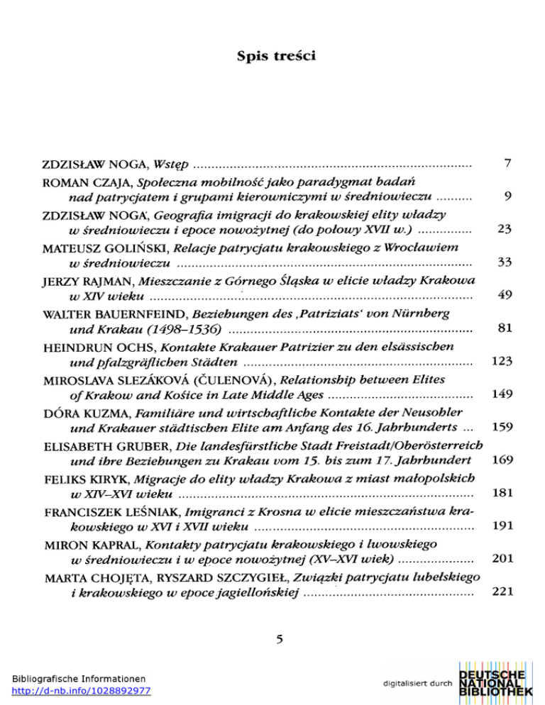 Spis treści ZDZISŁAW NOGA, Wstęp 7 ROMAN CZAJA, Społeczna mobilność j a k o p a r a d y g m a t b a d a ń n a d p a t r y c j a t e m i g r u p a m i k i e r o w n i c z y m i w średniowieczu 9 ZDZISŁAW NOGA, Geografia imigracji d o k r a k o w s k i e j elity w ł a d z y w średniowieczu i epoce n o w o ż y t n e j ( d o p o l o w y XVII w.) 23 MATEUSZ GOLIŃSKI, Relacje p a t r y c j a t u krakowskiego z Wrocławiem w średniowieczu 33 JERZY RAJMAN, Mieszczanie z Górnego Śląska w elicie w ł a d z y K r a k o w a w XIVwieku 49 WALTER BAUERNFEIND, Beziehungen d e s ,Patriziats' v o n Nurnberg u n d K r a k a u (1498-1536) 81 HEINDRUN OCHS, K o n t a k t e K r a k a u e r Patrizier z u d e n elsassischen undpfalzgraflichen Stadten 123 MIROSLAYA SLEZAKOVA (ĆULENOVA), Relationship between Elites o f K r a k ó w a n d Kośice i n Late Mi ddl e Ages 149 DÓRA KUZMA, Familiare u n d wirtschaftliche K o n t a k t e d e r Neusohler u n d K r a k a u e r stadtischen Elitę a m A n f a n g d e s 16. J a h r h u n d e r t s ... 159 ELISABETH GRUBER, D i e landesfiirstliche S t a d t Freistadt/Oberósterreich u n d ihre Beziehungen z u K r a k a u v o m 15- bis z u m 17. J a h r h u n d e r t 169 FELIKS K3RYK, Migracje d o elity w ł a d z y K r a k o w a z m i a s t małopolskich w XJV-XVI w i e k u 181 FRANCISZEK LEŚNIAK, Imigranci z Krosna w elicie mieszczaństwa kra kowskiego w XVI i XVII w i e k u 191 MIRON KAPRAL, K o n t a k t y p a t r y c j a t u krakowskiego i lwowskiego w średniowieczu i w epoce n o w o ż y t n e j (XV-XVI wiek) 201 MARTA CHOJĘTA, RYSZARD SZCZYGIEŁ, Z w i ą z k i p a t r y c j a t u lubelskiego i krakowskiego w epoce jagiellońskiej 221 5 http://d-nb.info/1028892977 Spis treści STEFAN ROHDEWALD, A n d e r Ostgrenze d e s Patriziats. Kulturelle Praktiken burgerlicher Eliten d e r ruthenischen Grenzstadt Polock u n d d e r Metropole K r a k a u i m Vergleich 233 KAMILA FOLLPRECHT, Włosi w elicie politycznej K r a k o w a d o p o ł o w y XVII wieku. Topografia siedzib 251 WALDEMAR KOMOROWSKI, Rezydencje patrycjuszy k r a k o w s k i c h d o p o ł o w y XVII w i e k u 267 BOGUSŁAW KRASNOWOLSKI, M o d a w ł o s k a i norymberska w ś r ó d ełity krakowskiej XV-XVI w i e k u 289 JAN-ANDREA BERNHARD, Geistige u n d literarische K o n t a k t e z w i s c h e n K r a k a u u n d Basel i n d e r ersten Halfte d e s 16. J a h r h u n d e r t s 303 MARCIN STARZYŃSKI, Patrycjat k r a k o w s k i w a k t a c h K a m e r y Papieskiej z XIV wieku. (Ze s t u d i ó w n a d u d z i a ł e m k u p i e c t w a krakowskiego w m i ę d z y n a r o d o w y m transferze finansów) 333 MARTIN MUSILEK, Der A u f s t a n d v o n Wiener, K r a k a u e r u n d Prager Burgern. Die E n t w i c k ł u n g d e r Stadteliten z u A n f a n g d e s 14. J a h r h u n d e r t s 379 OLGA FEJTOVA, Vergleich d e r Prager u n d K r a k a u e r stadtischen Eliten i n d e r f r i i h e n Neuzeit 401 URSZULA SOWINA, KAZIMIERZ PACUSKI, Testamenty m i e s z c z a n krakowskich j a k o ź r ó d ł a d o b a d a ń n a d s t r o n a m i r o d z i n n y m i i m ig r a n tó w w k r a k o w s k i e j elicie władzy. (Przykład J a n a z Reguł n a Mazowszu) 433 KATERINAJIŚOVA, D i e Testamente d e r Elitę v o n K r a k a u u n d Prag i m Spatmittelalter 447 Wykaż skrótów 460 Noty o Autorach 461