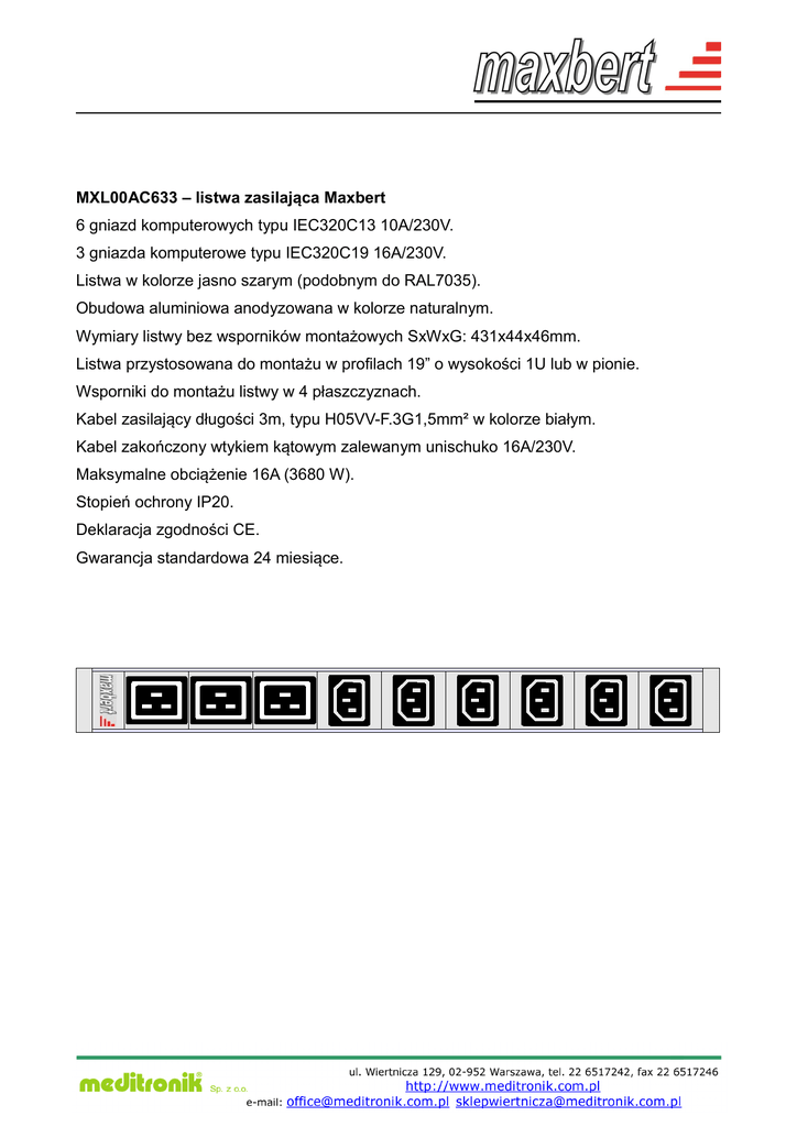 MXL00AC633 – listwa zasilająca Maxbert 6 gniazd komputerowych typu IEC320C13 10A/230V. 3 gniazda komputerowe typu IEC320C19 16A/230V. Listwa w kolorze jasno szarym (podobnym do RAL7035). Obudowa aluminiowa anodyzowana w kolorze naturalnym. Wymiary listwy bez wsporników montażowych SxWxG: 431x44x46mm. Listwa przystosowana do montażu w profilach 19” o wysokości 1U lub w pionie. Wsporniki do montażu listwy w 4 płaszczyznach. Kabel zasilający długości 3m, typu H05VV-F.3G1,5mm² w kolorze białym. Kabel zakończony wtykiem kątowym zalewanym unischuko 16A/230V. Maksymalne obciążenie 16A (3680 W). Stopień ochrony IP20. Deklaracja zgodności CE. Gwarancja standardowa 24 miesiące.