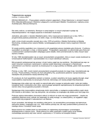 solomonstarnews.com Tajemnicza wyspa Czwartek, 14 sierpnia 2008 r. DROGA REDAKCJO – Przeczytałem ostatnio artykuł o gigantach z Wysp Salomona i o ukrytych bazach NOLi (Niezidentyfikowanych Obiektów Latających) w prowincjach Malaita i Guadalcanal, napisany przez Australijczyka, Mariusa Boirayona. Dla wielu osób to, co twierdził p. Boirayon w swej książce i w swych artykułach wydaje się nieprawdopodobne i nie mające poparcia w dowodach naukowych. Jednakże, jako jeden z niewielu Malaitańczyków, który rozpoczął swe badania już w roku 1979, z przyjemnością spieszę potwierdzić, że wiele z tego, co mówi Boirayon jest prawdą. Jeśli o mnie chodzi wszystko zaczęło się w roku 1979 od podróży z Malaity Zachodniej na Malaitę Wschodnią, wiodącej przez wyżyny Malaity i przebiegającej przez obszar zwany wzgórzem Kolovrat (Alasa’a). W czasie podróży spędziłem noc z krewnymi w ich pogańskiej wiosce niedaleko góry Kolovrat. O północy wyszedłem na zewnątrz z chaty, w której spałem. Przypadkiem spojrzałem na wierzchołek góry Kolovrat i z zaskoczeniem zaobserwowałem oślepiająco jasne światło, które promieniowało ku niebu niczym laser wprost z krateru. W roku 1980 skontaktowałem się ze swym amerykańskim przyjacielem, który w owym czasie studiował na Uniwersytecie Kalifornijskim i opowiedziałem mu o swym sekretnym odkryciu. Mój przyjaciel zainteresował się sprawą i chciał, byśmy zajęli się nią osobiście. Skontaktował się więc ze swym kuzynem (czołowym naukowcem z zakresu optyki laserowej), pracującym w Narodowym Laboratorium Los Alamos i poprosił, by towarzyszył mu w jego podróży na Malaitę, gdzie mieli się spotkać ze mną. Później, w roku 1981, moich dwóch amerykańskich przyjaciół przybyło do mego kraju i skontaktowało się ze mną. Przed podróżą z Honiary do Auki zakupiliśmy liny, puszkowane jedzenie i sprzęt biwakowy, niezbędne dla powodzenia naszej sekretnej misji. Po przybyciu do Auki spędziliśmy tydzień w mieście, a potem weszliśmy do buszu (gęstej dżungli), skąd rozpoczęliśmy wspinaczkę na szczyt góry Kolovrat, stanowiący cel naszej potajemnej ekspedycji. Następnego dnia udało nam się wejść na wierzchołek góry (uwaga na jadowite węże i ostre jak żyletka krawędzie skał) i rozłożyliśmy tam obóz, wykorzystując specjalnie zaprojektowany do ekspedycji górskich namiot, który moi przyjaciele przywieźli z Ameryki. Następnego dnia rozpoczęliśmy eksplorację okolic wierzchołka, a następnie postanowiliśmy zejść około 200 metrów w dół krateru i tam się zatrzymać, nie schodząc na znajdujące się daleko pod nami jego dno. Podczas zejścia dokonaliśmy doniosłych odkryć (o których na razie nie mogę opowiedzieć – dopóki nie nadejdzie właściwa pora), jednak nie zabierając ze sobą niczego, co zobaczyliśmy, za wyjątkiem zdjęć, które zrobił mój przyjaciel z Laboratorium Los Alamos. Innym powodem, dla którego nie zeszliśmy niżej jest to, że zauważyliśmy poruszające się tajemnicze olbrzymie obiekty, znajdujące się o ok. 1000 metrów poniżej nas, tak więc postanowiliśmy powrócić do naszego obozu i rozważyć nasze opcje. Nasza trzecia noc (ostatni dzień na wierzchołku) to najbardziej zdumiewające i przerażające doświadczenie w naszym życiu. Około północy ku niebu wystrzelił z krateru jasny snop światła, rozświetlając jasnością cały nasz namiot, usytuowany o 10 metrów od krawędzi krateru. http://solomonstarnews.com Generated: 3 November, 2008, 00:21 solomonstarnews.com Cała nasza trójka obudziła się, nie mogąc wykrztusić słowa, sparaliżowana i przyklejona do materacy bez możliwości poruszenia jakąkolwiek kończyną; mogliśmy poruszać jedynie oczami i przez następnych 30 minut obserwowaliśmy, co się dzieje wokół nas. Po trzydziestu minutach jasne światło i wszelkie ruchy wokół nas ustały i powróciła ciemność; dopiero wówczas mogliśmy znowu się poruszać i odzyskaliśmy mowę. Nadszedł ranek czwartego dnia i postanowiliśmy, że mamy dość przygody i że musimy powrócić do naszego cywilizowanego świata. O zmierzchu powróciliśmy do Auki i przedyskutowaliśmy wyniki naszej tajnej misji. Cała nasza trójka zgodziła się nikomu nie wyjawiać naszego sekretnego odkrycia przez kolejne 30 lat (1981-2011), dopóki nie przeprowadzimy dodatkowych badań, związanych z tymi tajemnicami. Dlatego też na tym etapie nie mogę odkryć, co udało nam się odnaleźć, chciałem jedynie opublikować niniejszy list jako dodatkowy dowód, potwierdzający badania pana Mariusa Boirayona. Nie wstydzę się jednak tego, że opowiadam o tej dobrze strzeżonej tajemnicy mej młodości i pragnę powiedzieć wszystkim, którzy przeczytają ten list, że prowincja Malaita to naprawdę niezwykle wyjątkowa i tajemnicza wyspa, gdzie pod ziemią ukryte są olbrzymie bezcenne skarby. James Baura Auki Prowincja Malaita http://solomonstarnews.com Generated: 3 November, 2008, 00:21