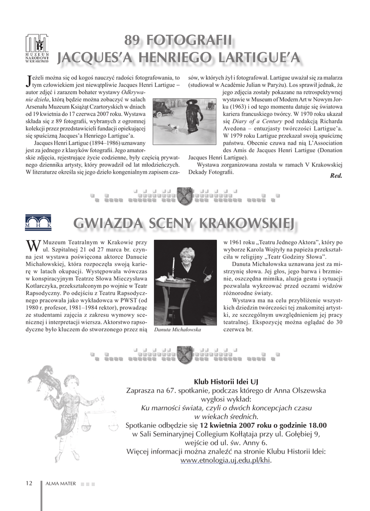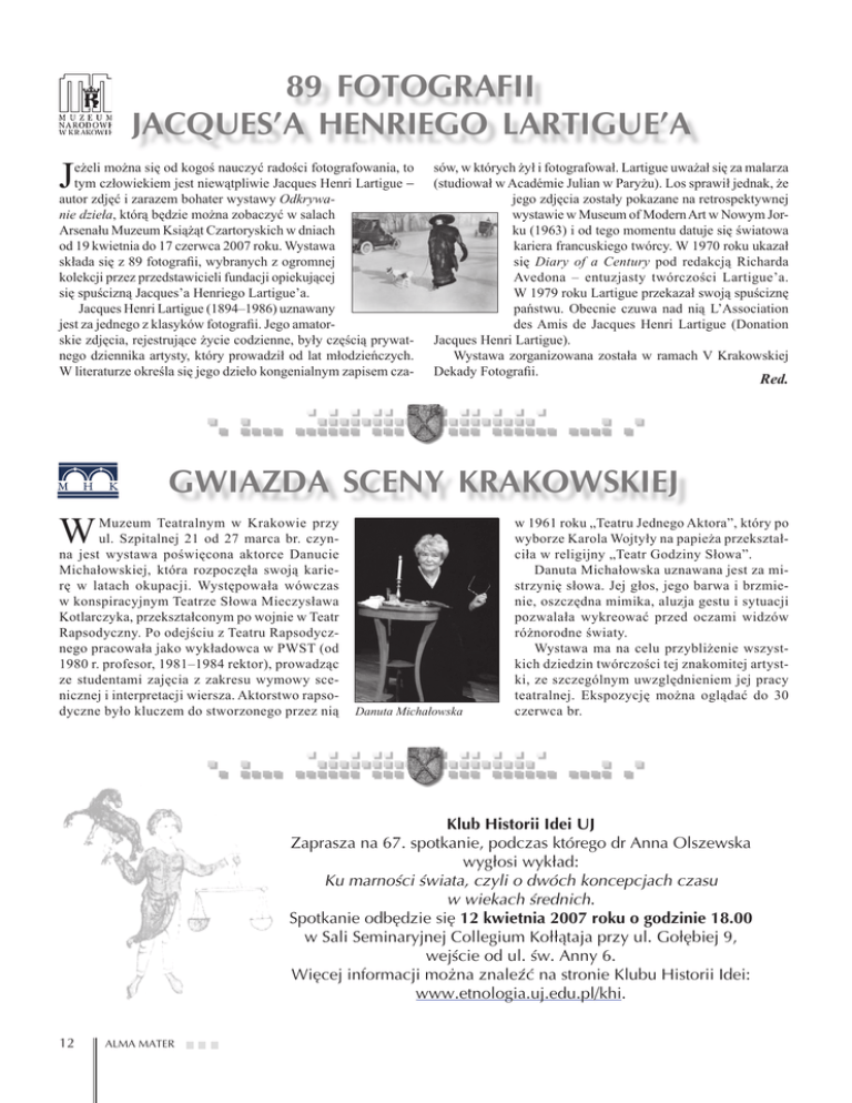 89 FOTOGRAFII JACQUES’A HENRIEGO LARTIGUE’A J eżeli można się od kogoś nauczyć radości fotografowania, to tym człowiekiem jest niewątpliwie Jacques Henri Lartigue − autor zdjęć i zarazem bohater wystawy Odkrywanie dzieła, którą będzie można zobaczyć w salach Arsenału Muzeum Książąt Czartoryskich w dniach od 19 kwietnia do 17 czerwca 2007 roku. Wystawa składa się z 89 fotografii, wybranych z ogromnej kolekcji przez przedstawicieli fundacji opiekującej się spuścizną Jacques’a Henriego Lartigue’a. Jacques Henri Lartigue (1894–1986) uznawany jest za jednego z klasyków fotografii. Jego amatorskie zdjęcia, rejestrujące życie codzienne, były częścią prywatnego dziennika artysty, który prowadził od lat młodzieńczych. W literaturze określa się jego dzieło kongenialnym zapisem cza- sów, w których żył i fotografował. Lartigue uważał się za malarza (studiował w Académie Julian w Paryżu). Los sprawił jednak, że jego zdjęcia zostały pokazane na retrospektywnej wystawie w Museum of Modern Art w Nowym Jorku (1963) i od tego momentu datuje się światowa kariera francuskiego twórcy. W 1970 roku ukazał się Diary of a Century pod redakcją Richarda Avedona – entuzjasty twórczości Lartigue’a. W 1979 roku Lartigue przekazał swoją spuściznę państwu. Obecnie czuwa nad nią L’Association des Amis de Jacques Henri Lartigue (Donation Jacques Henri Lartigue). Wystawa zorganizowana została w ramach V Krakowskiej Dekady Fotografii. Red. GWIAZDA SCENY KRAKOWSKIEJ W Muzeum Teatralnym w Krakowie przy ul. Szpitalnej 21 od 27 marca br. czynna jest wystawa poświęcona aktorce Danucie Michałowskiej, która rozpoczęła swoją karierę w latach okupacji. Występowała wówczas w konspiracyjnym Teatrze Słowa Mieczysława Kotlarczyka, przekształconym po wojnie w Teatr Rapsodyczny. Po odejściu z Teatru Rapsodycznego pracowała jako wykładowca w PWST (od 1980 r. profesor, 1981–1984 rektor), prowadząc ze studentami zajęcia z zakresu wymowy scenicznej i interpretacji wiersza. Aktorstwo rapsodyczne było kluczem do stworzonego przez nią Danuta Michałowska w 1961 roku „Teatru Jednego Aktora”, który po wyborze Karola Wojtyły na papieża przekształciła w religijny „Teatr Godziny Słowa”. Danuta Michałowska uznawana jest za mistrzynię słowa. Jej głos, jego barwa i brzmienie, oszczędna mimika, aluzja gestu i sytuacji pozwalała wykreować przed oczami widzów różnorodne światy. Wystawa ma na celu przybliżenie wszystkich dziedzin twórczości tej znakomitej artystki, ze szczególnym uwzględnieniem jej pracy teatralnej. Ekspozycję można oglądać do 30 czerwca br. Klub Historii Idei UJ Zaprasza na 67. spotkanie, podczas którego dr Anna Olszewska wygłosi wykład: Ku marności świata, czyli o dwóch koncepcjach czasu w wiekach średnich. Spotkanie odbędzie się 12 kwietnia 2007 roku o godzinie 18.00 w Sali Seminaryjnej Collegium Kołłątaja przy ul. Gołębiej 9, wejście od ul. św. Anny 6. Więcej informacji można znaleźć na stronie Klubu Historii Idei: www.etnologia.uj.edu.pl/khi. 12 ALMA MATER