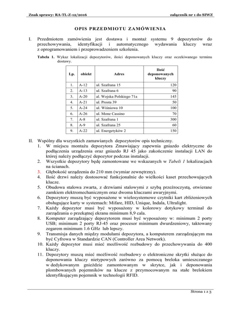 Znak sprawy: RA-TL-Z-12/2016 załącznik nr 1 do SIWZ OPIS PRZEDMIOTU ZAMÓWIENIA I. Przedmiotem zamówienia jest dostawa i montaż systemu 9 depozytorów do przechowywania, identyfikacji i automatycznego wydawania kluczy wraz z oprogramowaniem i przeprowadzeniem szkolenia. Tabela 1. Wykaz lokalizacji depozytorów, ilości deponowanych kluczy oraz oczekiwanego terminu dostawy. Lp. obiekt Adres Ilość deponowanych kluczy 1. A-12 ul. Szafrana 15 120 2. A-13 ul. Szafrana 6 90 3. A-20 al. Wojska Polskiego 71a 4. A-21 ul. Prosta 39 5. A-24 ul. Wiśniowa 10 100 6. A-26 ul. Mone Cassino 70 7. A-8 ul. Szafrana 1 300 8. A-9 ul. Szafrana 25 60 9. A-22 ul. Energetyków 2 145 50 150 II. Wspólny dla wszystkich zamawianych depozytorów opis techniczny. 1. W miejscu montażu depozytora Zmawiający zapewnia gniazdo elektryczne do podłączenia urządzenia oraz gniazdo RJ 45 jako zakończenie instalacji LAN do której należy podłączyć depozytor podczas instalacji. 2. Wszystkie depozytory będę zamontowane we wskazanych w Tabeli 1 lokalizacjach na ścianach. 3. Głębokość urządzenia do 210 mm (wymiar zewnętrzny). 4. Ilość drzwi należy dostosować funkcjonalnie do wielkości kaset przechowujących klucze. 5. Obudowa stalowa zwarta, z drzwiami stalowymi z szybą przeźroczystą, otwierane zamkiem elektromechanicznym oraz dwoma kluczami awaryjnymi. 6. Depozytory muszą być wyposażone w wielosystemowe czytniki kart zbliżeniowych obsługujące karty w systemach: Mifare, HID, Unique, Indala, Ultralight. 7. Każdy depozytor musi być wyposażony w kolorowy dotykowy terminal do zarządzania o przekątnej ekranu minimum 8,9 cala. 8. Komputer zarządzający depozytorem musi być wyposażony w: minimum 2 porty USB; minimum 2 porty RJ-45 oraz procesor minimum dwurdzeniowy, taktowany zegarem minimum 1.6 GHz lub lepszy. 9. Transmisja danych między modułami depozytora, a komputerem zarządzającym ma być Cyfrowa w Standardzie CAN (Controller Area Network). 10. Każdy depozytor musi mieć możliwość rozbudowy do przechowywania do 400 kluczy. 11. Depozytory muszą mieć możliwość rozbudowy o elektroniczne skrytki służące do deponowania kluczy nietypowych zarówno za pomocą breloka umieszczanego w dedykowanym gnieździe zamontowanym w skrytce, jak i deponowania plombowanych pojemników na klucze z przymocowanym na stałe brelokiem identyfikującym pojemnik w technologii RFID. Strona 1 z 3 Znak sprawy: RA-TL-Z-12/2016 załącznik nr 1 do SIWZ 12. Depozytory muszą zapewniać możliwość pobrania przynajmniej 10 kluczy podczas jednej autoryzacji. 13. Depozytory muszą dokonywać pełnej identyfikacji oraz blokować zdeponowany klucz kodowy w gnieździe depozytora. 14. Brelok RFID musi być wykonany przynajmniej w 80% z metalu w powłoce z chromu lub innego metalu na wysoki połysk. 15. Maksymalny wymiar Breloków RFID: 5,5cm x 1,5cm x 1,5cm. 16. Breloki RFiD nie mogą posiadać ostrych krawędzi. 17. Depozytory muszą zapewniać możliwość zwrotu kluczy przy użyciu breloka RFID. 18. Klucze w depozytorze kluczy muszą być: 1) deponowane w gniazdach; 2) zabezpieczone przed nieuprawnionym pobraniem bezstykową kontrolą klucza wykorzystująca technologię RFID. 19. Autoryzacja przy pomocy: karta + PIN, karta, PIN. 20. Dostęp użytkowników tylko do wybranych kluczy w zależności od uprawnień. 21. Po uprzedniej autoryzacji przez użytkownika, terminal sterujący depozytora (dotykowy panel LCD) musi wyświetlać tylko nazwy kluczy, do których dany użytkownik posiada dostęp. 22. Dostarczane depozytory kluczy muszą posiadać możliwość stworzenia systemu depozytorów. Dostarczany system depozytorów musi mieć możliwość pełnego włączenia funkcjonalnego do swojej struktury użytkowanych w chwili obecnej przez Zamawiającego depozytorów SafeKey 50 (2 szt.), SafeKey 70 (szt.1). Depozytory kluczy powinny być połączone ze sobą za pośrednictwem sieci LAN. Przez sformułowanie „System depozytorów” zamawiający rozumie depozytory, które za pomocą sieci będą się ze sobą komunikowały, dając możliwość sprawdzenia dostępności kluczy znajdujących się również w innych depozytorach. System będzie rejestrował jeden raport zdarzeń, z możliwością kontroli za pośrednictwem któregokolwiek depozytora. System depozytorów musi umożliwiać deponowanie w depozytorze kluczy pobranych z innego depozytora. 23. System depozytorów musi posiadać możliwość nadawania dowolnych, wielopoziomowych uprawnień dostępu do funkcji depozytora zarówno z poziomu dotykowego terminala LCD umieszczonego w depozytorze jak również z poziomu aplikacji webowej (podgląd zdarzeń, nadawanie uprawnień do kluczy, tworzenie okien czasowych, zarządzanie ściśle określoną ilością kluczy/użytkowników itp.). 24. System depozytorów musi posiadać możliwość przydzielania uprawnień do kluczy pozwalające użytkownikowi/grupie na pobranie przypisanych kluczy, w określonym czasie (zapewniając minimum 20 różnych okien czasowych). 25. System depozytorów musi posiadać możliwość rezerwacji kluczy. 26. Dostarczane depozytory muszą umożliwiać administratorowi wybór jednej z przynajmniej dwóch metod zwrotu klucza wymienionych poniżej: 1) włożenia klucza do pierwszego wolnego gniazda (funkcja dowolnego zwrotu klucza w dowolne gniazdo); 2) włożenie klucza do konkretnie wskazanego i podświetlonego gniazda. Zapewniając system mieszany. 27. Dostarczane depozytory muszą umożliwiać administratorowi wybór systemu mieszanego zwrotu klucza opartego na metodach opisanych wyżej. 28. Klucze przeznaczone do deponowania w depozytorze mają być przyczepiane do breloka RFID za pomocą stalowej kłódki z indywidualnym numerem seryjnym i kodem kreskowym. 29. Dostarczane depozytory oraz aplikacja webowa muszą być w języku polskim. Strona 2 z 3 Znak sprawy: RA-TL-Z-12/2016 załącznik nr 1 do SIWZ 30. W przypadku braku zasilania depozytory muszą posiadać możliwość mechaniczneg