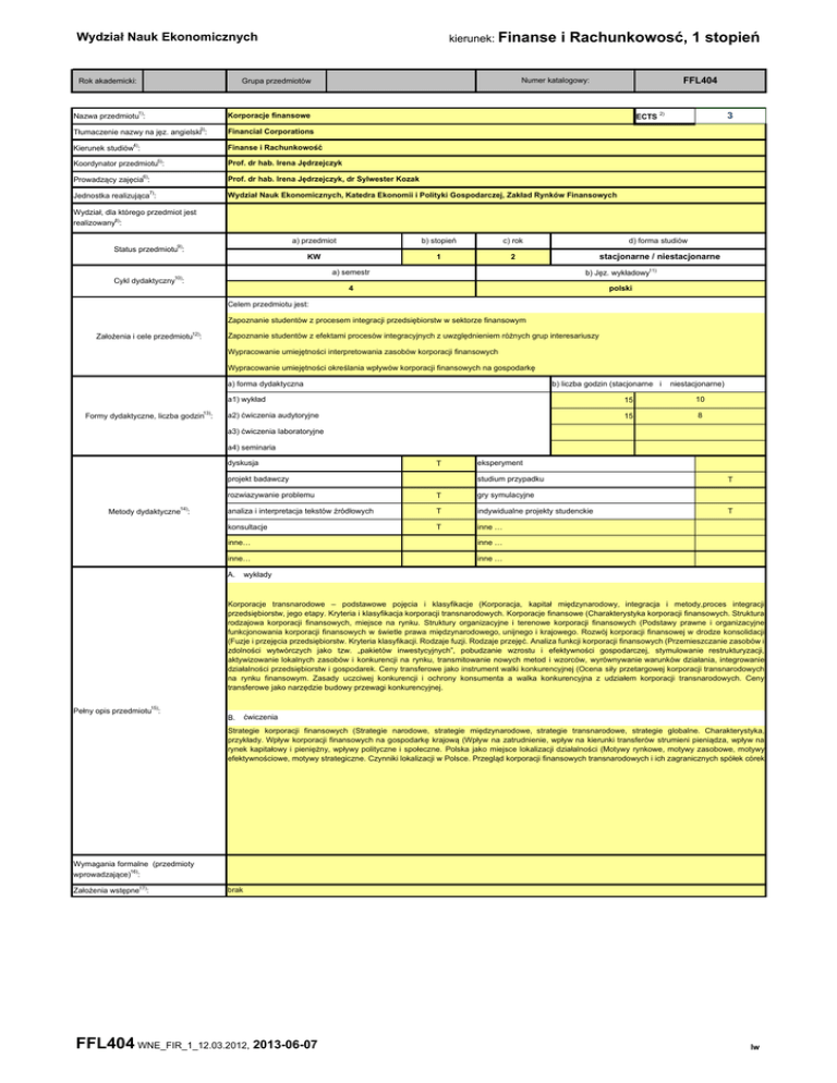 kierunek: Finanse Wydział Nauk Ekonomicznych Rok akademicki: FFL404 Numer katalogowy: Grupa przedmiotów Nazwa przedmiotu1): i Rachunkowosć, 1 stopień 3 ECTS 2) Korporacje finansowe 3) Tłumaczenie nazwy na jęz. angielski : Financial Corporations Kierunek studiów4): Finanse i Rachunkowość Koordynator przedmiotu5): Prof. dr hab. Irena Jędrzejczyk Prowadzący zajęcia6): Prof. dr hab. Irena Jędrzejczyk, dr Sylwester Kozak Jednostka realizująca7): Wydział Nauk Ekonomicznych, Katedra Ekonomii i Polityki Gospodarczej, Zakład Rynków Finansowych Wydział, dla którego przedmiot jest realizowany8): Status przedmiotu9): a) przedmiot b) stopień c) rok d) forma studiów KW 1 2 stacjonarne / niestacjonarne Cykl dydaktyczny10): a) semestr b) Jęz. wykładowy11) 4 polski Celem przedmiotu jest: Zapoznanie studentów z procesem integracji przedsiębiorstw w sektorze finansowym Założenia i cele przedmiotu12): Zapoznanie studentów z efektami procesów integracyjnych z uwzględnieniem różnych grup interesariuszy Wypracowanie umiejętności interpretowania zasobów korporacji finansowych Wypracowanie umiejętności określania wpływów korporacji finansowych na gospodarkę a) forma dydaktyczna Formy dydaktyczne, liczba godzin13): b) liczba godzin (stacjonarne i niestacjonarne) a1) wykład 15 10 a2) ćwiczenia audytoryjne 15 8 a3) ćwiczenia laboratoryjne a4) seminaria dyskusja T projekt badawczy Metody dydaktyczne14): eksperyment studium przypadku rozwiazywanie problemu T gry symulacyjne analiza i interpretacja tekstów źródłowych T indywidualne projekty studenckie T inne … konsultacje inne… inne … inne… inne … A. T T wykłady Korporacje transnarodowe – podstawowe pojęcia i klasyfikacje (Korporacja, kapitał międzynarodowy, integracja i metody,proces integracji przedsiębiorstw, jego etapy. Kryteria i klasyfikacja korporacji transnarodowych. Korporacje finansowe (Charakterystyka korporacji finansowych. Struktura rodzajowa korporacji finansowych, miejsce na rynku. Struktury organizacyjne i terenowe korporacji finansowych (Podstawy prawne i organizacyjne funkcjonowania korporacji finansowych w świetle prawa międzynarodowego, unijnego i krajowego. Rozwój korporacji finansowej w drodze konsolidacji (Fuzje i przejęcia przedsiębiorstw. Kryteria klasyfikacji. Rodzaje fuzji. Rodzaje przejęć. Analiza funkcji korporacji finansowych (Przemieszczanie zasobów i zdolności wytwórczych jako tzw. „pakietów inwestycyjnych”, pobudzanie wzrostu i efektywności gospodarczej, stymulowanie restrukturyzacji, aktywizowanie lokalnych zasobów i konkurencji na rynku, transmitowanie nowych metod i wzorców, wyrównywanie warunków działania, integrowanie działalności przedsiębiorstw i gospodarek. Ceny transferowe jako instrument walki konkurencyjnej (Ocena siły przetargowej korporacji transnarodowych na rynku finansowym. Zasady uczciwej konkurencji i ochrony konsumenta a walka konkurencyjna z udziałem korporacji transnarodowych. Ceny transferowe jako narzędzie budowy przewagi konkurencyjnej. Pełny opis przedmiotu15): B. ćwiczenia Strategie korporacji finansowych (Strategie narodowe, strategie międzynarodowe, strategie transnarodowe, strategie globalne. Charakterystyka, przykłady. Wpływ korporacji finansowych na gospodarkę krajową (Wpływ na zatrudnienie, wpływ na kierunki transferów strumieni pieniądza, wpływ na rynek kapitałowy i pieniężny, wpływy polityczne i społeczne. Polska jako miejsce lokalizacji działalności (Motywy rynkowe, motywy zasobowe, motywy efektywnościowe, motywy strategiczne. Czynniki lokalizacji w Polsce. Przegląd korporacji finansowych transnarodowych i ich zagranicznych spółek córek. Wymagania formalne (przedmioty wprowadzające)16): Założenia wstępne17): brak FFL404 WNE_FIR_1_12.03.2012, 2013-06-07 lw kierunek: Finanse Wydział Nauk Ekonomicznych Efekty kształcenia18): (z kolejnymi numerami, 01, 02, 03 itd.) 01 - Student potrafi zdefiniować proces integracji przedsiębiorstw w sektorze finansowym 05 - 02 -Student potrafi określić efekty procesów integracyjnych z uwzględnieniem różnych grup interesariuszy 06 - 03 - student zdobywa kompetencje w zakresie interpretowania zasobów instytucji finansowych 07 - 04 - student zdobywa kompetencje w zakresie wpływu korporacji finansowych na gospodarke krajową jak i światową 08 - kolokwium na zajęciach ćwiczeniowych ocena wykonanie zadania projektowego na zdefiniowany temat praca pisemna przygotowywana w ramach pracy własnej studenta 01,02,03,04 ocena eksperymentów wykonywanych w trakcie zajęć Sposób weryfikacji efektów kształcenia19): i Rachunkowosć, 1 stopień ocena wystąpień i prezentacji w trakcie zajęć ocena wynikająca z obserwacji w trakcie zajęć przygotowanie zespołowej analizy zdefiniowanego problemu 02,03,04 obserwacja w trakcie dyskusji zdefiniowanego problemu (aktywność) egzamin pisemny test komputerowy egzamin ustny inne.. inne… okresowe prace pisemne 01,02,03,04 imienne karty oceny studenta inne.. inne.. Waga w % Element oceny ocena wykonania zadania projektowego na zdefiniowany temat kolokwium na zajęciach ćwiczeniowych 25% Elementy i wagi mające wpływ na ocenę ocena eksperymentów wykonywanych w trakcie zajęć końcową21): ocena wystąpień i prezentacji w trakcie zajęć 01,02,03,04 treść pytań egzaminacyjnych z oceną inne… praca pisemna przygotowywana w ramach pracy własnej studenta 01,02,03,04 inne.. x Forma dokumentacji osiągniętych efektów złożone projekty kształcenia 20): inne… Element oceny 02,03 ocena wynikająca z obserwacji w trakcie zajęć przygotowanie zespołowej analizy zdefiniowanego problemu 25% obserwacja w trakcie dyskusji zdefiniowanego problemu (aktywność) egzamin pisemny test egzamin ustny inne.. inne… inne.. Waga w % 10% 10% 20% 10% sala dydaktyczna Miejsce realizacji zajęć22): 23) Literatura podstawowa i uzupełniająca : a) podstawowa 1. Iwanicz-Drozdowskiej M. red. naukową 2007. Korporacje