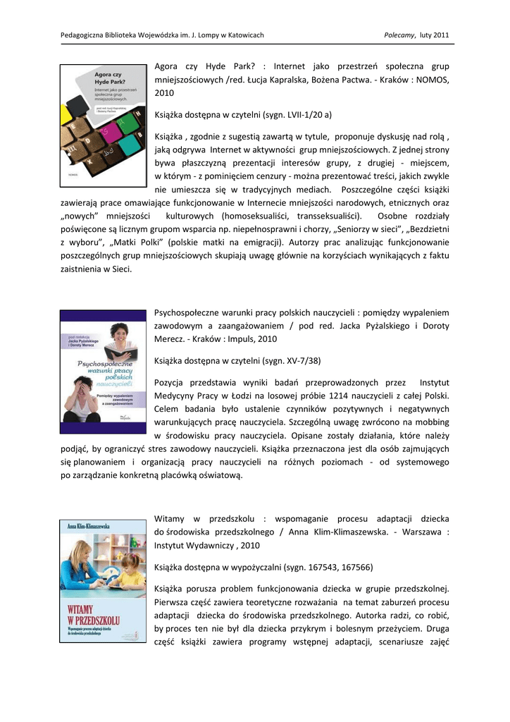 Pedagogiczna Biblioteka Wojewódzka im. J. Lompy w Katowicach Polecamy, luty 2011 Agora czy Hyde Park? : Internet jako przestrzeń społeczna grup mniejszościowych /red. Łucja Kapralska, Bożena Pactwa. - Kraków : NOMOS, 2010 Książka dostępna w czytelni (sygn. LVII-1/20 a) Książka , zgodnie z sugestią zawartą w tytule, proponuje dyskusję nad rolą , jaką odgrywa Internet w aktywności grup mniejszościowych. Z jednej strony bywa płaszczyzną prezentacji interesów grupy, z drugiej - miejscem, w którym - z pominięciem cenzury - można prezentować treści, jakich zwykle nie umieszcza się w tradycyjnych mediach. Poszczególne części książki zawierają prace omawiające funkcjonowanie w Internecie mniejszości narodowych, etnicznych oraz „nowych” mniejszości kulturowych (homoseksualiści, transseksualiści). Osobne rozdziały poświęcone są licznym grupom wsparcia np. niepełnosprawni i chorzy, „Seniorzy w sieci”, „Bezdzietni z wyboru”, „Matki Polki” (polskie matki na emigracji). Autorzy prac analizując funkcjonowanie poszczególnych grup mniejszościowych skupiają uwagę głównie na korzyściach wynikających z faktu zaistnienia w Sieci. Psychospołeczne warunki pracy polskich nauczycieli : pomiędzy wypaleniem zawodowym a zaangażowaniem / pod red. Jacka Pyżalskiego i Doroty Merecz. - Kraków : Impuls, 2010 Książka dostępna w czytelni (sygn. XV-7/38) Pozycja przedstawia wyniki badań przeprowadzonych przez Instytut Medycyny Pracy w Łodzi na losowej próbie 1214 nauczycieli z całej Polski. Celem badania było ustalenie czynników pozytywnych i negatywnych warunkujących pracę nauczyciela. Szczególną uwagę zwrócono na mobbing w środowisku pracy nauczyciela. Opisane zostały działania, które należy podjąć, by ograniczyć stres zawodowy nauczycieli. Książka przeznaczona jest dla osób zajmujących się planowaniem i organizacją pracy nauczycieli na różnych poziomach - od systemowego po zarządzanie konkretną placówką oświatową. Witamy w przedszkolu : wspomaganie procesu adaptacji dziecka do środowiska przedszkolnego / Anna Klim-Klimaszewska. - Warszawa : Instytut Wydawniczy , 2010 Książka dostępna w wypożyczalni (sygn. 167543, 167566) Książka porusza problem funkcjonowania dziecka w grupie przedszkolnej. Pierwsza część zawiera teoretyczne rozważania na temat zaburzeń procesu adaptacji dziecka do środowiska przedszkolnego. Autorka radzi, co robić, by proces ten nie był dla dziecka przykrym i bolesnym przeżyciem. Druga część książki zawiera programy wstępnej adaptacji, scenariusze zajęć Pedagogiczna Biblioteka Wojewódzka im. J. Lompy w Katowicach Polecamy, luty 2011 adaptacyjnych, scenariusze uroczystości pasowania na przedszkolaka oraz zebrań z rodzicami. Książka przeznaczona jest dla nauczycieli przedszkolnych, studentów pedagogiki, a także rodziców dzieci w wieku przedszkolnym. Zdrowo żyć = pięknie żyć : scenariusze profilaktyczne / [aut. Aneta Kaźmierczak i in.]. - Kraków : Rubikon, [2010] Książka dostępna w wypożyczalni (sygn. 167519) Scenariusze zawarte w książce poruszają problemy wyobcowania, agresji, przemocy, depresji, używania substancji uzależniających. Umożliwiają wychowankowi nowe spojrzenie na te problemy i uczą, w jaki sposób sobie z nimi radzić. Autorzy scenariuszy jako główny cel postawili sobie promocję zdrowego stylu życia, radzenia sobie ze stresem, rozwijania empatii, zdobywania umiejętności rozwiązywania konfliktów i podejmowania dojrzałych decyzji. Książka przyda się wszystkim wychowawcom, którzy poprzez zastosowanie formy teatralnej, będą chcieli zaktywizować środowisko młodzieżowe, dając uczniom możliwość wyrażenia swoich emocji i kształtowania postawy zaangażowanej. oprac. Ewa Piątek