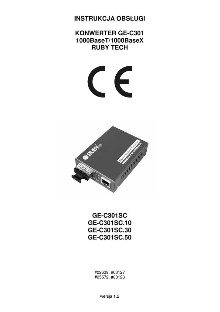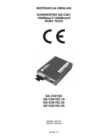 INSTRUKCJA OBSŁUGI KONWERTER GE-C301 1000BaseT/1000BaseX RUBY TECH GE-C301SC GE-C301SC.10 GE-C301SC.30 GE-C301SC.50 #02639, #03127 #05572, #03128 wersja 1.2 Wstęp Konwertery firmy Ruby Tech GE-C301 umożliwiają zmianę medium przewodzącego strumień danych ze standardowej skrętki STP/UTP na światłowód. Urządzenie pozwala na połączenie segmentów wykonanych kablem miedzianym z segmentami wykonanymi kablem światłowodowym. Konwerter jest wyposażony w dwa porty: RJ-45 (1000Base-T) oraz port SC (1000Base-X). Urządzenia serii GE-C301 można zamontować w obudowie zbiorczej 19”. Ostrzeżenie Należy zapewnić bezpieczne warunki pracy urządzenia. Dokonanie przez użytkownika jakichkolwiek własnych zmian w urządzeniu może spowodować utratę możliwości jego legalnego użytkowania. Bezpieczeństwo użytkowania Urządzenie zostało zaprojektowane i wyprodukowane z najwyższą starannością o bezpieczeństwo osób instalujących i użytkujących. Dla zapewnienia bezpieczeństwa pracy, należy stosować się do wszelkich wskazań zawartych w tej instrukcji jak i instrukcjach obsługi urządzeń towarzyszących (np. komputera PC). 1. Zawartość opakowania - konwerter GE-C301, - zasilacz zewnętrzny AC/DC, - niniejsza instrukcja obsługi. Podczas dostawy należy upewnić się, że opakowanie nie jest uszkodzone. W przypadku stwierdzonych uszkodzeń należy niezwłocznie skontaktować się z dostawcą. Prosimy również o sprawdzenie zgodności zawartości opakowania z powyżej zamieszczoną listą. 2. Zawartość tej instrukcji Instrukcja ta zawiera opis konwertera GE-C301 z odpowiednimi procedurami instalacji, konfiguracji i użytkowania. Przed przystąpieniem do instalacji urządzenia należy dokładnie przeczytać całość tej instrukcji, w szczególności zaś punkty poświęcone bezpieczeństwu. 3. Zasady bezpieczeństwa Konwerter GE-C301 jest zgodny z przepisami w zakresie bezpieczeństwa użytkowania urządzeń elektrycznych. - gniazdo sieciowe musi być uziemione zgodnie z obowiązującymi przepisami, - przed przeniesieniem lub wykonywaniem innych operacji technicznych urządzenie należy odłączyć od zasilania, - nie stosować uszkodzonych lub zużytych przewodów zasilania, gdyż powodują one znaczne zagrożenie dla bezpieczeństwa użytkownika, - prace instalacyjne muszą być wykonywane przez odpowiednio przeszkolony personel techniczny, - nie stosować urządzenia w miejscach występowania substancji łatwopalnych, - zabezpieczyć urządzenie przed dostępem dzieci lub osób niepowołanych, - upewnić się, że urządzenie zostało odpowiednio zamocowane, - urządzenie traktowane jest jako wyłączone dopiero po odłączeniu przewodów zasilania oraz przewodów łączących je z innymi urządzeniami, - jeśli urządzenie zostanie przeniesione z miejsca chłodnego do ciepłego, w jego wnętrzu może skroplić się para wodna uniemożliwiając prawidłowe funkcjonowanie. Należy wówczas odczekać, aż wilgoć odparuje. Uwaga: Nie należy dotykać styków gniazd znajdujących się na obudowie urządzenia. Wyładowanie elektrostatyczne może spowodować trwałe uszkodzenie urządzenia. 2 4. Instalacja sprzętu 4.1. Zasilanie Konwerter GE-C301 jest zasilany dostarczonym zewnętrznym zasilaczem AC/DC. Należy podłączyć zasilacz do sieci prądu przemiennego ~230V 50Hz, a złącze DC 5V należy wpiąć do gniazda zasilania urządzenia. 4.2. Oprogramowanie Dla prawidłowego funkcjonowania konwertera GE-C301 nie jest wymagane instalowanie dodatkowego oprogramowania. 4.3. Środowisko pracy Należy zadbać, aby urządzenie umieszczone było w sposób zapewniający dobry przepływ powietrza i łatwy dostęp do portów. Powietrze powinno być wolne od zanieczyszczeń, a urządzenie nie powinno znajdować się w bezpośredniej bliskości źródeł ciepła (piece, grzejniki, bezpośrednie nasłonecznienie) bądź urządzeń generujących zakłócenia elektromagnetyczne (silniki, telewizory itp.). 4.4. Montaż W celu poprawnego podłączenia urządzenia należy wykonać następujące czynności: - umieścić konwerter na płaskiej powierzchni w sposób zapewniający dobry przepływ powietrza i łatwy dostęp do portów, - wpiąć złącze zasilania z zasilacza zewnętrznego DC do konwertera, - wpiąć przyłącza. Montaż w obudowie zbiorczej 19”: - usunąć pokrywę ze slotu, w którym będzie montowany konwerter, - wsunąć konwerter do slotu. 5. Instalacja okablowania Do połączenia konwertera z innym urządzeniem sieciowym zaleca się stosowanie przyłączy odpowiednich dla typu wbudowanych portów. 6. Konserwacja Konwerter GE-C301 nie wymaga żadnych szczególnych czynności konserwacyjnych. Zalecamy umieszczenie go na trwałej podstawie i takie poprowadzenie przewodów zasilania, aby nie mogły być przypadkowo uszkodzone przez operatora lub osoby postronne. 7. Informacja dla użytkowników o pozbywaniu się urządzeń elektrycznych i elektronicznych (dotyczy gospodarstw domowych) Przedstawiony symbol umieszczony na produktach lub dołączonej do nich dokumentacji informuje, że niesprawnych urządzeń elektrycznych lub elektronicznych nie można wyrzucać razem z odpadami gospodarczymi. Prawidłowe postępowanie w razie konieczności utylizacji, powtórnego użycia lub odzysku podzespołów polega na przekazaniu urządzenia do wyspecjalizowanego punktu zbiórki, gdzie będzie przyjęte bezpłatnie. W niektórych krajach produkt można oddać lokalnemu dystrybutorowi podczas zakupu innego urządzenia. Prawidłowa utylizacja urządzenia umożliwia zachowanie cennych zasobów i uniknięcie negatywnego wpływu na zdrowie i środowisko, które może być zagrożone przez nieodpowiednie postępowanie z odpadami. Szczegółowe informacje o najbliższym punkcie zbiórki można uzyskać u władz lokalnych. Nieprawidłowa utylizacja odpadów zagrożona jest karami przewidzianymi w odpowiednich przepisach lokalnych. W razie konieczności pozbycia się urządzeń elektrycznyc