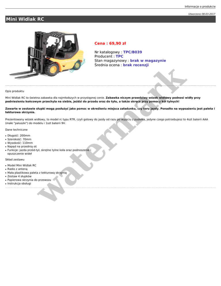 Informacje o produkcie Utworzono 08-03-2017 Mini Widlak RC Cena : 69,90 zł er m ar k Nr katalogowy : TPC/B039 Producent : TPC Stan magazynowy : brak w magazynie Średnia ocena : brak recenzji Opis produktu Mini Widlak RC to świetna zabawka dla najmłodszych w przystępnej cenie. Zabawka niczym prawdziwy wózek widłowy podnosi widły przy podniesieniu końcowym przechyla na siebie, jeździ do przodu oraz do tyłu, a także skręca przy pomocy kół tylnych! Zawarte w zestawie słupki mogą posłużyć jako pomoc w określeniu miejsca załadunku, czy toru jazdy. Ponadto na wypsażeniu jest paleta i tekturowa skrzynia. Prezentowany wózek widłowy, to model rc typu RTR, czyli gotowy do jazdy od razu po wyjęciu z pudełka, jedyne czego potrzebujesz to 4szt baterii AAA (małe "paluszki") do modelu i 1szt baterii 9V. Dane techniczne ● ● ● ● ● Długość: 200mm Szerokość: 70mm Wysokość: 110mm Napęd na przednią oś Funkcje: jazda przód-tył, skrętne tylne koła oraz podnoszenie i opuszczenie wideł Skład zestawu ● ● ● ● Model Mini Widlak RC Radio z anteną Mała plastikowa paleta z tekturową skrzynią Zestaw 4 słupków Papierowa skrzynia do przewozu Instrukcja obsługi at ● w ●