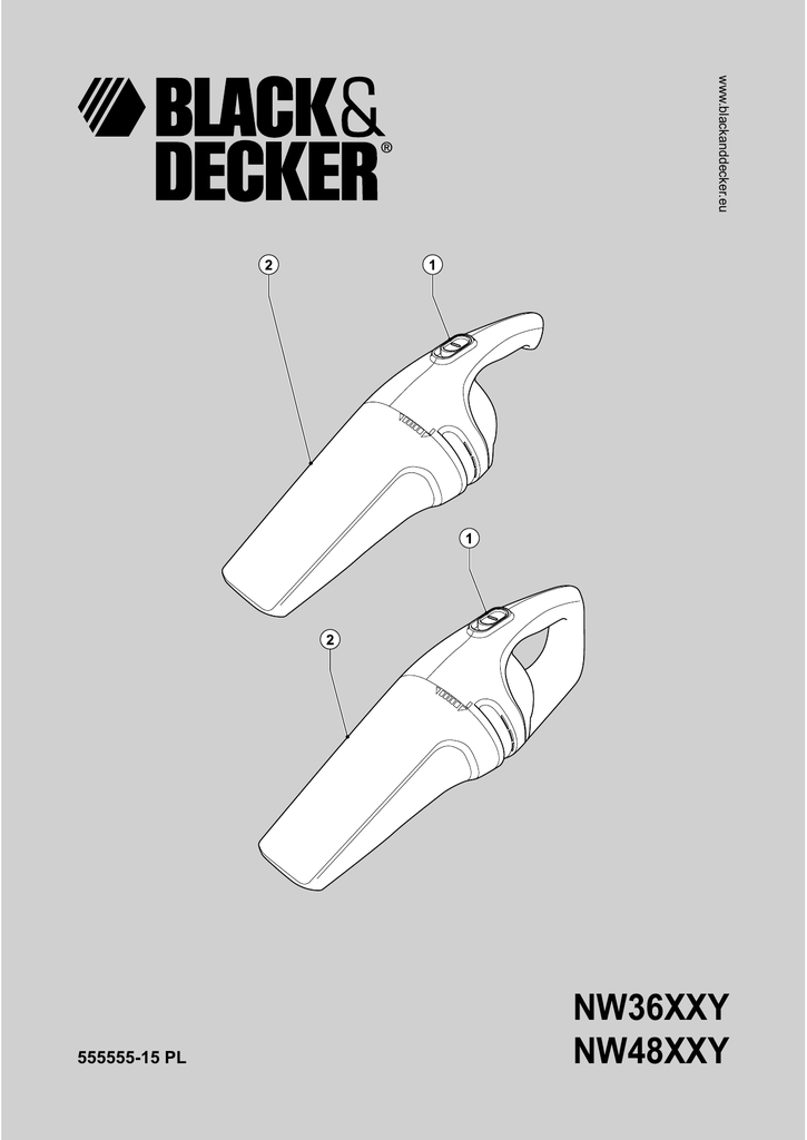 www.blackanddecker.eu 555555-15 PL NW36XXY NW48XXY 2 2 2 5 6 G F 7 7 8 H 3 POLSKI ODKURZACZ DUSTBUSTER NW36/NW48 • • • • Zastosowanie zgodne z przeznaczeniem Odkurzacz Dustbuster ® firmy Black & Decker jest przeznaczony do lekkiego sprzątania na mokro i sucho. Urządzenie to nie nadaje się do celów profesjonalnych. Nie wystawiaj akumulatora na działanie wilgoci. Nie wrzucaj akumulatora do ognia! Nie wystawiaj ładowarki na działanie wilgoci. Nie otwieraj ładowarki. Bezpieczeństwo elektryczne Wskazówki dotyczące bezpieczeństwa Ładowarka jest przystosowana do zasilania tylko jednym napięciem. Sprawdź, czy lokalne napięcie sieciowe zgadza się z wartością podaną na tabliczce znamionowej ładowarki. Nigdy nie próbuj bezpośrednio przyłączać urządzenia do sieci. Uwaga! Przy korzystaniu z urządzeń akumulatorowych dokładnie przestrzegaj wskazówek zawartych w tej instrukcji i podstawowych przepisów bhp, by zminimalizować ryzyko pożaru, wycieku elektrolitu, czy też doznania urazu ciała i szkód rzeczowych. • Przed użyciem urządzenia dokładnie przeczytaj niniejszą instrukcję. • W instrukcji tej opisano zastosowanie odkurzacza zgodne z przeznaczeniem. Używanie innych nasadek lub akcesoriów, niż zalecane w tej instrukcji, lub wykonywanie prac niezgodnych z przeznaczeniem grozi wypadkiem. • Przechowuj niniejszą instrukcję obsługi. Symbole na ładowarce Ładowarka jest podwójnie zaizolowana i dlatego żyła uziemiająca nie jest konieczna. Bezpieczny transformator separujący. Wyjście transformatora jest galwanicznie oddzielone od sieci. 130oC Przy zbyt wysokiej temperaturze otoczenia ładowarka automatycznie się wyłącza i nie daje się już uruchomić. Trzeba ją wówczas odłączyć od sieci i oddać do naprawy w autoryzowanym warsztacie serwisowym. Zastosowanie odkurzacza • • • Nie zasysaj do odkurzacza żadnych cieczy ani łatwopalnych materiałów. Nie używaj odkurzacza w pobliżu wody, ani nie zanurzaj go w wodzie. Nie ciągnij za kabel ładowarki, by odłączyć ją od sieci. Chroń kabel przed wysoką temperaturą, olejem i ostrymi krawędziami. Ładowarka jest przeznaczona wyłącznie do pracy w zamkniętych pomieszczeniach. Przed użyciem odkurzacza dokładnie przeczytaj tę instrukcję. Po użyciu • • Uwaga! Urządzenia elektryczne przechowuj poza zasięgiem dzieci lub osób niepełnosprawnych. Nigdy nie pozwalaj im na użytkowanie takich urządzeń bez nadzoru. Zanim zaczniesz czyścić ładowarkę, wyjmij wtyczkę kabla z gniazda sieciowego. Nieużywane urządzenia przechowuj w suchym, niedostępnym dla dzieci miejscu. Elementy odkurzacza Kontrole i naprawy • • • • • 1. 2. Przed użyciem odkurzacza sprawdź, czy nie zawiera jakichś uszkodzonych elementów. Skontroluj, czy jakieś części nie są pęknięte, czy wyłącznik jest sprawny i czy nie wystąpiły jakieś inne okoliczności, które mogą negatywnie wpływać na działanie odkurzacza. Nie używaj odkurzacza, gdy jakaś jego część jest uszkodzona. W razie uszkodzenia jakiejś części zleć jej naprawę lub wymianę jednemu z naszych autoryzowanych warsztatów serwisowych. Regularnie sprawdzaj kabel ładowarki, czy nie uległ uszkodzeniu. Gdyby tak się stało, wymień ładowarkę. Nigdy nie próbuj usuwania ani wymiany jakichkolwiek części nieopisanych w tej instrukcji. Rys. A 3. 4. Ssawka szczelinowa Nasadka do sprzątania na mokro Rozpakowanie Identyfikacja produktu O rodzaju konstrukcji odkurzacza informuje numer katalogowy. W tym podręczniku opisano modele: NV36XXY/NV48XXY. Cyfry XX mają następujące znaczenie: 00: Rękojeść prosta, bez nasadek 03: Rękojeść zamknięta, do zakresu dostawy należy ssawka szczelinowa i szczotka do kurzu. 60: Rękojeść zamknięta, do zakresu dostawy należą nasadka szczelinowa i nasadka do sprzątania na mokro. Akumulator i ładowarka • Wyłącznik Pojemnik na śmieci W żadnym wypadku nie próbuj otwierać akumulatora. 4 Cyfra Y na końcu numeru katalogowego oznacza kolor. Litera N na początku numeru katalogowego oznacza akumulator niklowo-wodorkowy. Załączanie i wyłączanie (rys. E) • By załączyć odkurzacz, przesuń wyłącznik (1) do przodu. • By wyłączyć odkurzacz, przesuń wyłącznik do tyłu. Instalacja Sprzątanie na mokro (rys. A) Jeżeli powierzchnia nie jest chłonna, można użyć nasadki do sprzątania na mokro (4). Najlepsze wyniki osiąga się, gdy odkurzacz jest utrzymywany pod kątem 45° i powoli ciągnięty do siebie. W przypadku powierzchni chłonnych, jak np. dywany, najlepiej jest używać odkurzacza bez nasadki (4). Mocowanie haka ściennego na ścianie (rys. B) Hak ścienny może być przymocowany do ściany, poprzez co można uzyskać wygodne miejsce do przechowywania oraz ładowania urządzenia. Umieszczanie stacji ładowania na ścianie (rys.C1 i C2) Stacja ładowania może być umieszczona na powierzchni płaskiej lub na ścianie, co umożliwia pozyskanie wygodnego miejsca do przechowywania i ładowania urządzenia. Czyszczenie i konserwacja Uwaga! Regularnie czyść filtry. Czyszczenie pojemnika na śmieci i filtrów (rys. rys. F i G) Montaż Filtry są filtrami wielokrotnego użytku i należy je regularnie czyścić. • Wyjmij pojemnik na śmieci (2) przez obrócenie go w lewo. • Opróżnij pojemnik. • Zdejmij filtry (5 i 6). • Wymyj filtry w ciepłej wodzie z mydłem. Ewentualnie możesz także umyć pojemnik. Nie zanurzaj odkurzacza w wodzie. • Całkowicie wysusz pojemnik na śmieci i filtry. • Ponownie załóż filtry (5 i 6). • Ponownie załóż pojemnik na śmieci. Sprawdź, czy pojemnik prawidłowo zatrzasnął się w swojej pozycji. Zakładanie nasadek (rys. rys. A i D) Modele te są dostarczane z niektórymi lub wszystkimi wymienionymi niżej akcesoriami: • ssawka szczelinowa (3) do trudno dostępnych miejsc • nasadka do sprzątania na mokro (4). By zamocować jakąś nasadkę, wykonaj następujące operacje: • Wyjmij odpowie