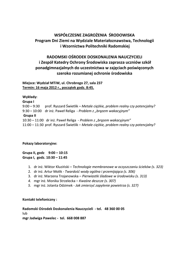 WSPÓŁCZESNE ZAGROŻENIA ŚRODOWISKA Program Dni Ziemi na Wydziale Materiałoznawstwa, Technologii i Wzornictwa Politechniki Radomskiej RADOMSKI OŚRODEK DOSKONALENIA NAUCZYCIELI i Zespół Katedry Ochrony Środowiska zaprasza uczniów szkół ponadgimnazjalnych do uczestnictwa w zajęciach poświęconych szeroko rozumianej ochronie środowiska Miejsce: Wydział MTiW, ul. Chrobrego 27, sala 237 Termin: 16 maja 2012 r., początek godz. 8:45. Wykłady: Grupa I 9:00 – 9:30 9:30 – 10:00 Grupa II 10:30 – 11:00 11:00 – 11:30 prof. Ryszard Świetlik – Metale ciężkie, problem realny czy potencjalny? dr inż. Paweł Religa - Problem z „brązem wakacyjnym” dr inż. Paweł Religa - Problem z „brązem wakacyjnym” prof. Ryszard Świetlik – Metale ciężkie, problem realny czy potencjalny? Pokazy laboratoryjne: Grupa II, godz 9:00 – 10:15 Grupa I, godz. 10:30 – 11:45 1. 2. 3. 4. 5. dr inż. Wiktor Kluziński – Technologie membranowe w oczyszczaniu ścieków (s. 323) dr inż. Artur Molik - Twardość wody ogólna i przemijająca (s. 306) dr inż. Marzena Trojanowska – Pierwiastki śladowe w środowisku (s. 313) mgr inż. Monika Strzelecka – Kwaśne deszcze (s. 307) mgr inż. Jolanta Odzimek - Jak zmierzyć zapylenie powietrza (s. 327) Kontakt telefoniczny : Radomski Ośrodek Doskonalenia Nauczycieli - tel. 48 360 00 05 lub mgr Jadwiga Pawelec - tel. 668 008 887