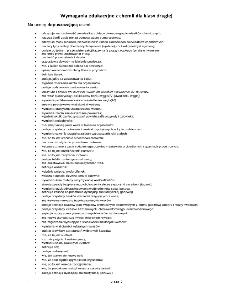 Wymagania edukacyjne z chemii dla klasy drugiej Na ocenę dopuszczającą uczeń: 1 odczytuje wartościowość pierwiastka z układu okresowego pierwiastków chemicznych; nazywa tlenki zapisane za pomocą wzoru sumarycznego; odczytuje masy atomowe pierwiastków z układu okresowego pierwiastków chemicznych; zna trzy typy reakcji chemicznych: łączenie (syntezę), rozkład (analizę) i wymianę; podaje po jednym przykładzie reakcji łączenia (syntezy), rozkładu (analizy) i wymiany; zna treść prawa zachowania masy; zna treść prawa stałości składu. przedstawia dowody na istnienie powietrza; wie, z jakich substancji składa się powietrze; opisuje na schemacie obieg tlenu w przyrodzie; definiuje tlenek; podaje, jakie są zastosowania tlenu; wyjaśnia znaczenie azotu dla organizmów; podaje podstawowe zastosowania azotu; odczytuje z układu okresowego nazwy pierwiastków należących do 18. grupy; zna wzór sumaryczny i strukturalny tlenku węgla(IV) [dwutlenku węgla]; wymienia podstawowe zastosowania tlenku węgla(IV); omawia podstawowe właściwości wodoru; wymienia praktyczne zastosowania wodoru; wymienia źródła zanieczyszczeń powietrza; wyjaśnia skutki zanieczyszczeń powietrza dla przyrody i człowieka. wymienia rodzaje wód; wie, jaką funkcję pełni woda w budowie organizmów; podaje przykłady roztworów i zawiesin spotykanych w życiu codziennym; wymienia czynniki przyśpieszające rozpuszczanie ciał stałych; wie, co to jest stężenie procentowe roztworu; zna wzór na stężenie procentowe roztworu; wskazuje znane z życia codziennego przykłady roztworów o określonych stężeniach procentowych; wie, co to jest rozcieńczanie roztworu; wie, co to jest zatężanie roztworu; podaje źródła zanieczyszczeń wody; zna podstawowe skutki zanieczyszczeń wód. definiuje wskaźnik; wyjaśnia pojęcie: wodorotlenek; wskazuje metale aktywne i mniej aktywne; wymienia dwie metody otrzymywania wodorotlenków; stosuje zasady bezpiecznego obchodzenia się ze stężonymi zasadami (ługami); wymienia przykłady zastosowania wodorotlenków sodu i potasu; definiuje zasadę na podstawie dysocjacji elektrolitycznej (jonowej). podaje przykłady tlenków niemetali reagujących z wodą; zna wzory sumaryczne trzech poznanych kwasów; podaje definicje kwasów jako związków chemicznych zbudowanych z atomu (atomów) wodoru i reszty kwasowej; podaje przykłady kwasów beztlenowych: chlorowodorowego i siarkowodorowego; zapisuje wzory sumaryczne poznanych kwasów beztlenowych; zna nazwę zwyczajową kwasu chlorowodorowego; zna zagrożenia wynikające z właściwości niektórych kwasów; wymienia właściwości wybranych kwasów; podaje przykłady zastosowań wybranych kwasów; wie, co to jest skala pH; rozumie pojęcie: kwaśne opady; wymienia skutki kwaśnych opadów. definiuje sól; podaje budowę soli; wie, jak tworzy się nazwy soli; wie, że sole występują w postaci kryształów; wie, co to jest reakcja zobojętniania; wie, że produktem reakcji kwasu z zasadą jest sól; podaje definicję dysocjacji elektrolitycznej (jonowej); klasa 2 wie, że istnieją sole dobrze, słabo i trudno rozpuszczalne w wodzie; podaje przykłady soli obecnych i przydatnych w codziennym życiu (w kuchni i łazience); wie, w jakim celu stosuje się sole jako nawozy mineralne; zna główny składnik skał wapiennych. Na ocenę dostateczną uczeń: oblicza liczby atomów poszczególnych pierwiastków na podstawie zapisów typu: 3 H2O; definiuje i oblicza masy cząsteczkowe pierwiastków i związków chemicznych; wyjaśnia, na czym polega reakcja łączenia (syntezy), rozkładu (analizy) i wymiany; podaje po kilka przykładów reakcji łączenia (syntezy), rozkładu (analizy) i wymiany; zapisuje przemiany chemiczne w formie równań reakcji chemicznych; dobiera współczynniki stechiometryczne w równaniach reakcji chemicznych; wykonuje bardzo proste obliczenia oparte na prawie zachowania masy; wykonuje bardzo proste obliczenia oparte na stałości składu. bada skład oraz podstawowe właściwości powietrza; tłumaczy, dlaczego bez tlenu nie byłoby życia na Ziemi; wskazuje źródła pochodzenia ozonu oraz określa jego znaczenie dla organizmów; podaje podstawowe zastosowania praktyczne kilku wybranych tlenków; proponuje spalanie jako sposób otrzymywania tlenków; ustala nazwy tlenków na podstawie wzorów; ustala wzory sumaryczne tlenków na podstawie nazwy; oblicza masy cząsteczkowe wybranych tlenków; uzupełnia współczynniki stechiometryczne w równaniach reakcji otrzymywania tlenków metodą utleniania omawia właściwości azotu: wyjaśnia znaczenie azotu dla organizmów; wymienia źródła tlenku węgla(IV); wyjaśnia znaczenie tlenku węgla(IV) dla organizmów; przeprowadza identyfikację tlenku węgla(IV) przy użyciu wody wapiennej; wie, jaka właściwość tlenku węgla(IV) zadecydowała o jego zastosowaniu; omawia właściwości wodoru; bezpiecznie obchodzi się z substancjami i mieszaninami wybuchowymi; podaje, jakie właściwości wodoru zdecydowały o jego zastosowaniu; podaje przyczyny i skutki smogu; wyjaśnia powstawanie efektu cieplarnianego i konsekwencje jego wzrostu na życie mieszkańców Ziemi; wymienia przyczyny i skutki dziury ozonowej. bada skład oraz podstawowe właściwości powietrza; tłumaczy, dlaczego bez tlenu nie byłoby życia na Ziemi; wskazuje źródła pochodzenia ozonu oraz określa jego znaczenie dla organizmów; podaje podstawowe zastosowania praktyczne kilku wybranych tlenków; proponuje spalanie jako sposób otrzymywania tlenków; ustala nazwy tlenków na podstawie wzorów; ustala wzory sumaryczne tlenków na podstawie nazwy; oblicza masy cząsteczkowe wybranych tlenków; uzupełnia współczynniki stechiometryczne w równaniach reakcji otrzymywania tlenków metodą utleniania omawia właściwości azotu: wyjaśnia znaczenie azotu dla organizmów; wymienia źródła tlenku węgla(IV); wyjaśnia znaczenie tlenku węgla(IV) dla organizmów; przeprowadza 