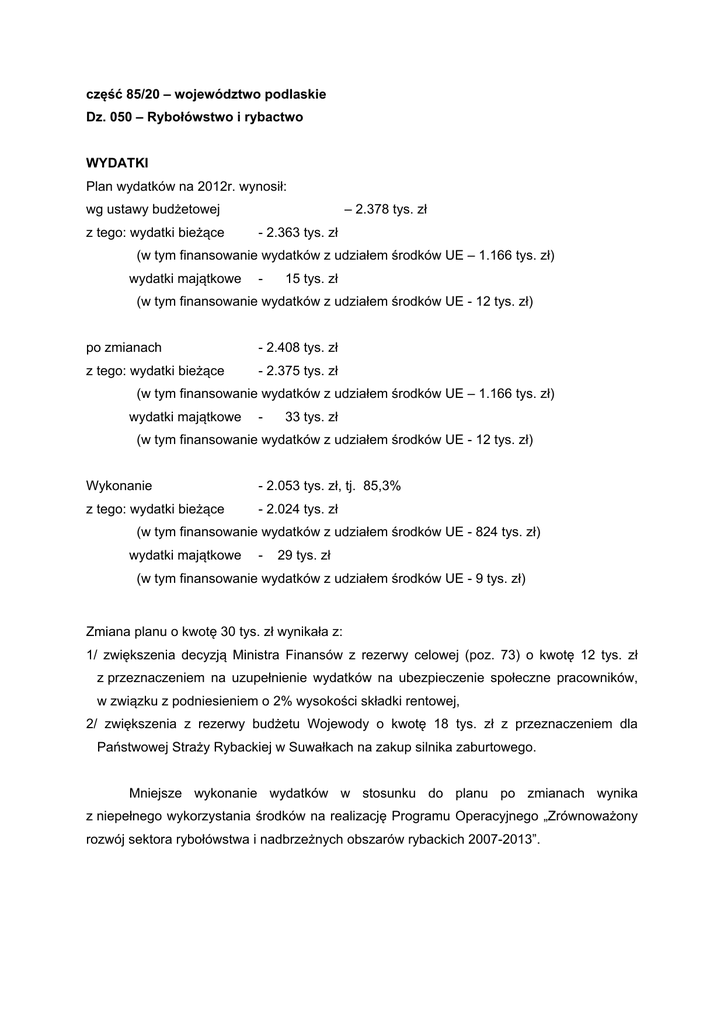 część 85/20 – województwo podlaskie Dz. 050 – Rybołówstwo i rybactwo WYDATKI Plan wydatków na 2012r. wynosił: wg ustawy budżetowej z tego: wydatki bieżące – 2.378 tys. zł - 2.363 tys. zł (w tym finansowanie wydatków z udziałem środków UE – 1.166 tys. zł) wydatki majątkowe - 15 tys. zł (w tym finansowanie wydatków z udziałem środków UE - 12 tys. zł) po zmianach - 2.408 tys. zł z tego: wydatki bieżące - 2.375 tys. zł (w tym finansowanie wydatków z udziałem środków UE – 1.166 tys. zł) wydatki majątkowe - 33 tys. zł (w tym finansowanie wydatków z udziałem środków UE - 12 tys. zł) Wykonanie - 2.053 tys. zł, tj. 85,3% z tego: wydatki bieżące - 2.024 tys. zł (w tym finansowanie wydatków z udziałem środków UE - 824 tys. zł) wydatki majątkowe - 29 tys. zł (w tym finansowanie wydatków z udziałem środków UE - 9 tys. zł) Zmiana planu o kwotę 30 tys. zł wynikała z: 1/ zwiększenia decyzją Ministra Finansów z rezerwy celowej (poz. 73) o kwotę 12 tys. zł z przeznaczeniem na uzupełnienie wydatków na ubezpieczenie społeczne pracowników, w związku z podniesieniem o 2% wysokości składki rentowej, 2/ zwiększenia z rezerwy budżetu Wojewody o kwotę 18 tys. zł z przeznaczeniem dla Państwowej Straży Rybackiej w Suwałkach na zakup silnika zaburtowego. Mniejsze wykonanie wydatków w stosunku do planu po zmianach wynika z niepełnego wykorzystania środków na realizację Programu Operacyjnego „Zrównoważony rozwój sektora rybołówstwa i nadbrzeżnych obszarów rybackich 2007-2013”. Z ogólnej kwoty wydatków bieżących przeznaczono na: I. Utrzymanie i działalność Państwowej Straży Rybackiej (rozdz. 05003) Plan po zmianach - 1.169 tys. zł Wykonanie - 1.169 tys. zł Świadczenia na rzecz osób fizycznych Plan po zmianach - 56 tys. zł Wykonanie - 56 tys. zł, tj. 100 % Wydatki przeznaczono na świadczenia wynikające z przepisów bhp. W trakcie roku dokonywane były przeniesienia wydatków decyzjami wewnętrznymi polegające na zmniejszeniu planu wydatków w grupie świadczeń o kwotę 5 tys. zł a zwiększeniu planu grupy wydatków bieżących. Wydatki bieżące Plan po zmianach - 1.113 tys. zł Wykonanie - 1.113 tys. zł, tj. 100,0 % w tym: wynagrodzenia - 722 tys. zł pochodne od wynagrodzeń - 137 tys. zł pozapłacowe wydatki - 254 tys. zł Decyzją Ministra Finansów dokonano zwiększenia wydatków o kwotę 12 tys. zł z przeznaczeniem na uzupełnienie wydatków na ubezpieczenie społeczne pracowników, w związku z podniesieniem o 2% wysokości składki rentowej. W trakcie roku dokonywane były przeniesienia wydatków decyzjami Wojewody i decyzjami wewnętrznymi pomiędzy grupami wydatków, tj. świadczeniami i wydatkami bieżącymi. Wydatki na wynagrodzenia bezosobowe zostały zaplanowane w wysokości 5 tys. zł. W trakcie roku zostały one zmniejszone o kwotę 5 tys. zł decyzjami Wojewody (przeniesienia między paragrafami w obrębie Jednostki). Zmiany te nie spowodowały skutków na lata następne. Zatrudnienie (przeciętne wykonanie wykazane w sprawozdaniu Rb-70): - osoby nieobjęte mnożnikowymi systemami wynagrodzeń 2011r. – 20 2012r. – 20 Zakres i struktura wydatków w tym dziale w porównaniu do roku 2011 miały podobny charakter i przeznaczone były zgodnie z planem na działalność Państwowej Straży Rybackiej. Państwowa Straż Rybacka przeprowadziła 1.098 kontroli, podczas których ujawniono 219 przypadków naruszeń obowiązujących przepisów prawa normujących działalność w obszarze rybactwa śródlądowego. II. Realizację Programu Operacyjnego „Zrównoważony rozwój sektora rybołówstwa i nadbrzeżnych obszarów rybackich 2007-2013” (rozdz. 05011) – wydatki bieżące Plan po zmianach - 1.206 tys. zł Wykonanie - 855 tys. zł Finansowanie wydatków z udziałem środków UE: - plan - 1.166 tys. zł, - wykonanie - 824 tys. zł. Wydatki obejmowały dotacje celowe na wyprzedzające finansowanie i współfinansowanie oraz VAT wydatków bieżących przeznaczonych dla samorządu województwa podlaskiego na realizację projektów w ramach Programu Operacyjnego „Zrównoważony rozwój sektora rybołówstwa i nadbrzeżnych obszarów rybackich 2007-2013”. Niższe, niż planowano, wykonanie wydatków wynika z: - przedłużającej się procedury rekrutacji nowych pracowników w Urzędzie Marszałkowskim Województwa Podlaskiego, - niższego sfinansowania podatku VAT przy realizacji projektów, - oszczędności powstałych przy zakupie materiałów i wyposażenia, - oszczędności wynikłych po przetargach, - oszczędności powstałych przy wykonaniu materiałów promocyjno-reklamowych. W roku 2012 decyzją Wojewody Podlaskiego zostały zablokowane planowane wydatki na realizację Programu Operacyjnego „Zrównoważony rozwój sektora rybołówstwa i nadbrzeżnych obszarów rybackich 2007-2013” w kwocie 235 tys. zł, w tym środki z udziałem UE – 230 tys. zł. W ramach programu zrealizowano 5 zadań: „Wynagrodzenie pracowników realizujących zadania PO RYBY 2007 – 2013” ROR/6, „Wsparcie funkcjonowania jednostki realizującej zadania PO RYBY 2007 – 2013” ROR/6, „Szkolenia pracowników realizujących zadania PO RYBY 2007 – 2013” ROR/7, „Informacja i promocja Programu Operacyjnego RYBY 2007 – 2013” ROR/8, „Wyposażenie teleinformatyczne pracowników zajmujących się PO RYBY 2007 – 2013” ROR/9. Umożliwiło to sprawne funkcjonowanie Departamentu Rolnictwa i Obszarów Rybackich Urzędu Marszałkowskiego Województwa Podlaskiego i skuteczne wdrażanie działań w ramach PO RYBY 2007-2013 na terenie województwa podlaskiego. część 85/20 – województwo podlaskie Dz. 050 – Rybołówstwo i rybactwo, rozdz. 05011 WYDATKI MAJĄTKOWE Plan wg ustawy - 15 tys. zł Plan po zmianach - 33 tys. zł Wykonanie - 29 tys. zł, tj. 87,88% I. Państwowa Straż Rybacka (rozdz. 05003) Plan po zmianach - 18 tys. zł Wykonanie - 18 tys. zł, tj. 100% Wydatki zostały