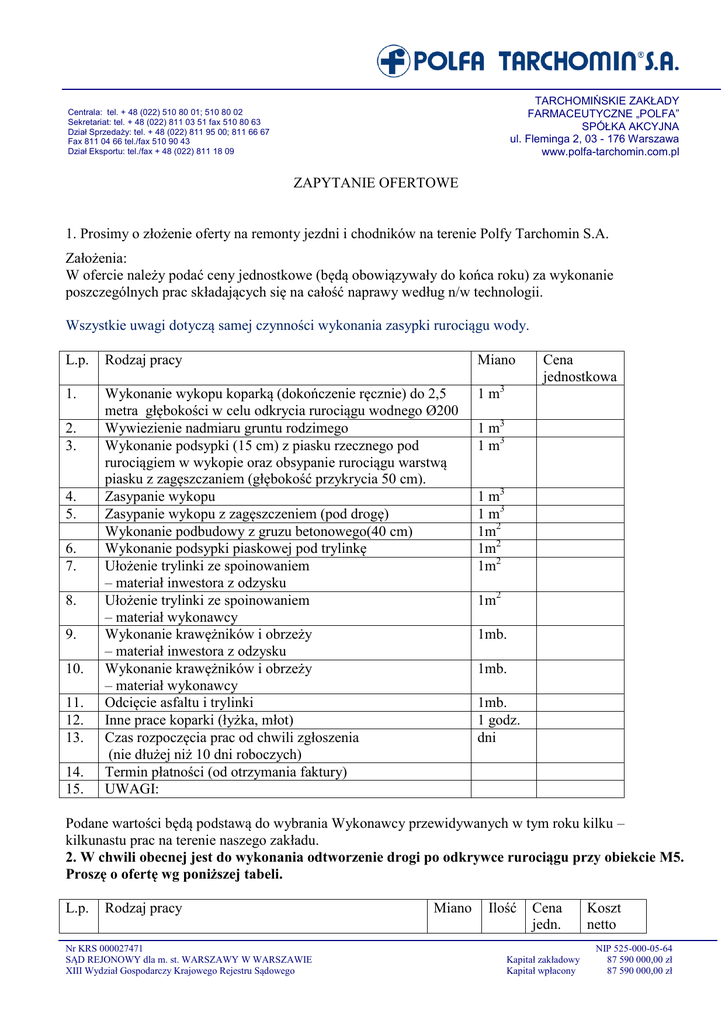 TARCHOMIŃSKIE ZAKŁADY FARMACEUTYCZNE „POLFA” SPÓŁKA AKCYJNA ul. Fleminga 2, 03 - 176 Warszawa www.polfa-tarchomin.com.pl Centrala: tel. + 48 (022) 510 80 01; 510 80 02 Sekretariat: tel. + 48 (022) 811 03 51 fax 510 80 63 Dział Sprzedaży: tel. + 48 (022) 811 95 00; 811 66 67 Fax 811 04 66 tel./fax 510 90 43 Dział Eksportu: tel./fax + 48 (022) 811 18 09 ZAPYTANIE OFERTOWE 1. Prosimy o złożenie oferty na remonty jezdni i chodników na terenie Polfy Tarchomin S.A. Założenia: W ofercie należy podać ceny jednostkowe (będą obowiązywały do końca roku) za wykonanie poszczególnych prac składających się na całość naprawy według n/w technologii. Wszystkie uwagi dotyczą samej czynności wykonania zasypki rurociągu wody. L.p. Rodzaj pracy Miano 1. Wykonanie wykopu koparką (dokończenie ręcznie) do 2,5 metra głębokości w celu odkrycia rurociągu wodnego Ø200 Wywiezienie nadmiaru gruntu rodzimego Wykonanie podsypki (15 cm) z piasku rzecznego pod rurociągiem w wykopie oraz obsypanie rurociągu warstwą piasku z zagęszczaniem (głębokość przykrycia 50 cm). Zasypanie wykopu Zasypanie wykopu z zagęszczeniem (pod drogę) Wykonanie podbudowy z gruzu betonowego(40 cm) Wykonanie podsypki piaskowej pod trylinkę Ułożenie trylinki ze spoinowaniem – materiał inwestora z odzysku Ułożenie trylinki ze spoinowaniem – materiał wykonawcy Wykonanie krawężników i obrzeży – materiał inwestora z odzysku Wykonanie krawężników i obrzeży – materiał wykonawcy Odcięcie asfaltu i trylinki Inne prace koparki (łyżka, młot) Czas rozpoczęcia prac od chwili zgłoszenia (nie dłużej niż 10 dni roboczych) Termin płatności (od otrzymania faktury) UWAGI: 1 m3 2. 3. 4. 5. 6. 7. 8. 9. 10. 11. 12. 13. 14. 15. Cena jednostkowa 1 m3 1 m3 1 m3 1 m3 1m2 1m2 1m2 1m2 1mb. 1mb. 1mb. 1 godz. dni Podane wartości będą podstawą do wybrania Wykonawcy przewidywanych w tym roku kilku – kilkunastu prac na terenie naszego zakładu. 2. W chwili obecnej jest do wykonania odtworzenie drogi po odkrywce rurociągu przy obiekcie M5. Proszę o ofertę wg poniższej tabeli. L.p. Rodzaj pracy Nr KRS 000027471 SĄD REJONOWY dla m. st. WARSZAWY W WARSZAWIE XIII Wydział Gospodarczy Krajowego Rejestru Sądowego Miano Ilość Cena jedn. Kapitał zakładowy Kapitał wpłacony Koszt netto NIP 525-000-05-64 87 590 000,00 zł 87 590 000,00 zł 2. 4. 5. 6. 7. 8. 9. 11. Wykonanie podsypki (15 cm) z piasku rzecznego pod rurociągiem w wykopie oraz obsypanie rurociągu warstwą piasku z zagęszczaniem (głębokość przykrycia 50 cm). Zasypanie wykopu z zagęszczeniem (pod drogę) Wykonanie podbudowy z gruzu betonowego(40 cm) Wykonanie podsypki piaskowej pod trylinkę Ułożenie trylinki – materiał inwestora z odzysku Ułożenie trylinki ze spoinowaniem – materiał wykonawcy Wykonanie krawężników i obrzeży – materiał inwestora z odzysku Odcięcie asfaltu i trylinki 1 m3 1 m3 1m2 1m2 1m2 1m2 1mb. 1mb. RAZEM Oferta powinna być poprzedzona wizją lokalną. Konsultacji udziela H. Rafalski tel. (22) 510 8544 lub kom. 512 000 602. Oferta powinna zawierać koszt, warunki płatności i gwarancję. Wskazane referencje. Ofertę prosimy złożyć do godz. 15 dnia 27.03.2015 w kancelarii Polfa Tarchomin S.A., 03-176 Warszawa, ul. Fleminga 2 w zaklejonej kopercie z hasłem: KANCELARIA - Oferta - Dział 2100 – (REMONT DRÓG) Tarchomińskie Zakłady Farmaceutyczne „Polfa” Spółka Akcyjna zastrzega sobie prawo do odstąpienia od przetargu bez podania przyczyn, swobodnego wyboru oferty, dodatkowych negocjacji i uzgodnień, zawarcia umowy w drodze negocjacji.