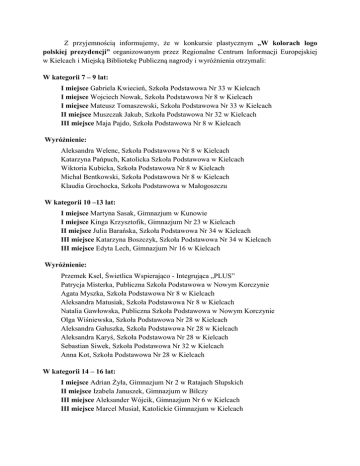Z przyjemnością informujemy, że w konkursie plastycznym „W kolorach logo polskiej prezydencji” organizowanym przez Regionalne Centrum Informacji Europejskiej w Kielcach i Miejską Bibliotekę Publiczną nagrody i wyróżnienia otrzymali: W kategorii 7 – 9 lat: I miejsce Gabriela Kwiecień, Szkoła Podstawowa Nr 33 w Kielcach I miejsce Wojciech Nowak, Szkoła Podstawowa Nr 8 w Kielcach I miejsce Mateusz Tomaszewski, Szkoła Podstawowa Nr 33 w Kielcach II miejsce Muszczak Jakub, Szkoła Podstawowa Nr 32 w Kielcach III miejsce Maja Pajdo, Szkoła Podstawowa Nr 8 w Kielcach Wyróżnienie: Aleksandra Welenc, Szkoła Podstawowa Nr 8 w Kielcach Katarzyna Pańpuch, Katolicka Szkoła Podstawowa w Kielcach Wiktoria Kubicka, Szkoła Podstawowa Nr 8 w Kielcach Michał Bentkowski, Szkoła Podstawowa Nr 8 w Kielcach Klaudia Grochocka, Szkoła Podstawowa w Małogoszczu W kategorii 10 –13 lat: I miejsce Martyna Sasak, Gimnazjum w Kunowie I miejsce Kinga Krzysztofik, Gimnazjum Nr 23 w Kielcach II miejsce Julia Barańska, Szkoła Podstawowa Nr 34 w Kielcach III miejsce Katarzyna Boszczyk, Szkoła Podstawowa Nr 34 w Kielcach III miejsce Edyta Lech, Gimnazjum Nr 16 w Kielcach Wyróżnienie: Przemek Ksel, Świetlica Wspierająco - Integrująca „PLUS” Patrycja Misterka, Publiczna Szkoła Podstawowa w Nowym Korczynie Agata Myszka, Szkoła Podstawowa Nr 8 w Kielcach Aleksandra Matusiak, Szkoła Podstawowa Nr 8 w Kielcach Natalia Gawłowska, Publiczna Szkoła Podstawowa w Nowym Korczynie Olga Wiśniewska, Szkoła Podstawowa Nr 28 w Kielcach Aleksandra Gałuszka, Szkoła Podstawowa Nr 28 w Kielcach Aleksandra Karyś, Szkoła Podstawowa Nr 28 w Kielcach Sebastian Siwek, Szkoła Podstawowa Nr 32 w Kielcach Anna Kot, Szkoła Podstawowa Nr 28 w Kielcach W kategorii 14 – 16 lat: I miejsce Adrian Żyła, Gimnazjum Nr 2 w Ratajach Słupskich II miejsce Izabela Januszek, Gimnazjum w Bilczy III miejsce Aleksander Wójcik, Gimnazjum Nr 6 w Kielcach III miejsce Marcel Musiał, Katolickie Gimnazjum w Kielcach Wyróżnienie: Sara Samek, Gimnazjum Nr 1 w Radoszycach Wiktoria Wołowiec, Zespół Szkół Ogólnokształcących Nr 12 w Kielcach Magdalena Bieńka, Zespół Szkół Ogólnokształcących Nr 12 w Kielcach Marta Stępień, Gimnazjum Nr 1 w Jędrzejowie W dniu 28.11.2011r. o godz. 11:00 w siedzibie Filii nr 10 Miejskiej Biblioteki Publicznej, ul. Konopnickiej 5 (os. Bocianek) odbędzie się uroczyste wręczenie nagród oraz otwarcie ekspozycji prac. Wszystkim laureatom i uczestnikom serdecznie dziękujemy za udział w konkursie.