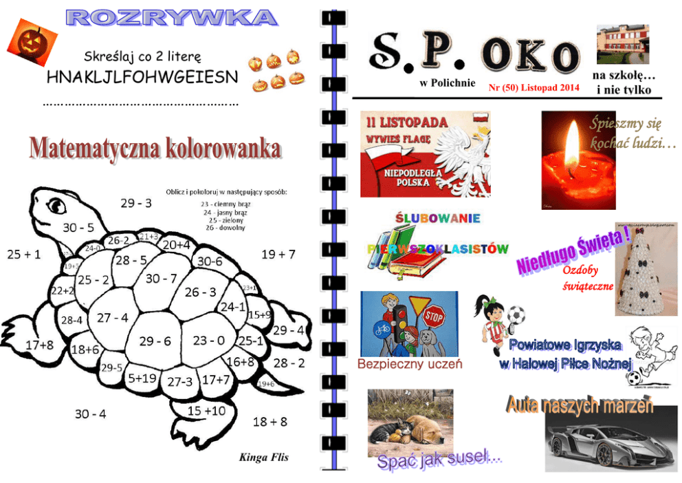 Skreślaj co 2 literę HNAKLJLFOHWGEIESN ……………………………………………… . w Polichnie Nr (50) Listopad 2014 na szkołę… i nie tylko Śpieszmy się kochać ludzi… Ozdoby świąteczne Bezpieczny uczeń Kinga Flis Dnia 23 października 2014 roku uczniowie klas I złożyli uroczyste ślubowanie i stali się pełnoprawnymi uczniami naszej szkoły. Po raz pierwszy w historii naszej szkoły Ślubowanie Pierwszaków rozpoczęło się pięknie odtańczonym polonezem. Uczniowie przygotowani przez swoje wychowawczynie – panią Annę Stefaniak i panią Małgorzatę Zielińską-Goch pięknie wyglądali w tak uroczystym tańcu. Następnie uczniowie recytowali wierszyki i śpiewali piosenki. Po części artystycznej przeszedł czas na akt ślubowania – uczniowie powtórzyli za starszą koleżanką tekst ślubowania, a następnie Pani Dyrektor Jadwiga Spryszak każdego z Pierwszaków pasowała na ucznia. Każde dziecko dostało czapeczkę oraz słodycze, a na koniec odbiło swój palec w księdze pamiątkowej. Ozdabianie choinki ma w Polsce stosunkowo niedługą tradycję. Kiedyś udekorowana choinka miała chronić dom i mieszkańców przed złymi duchami. Dziś spełnia ona jedynie aspekt dekoracyjny. Właśnie dlatego warto dokładnie zastanowić się nad tym, jakie ozdoby choinkowe zawisną na naszym drzewku. Zastanawiając się, jak udekorować choinkę na święta mamy na uwadze głównie kolorystykę ozdób choinkowych. Tradycyjne barwy świątecznych dekoracji to przede wszystkim czerwień i złoto oraz biel i srebro. Dziś w wielu sklepach można dostać ozdoby w nieco bardziej odważnych kolorach, jak zielony, różowy czy nawet grafitowy. Projektanci świątecznych ozdób chcą za wszelką cenę dopasować swoje produkty do coraz bardziej wymagających klientów. Jednak coraz częściej na naszych choinkach zawieszamy samodzielnie wykonane ozdoby. Oto kilka z pomysłów na świąteczne ozdoby: Jeśli podobają ci się ozdoby zrobione z szyszek, z jednej z nich koniecznie wyczaruj uroczą małą choineczkę. Patryk Krysa W dniu 29.10.2014r naszą szkołę odwiedzili funkcjonariusze policji, którzy w dwóch grupach – dzieci młodszych, klasy 0-III i dzieci starszych, klasy IV-VI opowiadali o bezpiecznym poruszaniu się po drogach. Zwrócili uwagę na bezpieczne przechodzenie przez ulicę, uczulali na bezpieczną jazdę dzieci w samochodzie. jak należy wyposażyć się w samochodzie – do 12 roku życia albo 1,50 m wzrostu nie wolno jeździć bez fotelika. Większość uczniów porusza się po drogach rowerami, powinni posiadać kartę rowerową i mieć odpowiednio wyposażony rower. Obowiązkowe wyposażenie roweru: 1. 2. 3. 4. 5. Światło pozycyjne z przodu białe lub żółte selektywne. Światła pozycyjne z tyłu czerwone. Światło odblaskowe barwy czerwonej z tyłu o kształcie innym niż trójkąt. Co najmniej jeden skutecznie działający hamulec. Dzwonek lub inny sygnał dźwiękowy Klaudia Baran Bardzo modne w tym roku są ozdoby wykonane na szydełku. Misternie wykonane aniołki, gwiazdki, zwierzątka na pewno pięknie będą wyglądać na naszej choince. A może tradycyjne łańcuch z kolorowego papieru? Zawsze się sprawdza na naszych choinkach. Ładną ozdobą świąteczną są choinki wykonywane z różnych materiałów: z papieru, makaronu, opakowań po jogurtach. Ciekawie ozdobione na pewno będą hitem w czasie tegorocznych świąt. Przed świętami św. Mikołaj rozdaje prezenty na ulicy. Jasio po otrzymaniu jednego z nich mówi: - Święty Mikołaju, dziękuję ci za prezent. - Głupstwo - odpowiada święty Mikołaj. Nie masz mi za co dziękować. - Wiem, ale mama mi kazała. Rozmawiają dwie koleżanki z przedszkola: - Czy masz już choinkę? - Mam, ale sztuczną. - A święty Mikołaj był już u ciebie? - Był, ale też sztuczny. Kinga Flis Pamięć o zmarłych towarzyszy ludziom na całym świecie, niezależnie od miejsca i czasu, światopoglądu i religii. Już w średniowieczu (IX w.) w katolickiej Francji, a także u angielskich i niemieckich katolików, dzień 1 listopada obchodzony był jako uroczystość Wszystkich Świętych. Dzień Zaduszny, czyli właściwe Święto Zmarłych - przypadające 2 listopada - wprowadzono do liturgii Kościoła powszechnego ponad sto lat później, w 998 r. Ten dzień był poświęcony zmarłym, których dusze mogą być zbawione dzięki jałmużnie i modlitwom. W Polsce tradycja Dnia Zadusznego zaczęła się tworzyć już w XII wieku, a z końcem XV wieku była znana w całym kraju. Na kilka dni przed świętem ludzie porządkują groby swoich bliskich, zdobią je kwiatami i zielonymi gałęziami. Zgodnie z polską tradycją, to właśnie 1 listopada jest najważniejszym dniem obchodów zadusznych i odwiedzania cmentarzy. Następujący po nim dzień Dzień Zaduszny - nie jest powszechnie obchodzony, chociaż w kościołach odprawiane są nabożeństwa żałobne. A choć ich życia płomień zgasł, To myśli o nich Są przecież w nas. Maria Czerkawska "Zaduszki" [fragm.] Karol Kasperek Jak co roku nasi uczniowie bardzo chętnie uczestniczą w konkursach plastycznych organizowanych przez różne instytucje. 5 listopada odbyło się podsumowanie konkursu plastycznego „Zdrowy, wolny od dymu tytoniowego styl życia”. Zorganizowany został przez Starostwo Powiatowe, Powiatową Stację Sanitarno-Epidemiologiczną, CKiP oraz N ZOZ Ośrodek Terapii Uzależnień w Kraśniku. Konkurs miał uświadomić wszystkim, a zwłaszcza młodym ludziom, że palenie papierosów w młodym wieku może spowodować wiele chorób w późniejszych latach np. raka lub padaczki. Rozdanie nagród odbyło się w Centrum Kultury i Promocji w Kraśniku Fabrycznym. Dużym osiągnięciem było zajęcie III miejsca w konkursie przez uczennicę klasy VI – Magdalenę Wcisło. Wyróżniono również prace innych naszych uczniów: Julki Pietury, Kingi Flis, Anny Galek, Michał Galek, Iza Wiśniewska, Klaudia Mroczek. Kinga Fl
