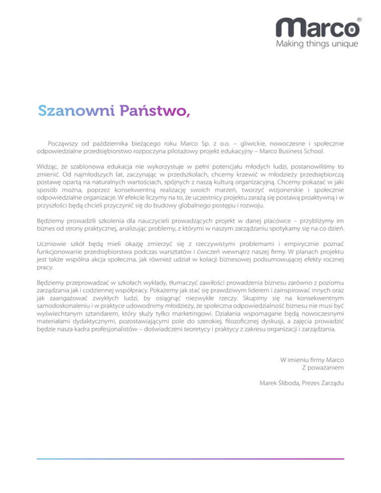 Począwszy od października bieżącego roku Marco Sp. z o.o. – gliwickie, nowoczesne i społecznie odpowiedzialne przedsiębiorstwo rozpoczyna pilotażowy projekt edukacyjny – Marco Business School. Widząc, że szablonowa edukacja nie wykorzystuje w pełni potencjału młodych ludzi, postanowiliśmy to zmienić. Od najmłodszych lat, zaczynając w przedszkolach, chcemy krzewić w młodzieży przedsiębiorczą postawę opartą na naturalnych wartościach, spójnych z naszą kulturą organizacyjną. Chcemy pokazać w jaki sposób można, poprzez konsekwentną realizację swoich marzeń, tworzyć wizjonerskie i społecznie odpowiedzialne organizacje. W efekcie liczymy na to, że uczestnicy projektu zarażą się postawą proaktywną i w przyszłości będą chcieli przyczynić się do budowy globalnego postępu i rozwoju. Będziemy prowadzili szkolenia dla nauczycieli prowadzących projekt w danej placówce – przybliżymy im biznes od strony praktycznej, analizując problemy, z którymi w naszym zarządzaniu spotykamy się na co dzień. Uczniowie szkół będą mieli okazję zmierzyć się z rzeczywistymi problemami i empirycznie poznać funkcjonowanie przedsiębiorstwa podczas warsztatów i ćwiczeń wewnątrz naszej firmy. W planach projektu jest także wspólna akcja społeczna, jak również udział w kolacji biznesowej podsumowującej efekty rocznej pracy. Będziemy przeprowadzać w szkołach wykłady, tłumaczyć zawiłości prowadzenia biznesu zarówno z poziomu zarządzania jak i codziennej współpracy. Pokażemy jak stać się prawdziwym liderem i zainspirować innych oraz jak zaangażować zwykłych ludzi, by osiągnąć niezwykłe rzeczy. Skupimy się na konsekwentnym samodoskonaleniu i w praktyce udowodnimy młodzieży, że społeczna odpowiedzialność biznesu nie musi być wyświechtanym sztandarem, który służy tylko marketingowi. Działania wspomagane będą nowoczesnymi materiałami dydaktycznymi, pozostawiającymi pole do szerokiej, filozoficznej dyskusji, a zajęcia prowadzić będzie nasza kadra profesjonalistów – doświadczeni teoretycy i praktycy z zakresu organizacji i zarządzania. W imieniu firmy Marco Z poważaniem Marek Śliboda, Prezes Zarządu