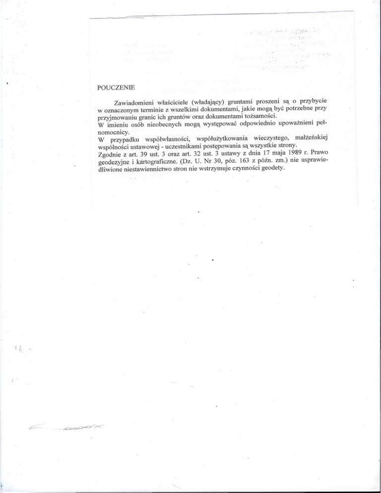 .:;'.> POUCZENIE Zawiadomieni właściciele (władający) gruntami proszeni są o przybycie w oznaczonym terminie z wszelkimi dokumentami, jakie mogą być potrzebne przy przyjmowaniu granic ich gruntów oraz dokumentami tożsamości. W imieniu osób nieobecnych mogą występować odpowiednio upoważnieni pełnomocnicy. W przypadku współwłasności, współużytkowania wieczystego, małżeńskiej wspólności ustawowej - uczestnikami postępowania są wszystkie strony. Zgodnie z art. 39 ust. 3 oraz art. 32 ust. 3 ustawy z dnia 17 maja 1989 r. Prawo geodezyjne i kartograficzne. (Dz. U. Nr 30, póz. 163 z późno zm.) nie usprawiedliwione niestawiennictwo stron nie wstrzymuje czynności geodety. 1 i( ~ -r.;~=--;-:'- <,
