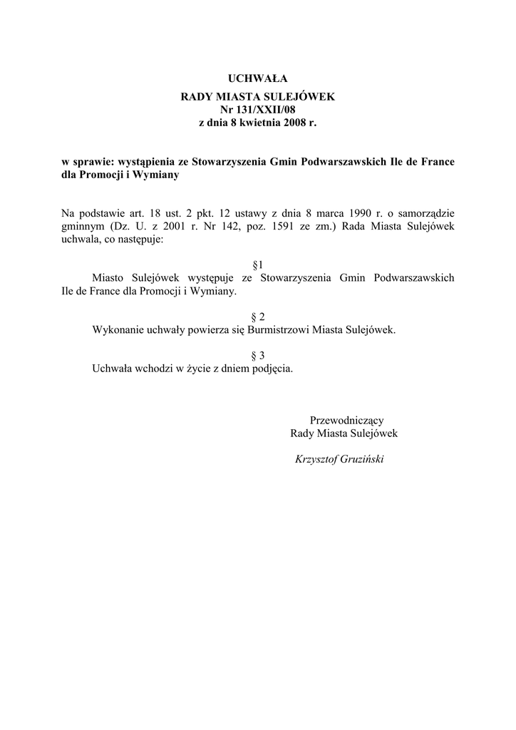 UCHWAŁA RADY MIASTA SULEJÓWEK Nr 131/XXII/08 z dnia 8 kwietnia 2008 r. w sprawie: wystąpienia ze Stowarzyszenia Gmin Podwarszawskich Ile de France dla Promocji i Wymiany Na podstawie art. 18 ust. 2 pkt. 12 ustawy z dnia 8 marca 1990 r. o samorządzie gminnym (Dz. U. z 2001 r. Nr 142, poz. 1591 ze zm.) Rada Miasta Sulejówek uchwala, co następuje: §1 Miasto Sulejówek występuje ze Stowarzyszenia Gmin Podwarszawskich Ile de France dla Promocji i Wymiany. §2 Wykonanie uchwały powierza się Burmistrzowi Miasta Sulejówek. §3 Uchwała wchodzi w Ŝycie z dniem podjęcia. Przewodniczący Rady Miasta Sulejówek Krzysztof Gruziński