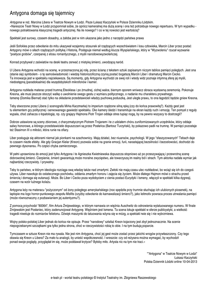 Antygona domaga się tajemnicy Antygona w reż. Marcina Libera w Teatrze Nowym w Łodzi. Pisze Łukasz Kaczyński w Polsce Dzienniku Łódzkim. «Nareszcie Teatr Nowy w Łodzi przypomniał sobie, że oprócz kameralnej ma dużą scenę i ona też potrzebuje nowego repertuaru. W tym wypadku nowego potraktowania klasycznej tragedii antycznej. Na ile nowego? I co w tej nowości jest wartością? Spektakl jest surowy, czasem dosadny, a żałoba jest w nim ukazana jako jedno z narzędzi państwa prawa Jeśli Sofokles przez odwołanie do mitu ukazywał wzajemny stosunek sił rządzących wszechświatem i losu człowieka, Marcin Liber przez postać Antygony mówi o siłach rządzących polityką i Historią. Postępuje niemal według klucza Wyspiańskiego, który w "Wyzwoleniu" rzucał wyzwanie "poetyce grobów", czerpanej z etosu romantycznego, z myśli narodowowyzwoleńczej. Konrad przybywał z zaświatów na deski teatru zerwać z mistyką śmierci, uwodzącą naród. U Libera Antygona wchodzi na scenę, w przeznaczoną jej rolę, przez ścianę z tekstem sztuki zapisanym niczym tablice pamięci poległych. Jest ona (stanie się) symbolem - o tę samoświadomość i wiedzę historiozoficzną czynią postać bogatszą Marcin Liber i dramaturg Marcin Cecko. Ta innowacja jest w spektaklu najciekawsza. Są momenty, gdy Antygona wychodzi ze swej roli i wtedy widz poznaje intymną sferę jej myśli, niedostępną (paradoksalnie) dla wszędobylskich mikrofonów i kamer. Antygona rozkłada materac przed trumną Eteoklesa i po żmudnej, cichej walce, biernym oporem wniwecz obraca wystawną ceremonię. Pokonuje Kreona, ale musi jeszcze stoczyć walkę o uwolnienie swego gestu z wymiaru politycznego, o nadanie mu charakteru prywatnego. Ismenę (Domika Biernat) stać tylko na okładanie przedstawicieli władzy puchową poduszką. Jest uległa prawu, to ona łagodzić będzie gniew Kreona. Teby stworzone przez Libera (i scenografa Mirka Kaczmarka) to imperium rządzone silną ręką (czy do końca prawowitą?). Każdy gest jest tu elementem gry politycznej i serwowanego gawiedzi spektaklu. Oko kamery śledzi i transmituje na ekran każdy ruch i emocję. Ten pomysł z reguły wypala, choć zahacza o łopatologię, np. czy grający Hajmona Piotr Trojan oddaje stres tupiąc nogą, by na pewno wszyscy to dostrzegli? Dobrze ustawione są sceny zbiorowe, z charyzmatycznym Piotrem Trojanem i te z udziałem chóru zuniformizowanych urzędników, który oddaje salwy honorowe, a którego przedstawiciele dopuszczani są przez Posłańca (Bartosz Turzyński), by pokazowo padli na trumnę. W pamięci pozostaje też Stasimon III o miłości, która runie na ofiary. Liber posługuje się aktorami niemal jak pionkami na szachownicy. Mają działać, bez niuansów, psychologii. W jego "sfaszyzowanych" Tebach daje to czasem niezłe efekty. Ale gdy Gracjan Kielar (Kreon) pozwala sobie na granie emocji, furii, narastającej bezsilności i bezcelowości, dochodzi do pewnego dysonansu. Po części chyba zamierzonego. W pełni uprawniona do emocji jest tylko Antygona i te Agnieszka Kwietniewska dopuszcza stopniowo aż po przeszywającą i przewrotną scenę dobrowolnej śmierci. Cierpienie, śmierć gwarantują może moralne zwycięstwo, ale towarzyszą im realny ból i strach. Tym aktorka nadała wymiar jak najbardziej rzeczywisty. I prywatny. Teby to państwo, w którym ideologia rozciąga swą władzę także nad zmarłymi. Zwłoki nie mają czasu ulec rozkładowi, bo wciąż się ich do czegoś używa. Liber nawołuje do ostatecznego pochówku, oddania zmarłym honoru i zajęcia się życiem. Może dlatego Hajmon mówi o strachu przed śmiercią i domaga się eutanazji. Może. Bo Liber i Cecko poza wydobyciem z cienia postaci Eurydyki i Ismeny, włączyli w spektakl kilka dygresji, czasem na wzór luźnego kolażu. Antygona leży na materacu "pożyczonym" od żony poległego amerykańskiego (noc spędziła przy trumnie słuchając ich ulubionych piosenek), na laptopie ma logo horror-punkowego zespołu Misfits (czyżby odwołanie do karnawalizacji śmierci?), jako leitmotiv powraca proces utrwalania pamięci (może równoznaczny z pozbawianiem jej autentyzmu?). Z pomocą przychodzi "80064", film Artura Żmijewskiego, w którym namawia on więźnia Auschwitz do odnowienia wytatuowanego numeru. W finale Żmijewskim jest Posłaniec, który zadenuncjował Antygonę. Więźniem jest Ismena. Ta scena lokuje spektakl w sferze publicystyki, a wielkość tragedii niweluje do rozmiarów felietonu. Dźwięk maszynki do tatuowania wżyna się w mózg, a spektakl rwie się i nie wybrzmiewa. Wojny polsko-polskiej Liber jednak do końca nie opisuje. Przez "narodowy" sztafaż Kreon kojarzony jest zbyt jednoznacznie. Na scenie niepogrzebanymi szczątkami gra tylko jedna strona, choć w rzeczywistości robią to obie. I na tym budują poparcie. Tymczasem w sztuce Kreon nie ma rywala. Nie jest nim Antygona, choć jej gest może zostać przez jakichś wrogów przywłaszczony. Czy tego obawia się Kreon u Libera? Za mało tu analogii, by unieść współczesność. I wreszcie: czy od reżysera można wymagać, by wychodził ponad swoje poglądy, przyglądał im się, może poddawał krytyce? Byłoby miło. Artysta nic na tym nie traci.» ""Antygona" w Teatrze Nowym w Łodzi" Łukasz Kaczyński Polska Dziennik Łódzki online 10-04-2013 e-teatr.pl - wortal teatru polskiego © Instytut Teatralny im. Zbigniewa Raszewskiego