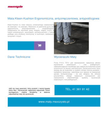Mata Kleen-Kushion Ergonomiczna, antyzmęczeniowa, antypoślizgowa Kleen-Kushion to mata robocza uniwersalnego zastosowania do wewnątrz i na zewnątrz. Wykonana ze spienionej gumy jest ergonomiczna, antyzmęczeniowa i antypoślizgowa. Dedykowana do stanowisk pracy stojącej, między innymi w halach produkcyjnych, warsztatach, pomieszczeniach z mokrą podłogą, przy produkcji chemicznej, w kuchniach, stołówkach, kantynach i innych. Dane Techniczne Wycieraczki Maty Firma P.H.U "DTJ" jest dystrybutorem najwyższej jakości wycieraczek wejściowych i mat podłogowych, zabezpieczających wszelkiego typu wejścia do budynków przed wnoszonymi na obuwiu zabrudzeniami. Zanieczyszczenia, które dostają się do budynków w szybkim tempie niszczą posadzki i wykładziny dywanowe, natomiasta kurz wpływa na awaryjność sprzętu komputerowego i nie jest obojętny dla zdrowia pracowników, dlatego najlepszym rozwiązaniem jest zastosowanie odpowiedniego systemy wycieraczek wejściowych i mat podłogowych.. Jeśli nie masz pewności, który produkt z naszej bogatej oferty Mat i Wycieraczek najbardziej odpowiada Twoim wymaganiom, chętnie doradzimy w doborze odpowiedniej maty lub wycieraczki. TEL. 41 361 91 42 www.maty.maxczysto.pl 1/1 Powered by TCPDF (www.tcpdf.org)