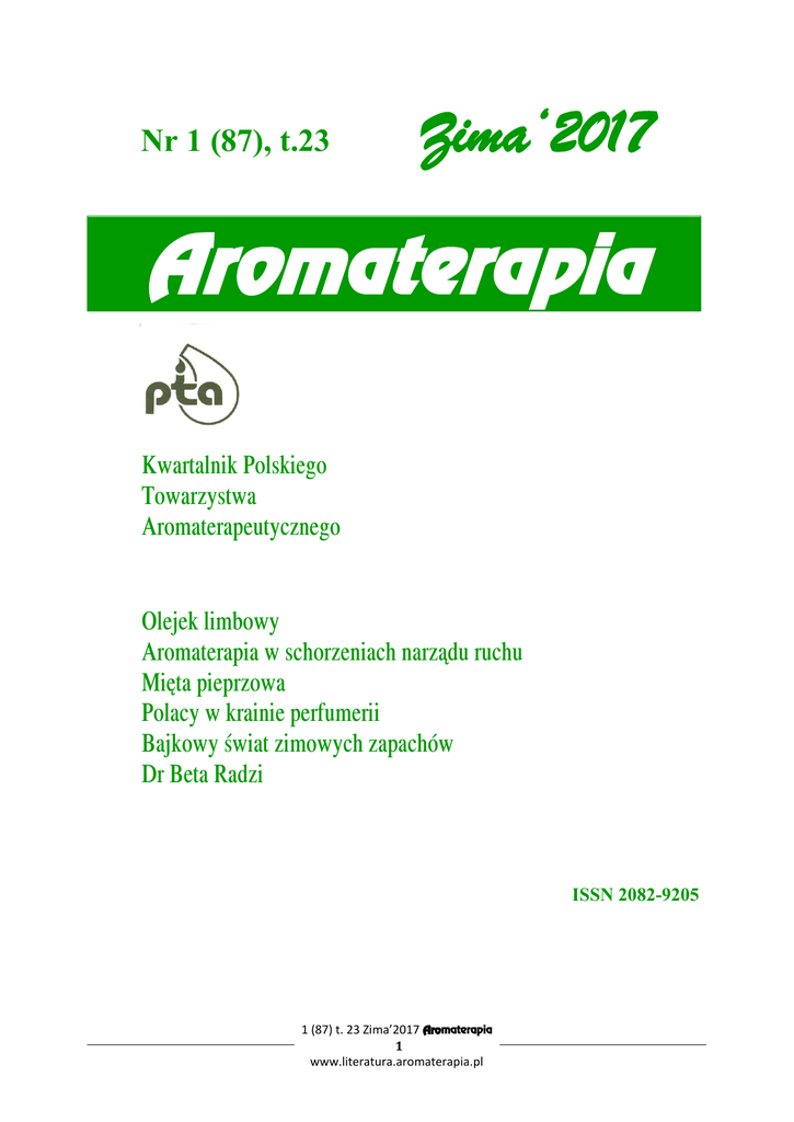 Nr 1 (87), t.23 Zima‘2017 Aromaterapia Kwartalnik Polskiego Towarzystwa Aromaterapeutycznego Olejek limbowy Aromaterapia w schorzeniach narządu ruchu Mięta pieprzowa Polacy w krainie perfumerii Bajkowy świat zimowych zapachów Dr Beta Radzi ISSN 2082-9205 1 (87) t. 23 Zima’2017 Aromaterapia 1 www.literatura.aromaterapia.pl W NUMERZE Najcenniejsze olejki dr inż. Anna Lis, inż. Aleksandra Kalinowska Olejek limbowy W artykule przedstawiono opis botaniczny limby (Pinus cembra L.) oraz otrzymywanie olejku eterycznego z jej gałązek. Podano charakterystykę zapachową, parametry fizykochemiczne i skład chemiczny olejku. Opisano zastosowanie olejku limbowego w aromaterapii i przemyśle kosmetycznym. Aromaterapia i nauka mgr Patrycja Molska-Wiszowata Aromaterapia w schorzeniach narządu ruchu W artykule opisano zastosowanie aromaterapii, czyli naturalnej metody leczniczej wykorzystywanej w fizjoterapii. Przedstawiono wykorzystanie naturalnych olejków eterycznych w takich schorzeniach narządu ruchu jak osteoporoza, zapalenie stawów i bóle różnego pochodzenia. Zaprezentowano także oddziaływanie wybranych olejków eterycznych na termoreceptory skórne. Historie ziołowe dr inż. Ewelina Pióro – Jabrucka Mięta pieprzowa – Mentha piperita (L.) Mięta pieprzowa (Mentha piperita) jest jedną z najważniejszych roślin aromatycznych z rodziny jasnotowatych. Jest powszechnie uprawiana w wielu rejonach świata. Liść oraz olejek mięty pieprzowej są szeroko stosowane w lecznictwie (choroby przewodu pokarmowego, infekcje dróg oddechowych), a także w przemyśle kosmetycznym i spożywczym. Polacy w krainie perfumerii, 60 lat firmy Pollena-Aroma Dr inż. Władysław S. Brud Przygoda z perfumami mgr Monika Kaleta Bajkowy świat zimowych zapachów Zima to czas spotkań z rodziną i przyjaciółmi. Czas prezentów. W poszukiwaniu wyjątkowego podarunku dla bliskiej nam osoby, warto zaglądnąć do perfumerii. Jakie nowinki pojawiły się na rynku oraz jakie trendy dominują w świecie zapachów? Na te i inne pytania znajdą Państwo odpowiedź w tym artykule. Dr Beta® Radzi Nawanianie pomieszczeń zimową porą W sezonie zimowym Dr Beta zaleca nawanianie i dezynfekowanie powierzchni w pomieszczeniach, w których spędzamy większość czasu o tej porze roku. Prezentuje cztery mieszanki olejków eterycznych stworzone z myślą o różnych preferencjach zapachowych, tak, aby każdy z nas mógł stosować to, co najbardziej mu odpowiada. Informacje Polskie Towarzystwo Aromaterapeutyczne - Z życia PTA - Konkurs Aromaterapia i Nauka - Kursy Aromaterapii pod patronatem PTA - Gdzie kupować olejki eteryczne najwyższej jakości - Gdzie korzystać z usług dyplomowanych aromaterapeutów Index Copernicus Informacje dla Autorów i Czytelników 5 15 32 44 63 69 72 75 76 77 81 83 84 1 (87) t. 23 Zima’2017 Aromaterapia 3 www.literatura.aromaterapia.pl CONTENTS Most valuable essentials oils Dr Anna Lis , Aleksandra Kalinowska Ch. E. Swiss stone pine oil A review. Essential oil of Swiss stone pine (Pinus cembra) is presented. Production, physicochemical data, chemical composition and application of the oil in aromatherapy and cosmetic industry are described. Aromatherapy and science Patrycja Molska - Wiszowata M. Sc. Aromatherapy in motor organ disorders The article describes the applications of aromatherapy, which is a natural healing method used in physiotherapy. The use of natural essential oils in such motor organ disorders as osteoporosis, arthritis and pain of various origins is presented. An impact of selected essential oils on the skin thermoreceptors is also discussed. Herbal stories Dr Ewelina Pióro – Jabrucka Pepermint – Mentha piperita (L.) Peppermint (Mentha piperita) is one of the most aromatic plant of the Lamiaceae. It is cultivated on numerous plantations in many regions of the world. The leaf and essential oil of peppermint are used in the medicine (gastrointestinal diseases, respiratory infections) and in the food and cosmetic industries. People of Poland in fragrance world, 60 anniversary of Pollena-Aroma Ltd Dr Władysław S. Brud Adventure of perfume Monika Kaleta M. Sc Fabulous world of winter perfumes Winter is the time of meetings with family and friends. The time of gifts. Perfumes are always a good idea for Christmas gifts. If you look for a unique gift for special person a perfume shop is a good way to your success. What new products have appeared on the market and what are dominate trends in the world of fragrances? In the article you will find an answer to this and many other questions. Dr Beta® Advises Odorization rooms in winter Dr. Beta recommended odorization and disinfecting surfaces in the rooms where we spend most of our time in winter. Four blend of essential oils designed for different fragrance preferences are presented. 5 15 32 44 63 69 Information - Polish Aromatherapy Association - Aromatherapy and Science Competition - Aromatherapy courses - Where to buy quality essentials oils - Where to find aromatherapeutists–useful addresses 72 75 76 77 81 Index Copernicus Information for Authors and for Readers 83 84 1 (87) t. 23 Zima’2017 Aromaterapia 4 www.literatura.aromaterapia.pl Dr Beta® Radzi NAWANIANIE POMIESZCZEŃ ZIMOWĄ PORĄ W sezonie zimowym Dr Beta zaleca nawanianie i dezynfekowanie powierzchni w pomieszczeniach, w których spędzamy większość czasu o tej porze roku. Prezentuje cztery mieszanki olejków eterycznych stworzone z myślą o różnych preferencjach zapachowych, tak, aby każdy z nas mógł stosować to, co najbardziej mu odpowiada. I znowu zima, musimy ogrzewać domostwa, miejsca pracy i wszystkie pomieszczenia, w których my i nasze rodziny o tej porze roku spędzamy większość dnia. Na spacer, ze względu na aurę wychodzimy tylko na chwilę, większość dnia przebywając w mieszkaniach. Tak ważne jest, aby było w nich ciepło, ale również świeżo, zdrowo i przyjemnie, a niestety, powietrze w nich jest suche, co w