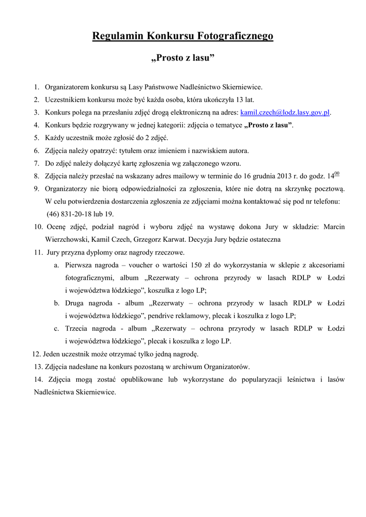 Regulamin Konkursu Fotograficznego „Prosto z lasu” 1. Organizatorem konkursu są Lasy Państwowe Nadleśnictwo Skierniewice. 2. Uczestnikiem konkursu może być każda osoba, która ukończyła 13 lat. 3. Konkurs polega na przesłaniu zdjęć drogą elektroniczną na adres: [email protected]. 4. Konkurs będzie rozgrywany w jednej kategorii: zdjęcia o tematyce „Prosto z lasu”. 5. Każdy uczestnik może zgłosić do 2 zdjęć. 6. Zdjęcia należy opatrzyć: tytułem oraz imieniem i nazwiskiem autora. 7. Do zdjęć należy dołączyć kartę zgłoszenia wg załączonego wzoru. 8. Zdjęcia należy przesłać na wskazany adres mailowy w terminie do 16 grudnia 2013 r. do godz. 1400 9. Organizatorzy nie biorą odpowiedzialności za zgłoszenia, które nie dotrą na skrzynkę pocztową. W celu potwierdzenia dostarczenia zgłoszenia ze zdjęciami można kontaktować się pod nr telefonu: (46) 831-20-18 lub 19. 10. Ocenę zdjęć, podział nagród i wyboru zdjęć na wystawę dokona Jury w składzie: Marcin Wierzchowski, Kamil Czech, Grzegorz Karwat. Decyzja Jury będzie ostateczna 11. Jury przyzna dyplomy oraz nagrody rzeczowe. a. Pierwsza nagroda – voucher o wartości 150 zł do wykorzystania w sklepie z akcesoriami fotograficznymi, album „Rezerwaty – ochrona przyrody w lasach RDLP w Łodzi i województwa łódzkiego”, koszulka z logo LP; b. Druga nagroda - album „Rezerwaty – ochrona przyrody w lasach RDLP w Łodzi i województwa łódzkiego”, pendrive reklamowy, plecak i koszulka z logo LP; c. Trzecia nagroda - album „Rezerwaty – ochrona przyrody w lasach RDLP w Łodzi i województwa łódzkiego”, plecak i koszulka z logo LP. 12. Jeden uczestnik może otrzymać tylko jedną nagrodę. 13. Zdjęcia nadesłane na konkurs pozostaną w archiwum Organizatorów. 14. Zdjęcia mogą zostać opublikowane lub wykorzystane do popularyzacji leśnictwa i lasów Nadleśnictwa Skierniewice.