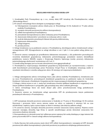 REGULAMIN WIRTUALNEGO BIURA GPP §1 1. Grudziądzki Park Przemysłowy sp. z o.o., zwany dalej GPP świadczy dla Przedsiębiorców, usługi ,,Wirtualnego Biura”. 2. W ramach wirtualnego biura dostępne są następujące usługi: 1) Udostępnienie (wynajem) adresu lokalu przy ul. Waryńskiego 32-36, budynek nr 75 jako adresu siedziby Przedsiębiorcy, 2) wynajem skrzynki pocztowej do odbioru korespondencji, 3) odbiór korespondencji Przedsiębiorcy, 4) przesyłanie korespondencji na adres wskazany przez Przedsiębiorcę 5) skanowanie dokumentów i przesłanie na wskazany adres e-mail, 6) wydruk dokumentów przesłanych faksem lub pocztą elektroniczną, 7) kopiowanie dokumentów, 8) usługi księgowe, 9) porady prawne, 3. Usługi świadczone są na podstawie umowy z Przedsiębiorcą, określającej zakres świadczonych usług i wynagrodzenie GPP. Wynagrodzenie za usługi określone w ust. 2 pkt 1-4 oraz pakiet usług, płatne są z góry. 4. Zawarcie umowy następuje po przedłożeniu dokumentu tożsamości, a dla podmiotów prowadzących wcześniej działalność gospodarczą: dokumentu potwierdzającego posiadanie numeru identyfikacji podatkowej, numeru REGON, wypisu z Krajowego Rejestru Sądowego (osoby prawne), dokumentu potwierdzającego okoliczność wymienioną w § 2 ust. 3. 4. Cennik usług dostępny jest na stronie internetowej www.gpp.grudziadz.pl. 5. Przedsiębiorcy rozpoczynający działalność gospodarczą bezpośrednio po wyrejestrowaniu z rejestru osób bezrobotnych prowadzonego przez Powiatowy Urząd Pracy w Grudziądzu otrzymują zniżki w wysokości określonej w cenniku usług przez okres 18 miesięcy od rozpoczęcia działalności. §2 1. Usługa udostępnienia adresu wirtualnego biura, jako adresu siedziby Przedsiębiorcy, świadczona jest na rzecz Przedsiębiorców, prowadzących działalność gospodarczą na podstawie wpisu do Centralnej Ewidencji i Informacji o Działalności Gospodarczej lub rozpoczynających działalność gospodarczą. 2. Usługa, o której mowa w ust. 1, może być świadczona również spółkom handlowym w organizacji oraz innym spółkom handlowym w przypadku, gdy posiadają inny adres zakładu głównego. 3. Adres wirtualnego biura nie może służyć jako adres przechowywania ksiąg podatkowych Przedsiębiorcy. 5. Zawarcie umowy na świadczenie usługi upoważnia GPP do przekazywania innym podmiotom posiadanych informacji o Przedsiębiorcy. §3 1. GPP wynajmuje skrzynki pocztowe umieszczone w budynku nr 75 przy ul. Waryńskiego 32-36 osobom fizycznym i prawnym, które zawrą umowę najmu na okres co najmniej 6 miesięcy lub na czas nieokreślony i zapłacą z góry czynsz najmu za okres 6 miesięcy (nie dotyczy pakietu usług). 2. Po zawarciu umowy, wynajęta skrzynka pocztowa zostanie oznaczona nazwą najemcy. Najemca może oznaczyć wynajętą skrzynkę logo firmy w sposób umożliwiający prosty demontaż oznaczenia bez naruszenia obudowy skrzynki. 3. Korespondencja ze skrzynki może być odbierana przez najemcę lub osobę działającą w jego imieniu lub przez pracownika GPP w ramach usługi odbioru korespondencji. §4 1. Osoba fizyczna lub osoba prawna może zlecić GPP odbiór korespondencji z wynajętej od GPP skrzynki pocztowej lub odbiór korespondencji z placówki pocztowej na podstawie odrębnego pełnomocnictwa. 2. Odbiór korespondencji będzie odbywał się w każdy dzień powszedni, a w przypadku przesyłek awizowanych, najpóźniej w ciągu dwóch dni roboczych od otrzymania awiza. 3. GPP będzie informował najpóźniej w ciągu dwóch dni roboczych o odbiorze korespondencji poprzez pocztę elektroniczną na adres podany w umowie. 4. GPP nie ponosi odpowiedzialności za nieodebranie informacji o posiadanej korespondencji zleceniodawcy. 5. Odebrana korespondencja będzie przechowywana przez czas określony w umowie lub przesyłana zleceniodawcy w ramach odrębnej usługi. 6. W przypadku upływu terminu przechowywania korespondencji, GPP przekaże korespondencję zleceniodawcy na jego koszt. 7. Odbiór przesyłek płatnych jest możliwy wyłącznie po przekazaniu GPP środków finansowych pozwalających na pokrycie kosztów odbioru. 8. GPP może uzależnić przesyłanie korespondencji od złożenia przez Przedsiębiorcę odpowiedniej zaliczki. §5 1. Korespondencja odbierana przez GPP na zasadach określonych w § 4, może być przesyłana na adres wskazany przez zleceniodawcę na jego koszt (przesyłką za pobraniem). 2. Przesyłanie korespondencji może następować w terminie określonym w umowie: 1) w ciągu dwóch dni roboczych od odbioru korespondencji, 2) w terminie podanym przez zleceniodawcę w umowie. 3. Zleceniodawca może upoważnić GPP do otwierania korespondencji i przesyłania kopii pocztą elektroniczną. §6 GPP świadczy usługi skanowania i kopiowania dokumentów zleceniodawcy oraz wydruku dokumentów przekazanych drogą poczty elektronicznej lub faksem. §7 1. GPP świadczy usługi księgowe w zakresie i na warunkach określonych w odrębnej umowie. 2. GPP organizuje dyżury specjalistów w celu udzielania drobnych porad dla przedsiębiorców. 3. Terminy dyżurów podawane są na stronie internetowej www.gpp.grudziadz.pl. §8 1. Każdorazowa zmiana postanowień niniejszego Regulaminu wymaga opublikowania na stronie internetowej wirtualnego biura. 2. Załącznikiem do regulaminu jest cennik usług wirtualnego biura. 3. Regulamin dostępny jest na stronie internetowej www.gpp.grudziadz.pl 4. Regulamin wchodzi w życie z dniem 16 września 2014 r.