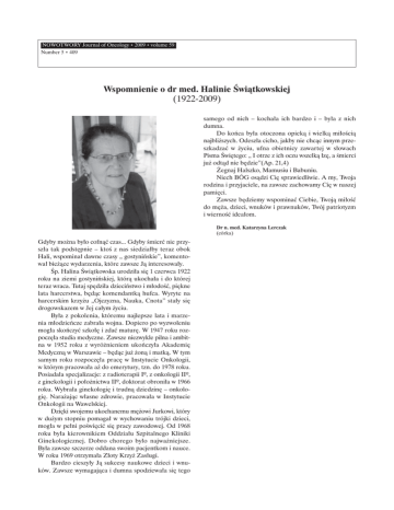 NOWOTWORY Journal of Oncology • 2009 • volume 59 Number 5 • 409 Wspomnienie o dr med. Halinie Świątkowskiej (1922-2009) samego od nich – kochała ich bardzo i – była z nich dumna. Do końca była otoczona opieką i wielką miłością najbliższych. Odeszła cicho, jakby nie chcąc innym przeszkadzać w życiu, ufna obietnicy zawartej w słowach Pisma Świętego: „ I otrze z ich oczu wszelką łzę, a śmierci już odtąd nie będzie”(Ap. 21,4) Żegnaj Halszko, Mamusiu i Babuniu. Niech BÓG osądzi Cię sprawiedliwie. A my, Twoja rodzina i przyjaciele, na zawsze zachowamy Cię w naszej pamięci. Zawsze będziemy wspominać Ciebie, Twoją miłość do męża, dzieci, wnuków i prawnuków, Twój patriotyzm i wierność ideałom. Dr n. med. Katarzyna Lerczak (córka) Gdyby można było cofnąć czas... Gdyby śmierć nie przyszła tak podstępnie – ktoś z nas siedziałby teraz obok Hali, wspominał dawne czasy „ gostynińskie”, komentował bieżące wydarzenia, które zawsze Ją interesowały. Śp. Halina Świątkowska urodziła się 1 czerwca 1922 roku na ziemi gostynińskiej, którą ukochała i do której teraz wraca. Tutaj spędziła dzieciństwo i młodość, piękne lata harcerstwa, będąc komendantką hufca. Wyryte na harcerskim krzyżu „Ojczyzna, Nauka, Cnota” stały się drogowskazem w Jej całym życiu. Była z pokolenia, któremu najlepsze lata i marzenia młodzieńcze zabrała wojna. Dopiero po wyzwoleniu mogła skończyć szkołę i zdać maturę. W 1947 roku rozpoczęła studia medyczne. Zawsze niezwykle pilna i ambitna w 1952 roku z wyróżnieniem ukończyła Akademię Medyczną w Warszawie – będąc już żoną i matką. W tym samym roku rozpoczęła pracę w Instytucie Onkologii, w którym pracowała aż do emerytury, tzn. do 1978 roku. Posiadała specjalizacje: z radioterapii Iº, z onkologii IIº, z ginekologii i położnictwa IIº, doktorat obroniła w 1966 roku. Wybrała ginekologię i trudną dziedzinę – onkologię. Narażając własne zdrowie, pracowała w Instytucie Onkologii na Wawelskiej. Dzięki swojemu ukochanemu mężowi Jurkowi, który w dużym stopniu pomagał w wychowaniu trójki dzieci, mogła w pełni poświęcić się pracy zawodowej. Od 1968 roku była kierownikiem Oddziału Szpitalnego Kliniki Ginekologicznej. Dobro chorego było najważniejsze. Była zawsze szczerze oddana swoim pacjentkom i nauce. W roku 1969 otrzymała Złoty Krzyż Zasługi. Bardzo cieszyły Ją sukcesy naukowe dzieci i wnuków. Zawsze wymagająca i dumna spodziewała się tego