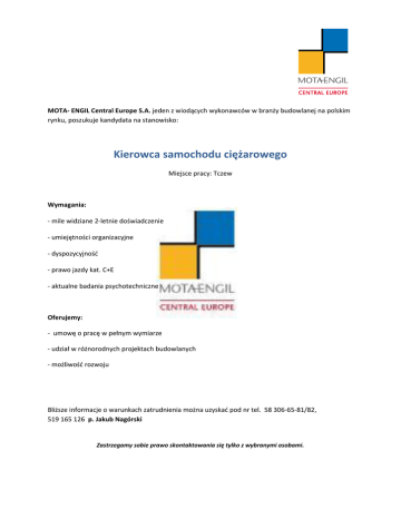 MOTA- ENGIL Central Europe S.A. jeden z wiodących wykonawców w branży budowlanej na polskim rynku, poszukuje kandydata na stanowisko: Kierowca samochodu ciężarowego Miejsce pracy: Tczew Wymagania: - mile widziane 2-letnie doświadczenie - umiejętności organizacyjne - dyspozycyjność - prawo jazdy kat. C+E - aktualne badania psychotechniczne Oferujemy: - umowę o pracę w pełnym wymiarze - udział w różnorodnych projektach budowlanych - możliwość rozwoju Bliższe informacje o warunkach zatrudnienia można uzyskać pod nr tel. 58 306-65-81/82, 519 165 126 p. Jakub Nagórski Zastrzegamy sobie prawo skontaktowania się tylko z wybranymi osobami.