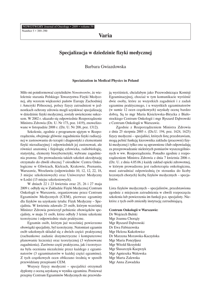 NOWOTWORY Journal of Oncology • 2009 • volume 59 Number 5 • 389–390 Varia Specjalizacja w dziedzinie fizyki medycznej Barbara Gwiazdowska Speciaization in Medical Physics in Poland Miło mi poinformować czytelników Nowotworów, że wieloletnie starania Polskiego Towarzystwa Fizyki Medycznej, aby wzorem większości państw Europy Zachodniej i Ameryki Północnej, polscy fizycy zatrudnieni w jednostkach ochrony zdrowia mogli uzyskiwać specjalizację w dziedzinie fizyki medycznej, zostały uwieńczone sukcesem. W 2002 r. ukazało się odpowiednie Rozporządzenie Ministra Zdrowia (Dz. U. Nr 173, poz. 1419), znowelizowane w listopadzie 2008 r. (Dz. U. Nr 208, poz. 1312). Szkolenie, zgodnie z programem ujętym w Rozporządzeniu, obejmuje głównie zagadnienia fizyki radiacyjnej w zastosowaniu do terapii i diagnostyki z elementami fizyki nieradiacyjnej i odpowiednich jej zastosowań, ale również anatomię i fizjologię człowieka, radiobiologię, statystykę, elementy biocybernetyki, wybrane zagadnienia prawne. Do prowadzenia takich szkoleń akredytację otrzymało do chwili obecnej 7 ośrodków: Centra Onkologiczne w Gliwicach, Kielcach, Krakowie, Poznaniu, Warszawie, Wrocławiu (odpowiednio 10, 12, 12, 22, 18, 3 miejsc szkoleniowych) oraz Uniwersytet Medyczny w Łodzi (15 miejsc szkoleniowych). W dniach 22 i 23 kwietnia oraz 25, 26 i 27 maja 2009 r. odbyły się w Zakładzie Fizyki Medycznej Centrum Onkologii w Warszawie, organizowane przez Centrum Egzaminów Medycznych (CEM), pierwsze egzaminy dla fizyków na uzyskanie tytułu: Fizyk Medyczny – Specjalista. W kwietniu zdawało 25 osób, którym wcześniej Minister Zdrowia powierzył pełnienie obowiązków specjalisty, w maju 31 osób, które odbyły 3 letnie szkolenie teoretyczne i odpowiednie staże praktyczne. Egzamin osób, którym już wcześniej powierzono obowiązki specjalisty, był teoretyczny. Natomiast egzamin osób szkolonych składał się z dwóch części: praktycznej (rachunkowe zadanie dozymetryczne i komputerowe planowanie leczenia) oraz teoretycznej (3 wylosowane zagadnienia). Zarówno część praktyczna, jak i teoretyczna była oceniana niezależnie przez każdego z egzaminatorów (3 egzaminatorów w każdej części egzaminu). Z tych cząstkowych ocen obliczano średnią w sposób przewidziany przepisami CEM. Wszyscy fizycy medyczni – specjaliści otrzymali dyplomy z oceną uzyskaną w wyniku egzaminu. Ponieważ przepisy Centrum Egzaminów Medycznych nie przewidu- ją wyróżnień, chciałabym jako Przewodnicząca Komisji Egzaminacyjnej, chociaż w tym komunikacie wyróżnić dwie osoby, które ze wszystkich zagadnień i z zadań egzaminu praktycznego, i u wszystkich egzaminatorów (w sumie 12 ocen cząstkowych) uzyskały ocenę bardzo dobrą. Są to mgr Maria Kisielewska-Birycka z Białostockiego Centrum Onkologii i mgr Ryszard Dąbrowski z Centrum Onkologii w Warszawie. Zgodnie z Rozporządzeniem Ministra Zdrowia z dnia 25 sierpnia 2005 r. (Dz.U. 194, poz. 1624, 1625) fizycy medyczni – specjaliści, których listę przedstawiam, mogą pełnić funkcję kierownika zakładu (pracowni) fizyki medycznej i tylko one są uprawnione i/lub odpowiadają za przeprowadzanie niektórych pomiarów wyszczególnionych w ww. Rozporządzeniu. Ponadto zgodnie z rozporządzeniem Ministra Zdrowia z dnia 7 kwietnia 2006 r. (Dz. U. z dnia 4.05.06.) każdy zakład opieki zdrowotnej, w którym prowadzona jest radioterapia onkologiczna, musi zatrudniać odpowiednią (w stosunku do liczby leczonych chorych) liczbę fizyków medycznych – specjalistów. Lista fizyków medycznych – specjalistów, przedstawiona zgodnie z miejscem zatrudnienia w chwili rozpoczęcia szkolenia lub powierzenia im funkcji p.o. specjalisty. Niektóre z tych osób zmieniły instytucję zatrudniającą. Centrum Onkologii w Warszawie: Dr Wojciech Bulski Mgr Joanna Chorąży Mgr Ryszard Dąbrowski Dr Ewa Fabiszewska Mgr Helena Kukołowicz Dr Marzena Morawska-Kaczyńska Mgr Maria Poncyljusz Mgr Witold Skrzyński Mgr Ślusarczyk-Kacprzyk Mgr Agnieszka Walewska Mgr Marta Zalewska Mgr Anna Zawadzka 390 Lubuski Ośrodek Onkologii w Zielonej Górze Mgr Maciejewska-Witczak Centrum Onkologii w Krakowie: Dr Edward Byrski Mgr Anna Dąbrowska-Kołodziejczyk Mgr Eleonora Góra Dr Jan Lesiak Mgr Dorota Miszczak Prof. Michał Waligórski Szpital im. S. Leszczyńskiego w Katowicach Mgr Marcin Dybek Mgr Aneta Kawa-Iwanicka Dr Włodzimierz Łobodziec Centrum Onkologii w Gliwicach Dr Andrzej Orlef Dr hab. Maria Sokół Dr hab. Krzysztof Ślosarek Uniwersytet Medyczny w Łodzi Dr hab. Anna Płachcińska Dr Krzysztof Rybka Dr hab. Maria Staniszewska Świętokrzyskie Centrum Onkologii w Kielcach Dr hab. Janusz Braziewicz Mgr Krzysztof Lis Dr Andrzej Dąbrowski Dr Paweł Kukołowicz Mgr Joanna Miedzińska Mgr Sylwia Zielińska-Dąbrowska Uniwersytet Medyczny w Poznaniu Dr Anna Wyszomirska Wielkopolskie Centrum Onkologii w Poznaniu Dr Jerzy Kierzkowki Dr Grażyna Kosicka Mgr Marcin Litoborski Prof. Julian Malicki Dr Tomasz Piotrowski Dr Grzegorz Zwierzchowski Zachodnio-Pomorskie Centrum Onkologii w Szczecinie Mgr Anna Barwińska Dr Mirosław Lewocki Mgr Waldemar Kot Dolnośląskie Centrum Onkologii we Wrocławiu Dr Marzena Janiszewska Dr Dominika Oborska-Kumaszyńska Beskidzkie Centrum Onkologii w Bielsku-Białej Mgr Jerzy Gałuszka Mgr Łukasz Giźlar Podkarpacki Ośrodek Onkologiczny w Brzozowie Mgr Bogusława Kuźniar Mgr Marta Szerszeń Białostockie Centrum Onkologii Mgr Maria Kisielewska-Birycka Warmińsko-Mazurskie Centrum Onkologii w Olsztynie Mgr Joanna Minczewska Centrum Onkologii Ziemi Lubelskiej w Lublinie Dr Cezary Nalewajko Centrum Onkologii w Bydgoszczy Dr Renata Kabacińska Uniwersytet Medyczny we Wrocławiu Dr Mieczysława Jurczyk Instytut Kardiologii w Warszawie Dr hab. Anna Teresińska Następny egzamin przewidziany jest na jesień 2009 r. Prof. dr hab. Barbara Gwiazdowska Krajowy Konsultant w Dziedzinie Fizyki Medycznej