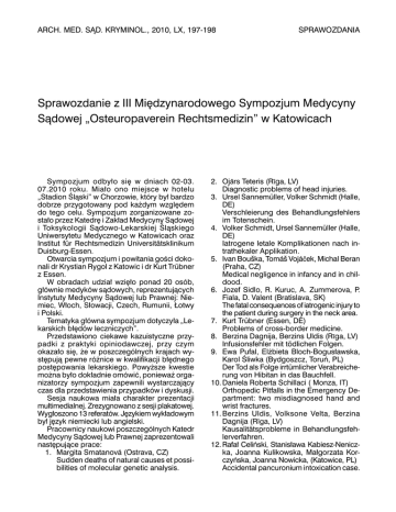 ARCH. MED. SĄD. KRYMINOL., 2010, LX, 197-198 SPRAWOZDANIA Sprawozdanie z III Międzynarodowego Sympozjum Medycyny Sądowej „Osteuropaverein Rechtsmedizin” w Katowicach Sympozjum odbyło się w dniach 02-03. 07.2010 roku. Miało ono miejsce w hotelu „Stadion śląski” w Chorzowie, który był bardzo dobrze przygotowany pod każdym względem do tego celu. Sympozjum zorganizowane zostało przez Katedrę i Zakład Medycyny Sądowej i Toksykologii Sądowo-Lekarskiej śląskiego Uniwersytetu Medycznego w Katowicach oraz Institut für Rechtsmedizin Universitätsklinikum Duisburg-Essen. Otwarcia sympozjum i powitania gości dokonali dr Krystian Rygol z Katowic i dr Kurt Trübner z Essen. W obradach udział wzięło ponad 20 osób, głównie medyków sądowych, reprezentujących Instytuty Medycyny Sądowej lub Prawnej: Niemiec, Włoch, Słowacji, Czech, Rumunii, Łotwy i Polski. Tematyka główna sympozjum dotyczyła „Lekarskich błędów leczniczych”. Przedstawiono ciekawe kazuistyczne przypadki z praktyki opiniodawczej, przy czym okazało się, że w poszczególnych krajach występują pewne różnice w kwalifikacji błędnego postępowania lekarskiego. Powyższe kwestie można było dokładnie omówić, ponieważ organizatorzy sympozjum zapewnili wystarczający czas dla przedstawienia przypadków i dyskusji. Sesja naukowa miała charakter prezentacji multimedialnej. Zrezygnowano z sesji plakatowej. Wygłoszono 13 referatów. Językiem wykładowym był język niemiecki lub angielski. Pracownicy naukowi poszczególnych Katedr Medycyny Sądowej lub Prawnej zaprezentowali następujące prace: 1. Margita Smatanová (Ostrava, CZ) Sudden deaths of natural causes et possibilities of molecular genetic analysis. 2. Ojārs Teteris (Rīga, LV) Diagnostic problems of head injuries. 3. Ursel Sannemüller, Volker Schmidt (Halle, DE) Verschleierung des Behandlungsfehlers im Totenschein. 4. Volker Schmidt, Ursel Sannemüller (Halle, DE) Iatrogene letale Komplikationen nach intrathekaler Applikation. 5. Ivan Bouška, Tomáš Vojáček, Michal Beran (Praha, CZ) Medical negligence in infancy and in childood. 6. Jozef Sidlo, R. Kuruc, A. Zummerova, P. Fiala, D. Valent (Bratislava, SK) The fatal consequences of iatrogenic injury to the patient during surgery in the neck area. 7. Kurt Trübner (Essen, DE) Problems of cross-border medicine. 8. Berzina Dagnija, Berzins Uldis (Rīga, LV) Infusionsfehler mit tödlichen Folgen. 9. Ewa Pufal, Elżbieta Bloch-Bogusławska, Karol śliwka (Bydgoszcz, Toruń, PL) Der Tod als Folge irrtümlicher Verabreicherung von Hibitan in das Bauchfell. 10. Daniela Roberta Schillaci ( Monza, IT) Orthopedic Pitfalls in the Emergency Department: two misdiagnosed hand and wrist fractures. 11. Berzins Uldis, Volksone Velta, Berzina Dagnija (Rīga, LV) Kausalitätsprobleme in Behandlungsfehlerverfahren. 12. Rafał Celiński, Stanisława Kabiesz-Neniczka, Joanna Kulikowska, Małgorzata Korczyńska, Joanna Nowicka, (Katowice, PL) Accidental pancuronium intoxication case. 198 Krystian Rygol 13. Krystian Rygol, Christian Jabłoński, Czesław Chowaniec (Katowice, PL) Vorschriftsmässige Diagnose - fehlerhafte, zum Tode führende, ärztliche Behandlung. Streszczenia poszczególnych prac zamieszczono w materiałach zjazdowych. Są one jeszcze aktualnie dostępne na stronie internetowej: http://www.medsad.republika.pl/med.html Gospodarze zapewnili również program towarzyszący sympozjum, umożliwiając zwiedzenie Nr 2-3 podziemi śląska, tj. zabytkowej „Kopalni Srebra” w Tarnowskich Górach i kopalni węgla kamiennego „Królowa Luiza” w Zabrzu. Udało się również zwiedzić Górnośląski Park Etnograficzny i spotkać na wspólnej biesiadzie w „Karczmie u Brożka”. Na zakończenie przyjęto propozycję organizacji kolejnego IV Sympozjum w Republice Rumunii. Dr n. med. Krystian Rygol Adiunkt Katedry Medycyny Sądowej