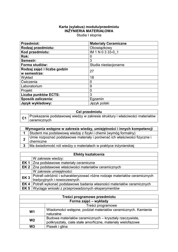 Karta (sylabus) modułu/przedmiotu INŻYNIERIA MATERIAŁOWA Studia I stopnia Przedmiot: Rodzaj przedmiotu: Kod przedmiotu: Rok: Semestr: Forma studiów: Rodzaj zajęć i liczba godzin w semestrze: Wykład Ćwiczenia Laboratorium Projekt Liczba punktów ECTS: Sposób zaliczenia: Język wykładowy: Materiały Ceramiczne Obowiązkowy IM 1 N 0 3 33-0_1 II 3 Studia niestacjonarne 27 18 0 9 0 3 Egzamin Język polski Cel przedmiotu Przekazanie podstawowej wiedzy w zakresie struktury i właściwości materiałów C1 ceramicznych Wymagania wstępne w zakresie wiedzy, umiejętności i innych kompetencji 1 Student ma podstawową wiedzę z fizyki i chemii (wymóg formalny) Umie rozpoznać podstawowe materiały i porównać ich właściwości fizyczne i 2 chemiczne 3 Ma świadomość roli wiedzy o materiałach w praktyce inżynierskiej Efekty kształcenia EK 1 EK 2 EK 3 EK 4 EK 5 W zakresie wiedzy: Zna podstawowe materiały ceramiczne Zna podstawowe właściwości materiałów ceramicznych W zakresie umiejętności: Potrafi odróżnić i scharakteryzować różne rodzaje materiałów ceramicznych tradycyjnych i nowoczesnych Potrafi wykonać podstawowe badania własności materiałów ceramicznych Wyciąga wnioski z przeprowadzonych eksperymentów W1 W2 W3 Treści programowe przedmiotu Forma zajęć – wykłady Treści programowe Wiadomości wstępne, podział materiałów ceramicznych. Kamienie naturalne Budowa materiałów ceramicznych – kryształy rzeczywiste, polikryształy, ciała stałe amorficzne, materiały wielofazowe Piasek i glina W4 W5 W6 W7 W8 W9 W10 W11 W12 W13 W14 W15 W16 W17 W18 L1 L2 L3 L4 L5 1 2 Cement Cegły i wyroby z gliny Beton Silikaty i beton komórkowy Ceramiczne materiały włókniste – wełna, wata i inne Właściwości elektryczne, magnetyczne i optyczne ceramik Właściwości cieplne: przewodnictwo, rozszerzalność i naprężenia cieplne Właściwości mechaniczne – odkształcenie sprężyste i plastyczne, dekohezja, twardość Szkło: mikrostruktura i właściwości szkieł, technologia szkła, szkła o specjalnych Ceramika węglowa. Materiały spiekane Supertwarde niemetaliczne materiały narzędziowe: diament i azotek boru i inne Ceramika kompozytowa, cermetale Ceramika szlachetna: porcelana, fajans i porcelit Ceramika ogniotrwała i ceramika odporna chemicznie Zaliczenie Forma zajęć – laboratoria Treści programowe BHP. Wprowadzenie. Badania cieplne materiałów ceramicznych Wytwarzanie mieszanek betonowych o różnorodnym składzie Badanie wytrzymałości szkła metodami statycznymi i dynamicznymi Badanie próbek betonu o różnorodnym składzie Podsumowanie i zaliczenie Metody dydaktyczne Wykład z prezentacjami multimedialnymi Laboratorium: metoda praktyczna oparta na obserwacji i analizie, metoda aktywizująca związana z praktycznym działaniem studentów w celu rozwiązania postawionych problemów. Obciążenie pracą studenta Średnia liczba godzin na zrealizowanie Forma aktywności aktywności Godziny kontaktowe z wykładowcą, 27 W tym: Udział w wykładach 18 Udział w laboratoriach 9 Praca własna studenta, w tym: 43 Przygotowanie się do laboratorium 20 Przygotowanie się do egzaminu 23 Łączny czas pracy studenta 70 Sumaryczna liczba punktów ECTS dla 3 przedmiotu Liczba punktów ECTS w ramach zajęć 1 o charakterze praktycznym (ćwiczenia, laboratoria, projekty) 1 2 3 4 5 6 1 2 3 4 Literatura podstawowa Dobrzański L.A.: Materiały inżynierskie i projektowanie materiałowe. Podstawy nauki o materiałach i metaloznawstwo. WNT Warszawa 2006 M. Kordek: Ceramika szlachetna i techniczna, UWND AGH, Kraków 2001 R. Pampuch, Materiały ceramiczne – zarys nauki o materiałach nieorganiczno niemetalicznych, PWN, Warszawa 1988 R. Pampuch: Budowa i właściwości materiałów ceramicznych, Wyd. AGH, Kraków 1995 A. Olszyna: Ceramika supertwarda, Oficyna Wyd. PW, Warszawa 2001 M. Wysiecki: Nowoczesne materiały narzędziowe stosowane w obróbce skrawaniem, WNT, Warszawa 1997 Literatura uzupełniająca Ashby M.F., Jones D.R.H., Materiały inżynierskie, tom 1, 2, 3, WNT, Warszawa, 1996 K. E. Oczoś: Kształtowanie ceramicznych materiałów technicznych, Oficyna Wydawnicza Politechniki Rzeszowskiej, Rzeszów 1996 J. Śleziona: Podstawy technologii kompozytów, Wyd. Politechniki Śląskiej, Gliwice 1998 M. Jurczyk, J. Jakubowicz: Nanomateriały ceramiczne, Wyd. Pol. Poz. Poznań Macierz efektów kształcenia Odniesienie danego efektu kształcenia do Efekt efektów Cele kształcenia zdefiniowanych przedmiotu dla całego programu (PEK) IM1A_U62 EK1 C1 (+) IM1A_W61 EK2 C1 (++) IM1A_U61 (++) EK3 C1 IM1A_U62 (++) IMA_U67 (+++) EK4 C1 IMA_U68 (+++) IM1A_U65 EK5 C1 (+) Treści Narzędzia programowe dydaktyczne Sposób oceny W1– W26 1, 2 O3, O1, O2 W1– W26 1, 2 O3, O1, O2 W1– W26, L2 – L6 1, 2 O3, O1, O2 W1– W26, L2 – L6 1, 2 O3 W1– W26, L2 – L6 1, 2 O3 Metody i kryteria oceny Symbol metody oceny Opis metody oceny Próg zaliczeniowy O1 O2 O3 Zaliczenie pisemne lub ustne z wykładu Zaliczenia ustne z laboratorium Sprawozdania z wykonanych ćwiczeń laboratoryjnych Autor dr inż. Leszek Gardyński programu: Adres e-mail: [email protected] Jednostka Katedra Inżynierii Materiałowej, WM organizacyjna: 50% 50% 100%