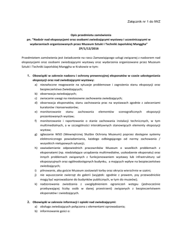 Załącznik nr 1 do IWZ Opis przedmiotu zamówienia pn. ”Nadzór nad ekspozycjami oraz osobami zwiedzającymi wystawy i uczestniczącymi w wydarzeniach organizowanych przez Muzeum Sztuki i Techniki Japońskiej Manggha” ZP/1/12/2016 Przedmiotem zamówienia jest świadczenie na rzecz Zamawiającego usługi związanej z nadzorem nad ekspozycjami oraz osobami zwiedzającymi wystawy oraz wydarzenia organizowane przez Muzeum Sztuki i Techniki Japońskiej Manggha w Krakowie w tym: 1. Obowiązki w zakresie nadzoru i ochrony prewencyjnej eksponatów w czasie udostępniania ekspozycji oraz nad zwiedzającymi wystawy: a) niezwłoczne reagowanie na sytuacje problemowe i zagrożenia stanu ekspozycji oraz bezpieczeństwa Zwiedzających; b) obserwacja zwiedzających; c) zwracanie uwagi na niestosowne zachowania zwiedzających; d) obserwacja eksponatów, stanu zachowania prac na wystawach zgodnie z zaleceniami kuratorów i konserwatorów; e) monitorowanie stanu zachowania elementów scenograficznych ekspozycji prezentowanych wystaw; f) monitorowanie i raportowanie o stanie zachowania instalacji technicznych, w tym multimedialnych, a w szczególności interaktywnych stanowiących elementy ekspozycji wystaw; g) zgłaszanie WSO (Wewnętrznej Służbie Ochrony Muzeum) poprzez dostępne systemy elektronicznego powiadamiania, każdego odbiegającego od normy zachowania / wszystkich nietypowych sytuacji; h) zawiadamianie odpowiednich pracowników Muzeum o wszelkich problemach z eksponatami (np. niedziałające urządzenia multimedialne, uszkodzenie eksponatu) oraz innych problemach związanych z funkcjonowaniem wystawy lub infrastruktury sal ekspozycyjnych oraz ogólnodostępnych budynku, a mających wpływ na bezpieczeństwo zwiedzających; i) pilnowanie, aby goście Muzeum zostawiali torby oraz okrycia wierzchnie w szatni; j) nie wpuszczanie zwierząt do galerii (wyjątek: zgodnie z prawem, psy przewodnickie mogą być wprowadzane do budynków publicznych, w tym do muzeów); k) nadzorowania zwiedzania z uwzględnieniem ograniczeń wstępu (jednocześnie przebywającej liczby osób w danej przestrzeni) związanych z bezpieczeństwem eksponatów i zwiedzających. 2. Obowiązki w zakresie informacji i opieki nad zwiedzającymi: a) obsługa zwiedzających połączona z elementami oprowadzania; b) informowanie gości o: c) d) e) f) g) h) i) j) k) - aktualnych wystawach (na podstawowym poziomie merytorycznym, o czym są, kto jest kuratorem, artystą); - aktualnych i zbliżających się wydarzeniach poza wystawienniczych (oferta edukacyjna, warsztaty, koncerty); - muzeum (jego historii, architekturze, fundatorach); - zapleczu (toalety, miejsca odpoczynku, księgarni i sklepiku, restauracja, szatnia, windy); - cenach biletów; obsługa recepcji i informacji, szatni i innych miejsc wymagających bezpośredniej obsługi zwiedzających; kierowanie ruchem zwiedzających przy przestrzeganiu ograniczeń i zakazów oraz informowanie zwiedzających o zasadach zwiedzania przedstawionych w regulaminie zwiedzania Muzeum Manggha; komunikowanie się ze zwiedzającymi, w tym osobami nie mówiącymi w języku polskim lub z dysfunkcją wzroku lub słuchu w celu zapewnienia im bezpiecznego i komfortowego zwiedzania jak i bezpieczeństwa ekspozycji. obsługa urządzeń multimedialnych i interaktywnych stanowiących elementy ekspozycji; orientacja w przestrzeni ekspozycyjnej; opieka w trudnych sytuacjach nad osobami starszymi, dziećmi, osobami z niepełnosprawnością i innych; pomoc w prowadzeniu zajęć edukacyjnych we współpracy z Działem edukacji; organizacja i obsługa widowni przy wydarzeniach kulturalnych jak: koncerty, przedstawienia, eventy organizowane przez Muzuem oprowadzanie grup zorganizowanych. 3. Inne obowiązki związane z obsługą i utrzymaniem porządku: a) wskazanie osoby odpowiedzialnej za koordynację prac osób sprawujących obsługę oraz upoważnionej do bezpośredniego kontaktu z przedstawicielem Muzeum, b) liczenie frekwencji na wystawach oraz wydarzeniach dodatkowych; c) bieżące raportowanie o stanie ekspozycji, stanu zachowania elementów scenograficznych ekspozycji prezentowanych wystaw; d) zbieranie oraz raportowanie informacji o funkcjonalności wystaw, scenografii i architektury wystaw pod kątem potrzeb, trudności i zainteresowania zwiedzających, celem usprawnienia pracy Muzeum i zwiększenia komfortu i bezpieczeństwa zwiedzających. e) bieżące utrzymywanie czystości na ekspozycjach, szatniach oraz przestrzeniach wspólnych, f) pomoc pracownikom Muzeum przy organizacji wystaw, wernisaży i dodatkowych eventów, g) nadzór nad oznakowaniem informacyjnym galerii h) dbanie o pozytywny wizerunek Muzeum. 4. Osoby wykonujące usługę muszą: a) posiadać znajomość języka angielskiego w stopniu co najmniej komunikatywnym. Zamawiający zastrzega sobie prawo do weryfikacji tego warunku każdorazowo przed dopuszczeniem danej osoby do wykonywania czynności; b) posiadać estetyczny ubiór oraz identyfikatory osobiste; c) co najmniej dwie osoby w zespole przeznaczanym do realizacji usługi (w tym osoba, o której mowa w pkt 3.a.) powinny pracować w oparciu o umowę o pracę oraz posiadać nie krótsze niż roczne doświadczenie w realizacji tego typu usługi w galerii sztuki, posiadać wykształcenie wyższe o stopniu co najmniej licencjata; d) co najmniej dwie osoby w zespole przeznaczonym do realizacji usługi powinny posiadać znajomość jednego z następujących języków: japońskiego, chińskiego, koreańskiego - w stopniu co najmniej komunikatywnym; e) przejść szkolenie ECHOCAST lub równoważne organizowane przez NIMOZ; f) prezentować wysoki poziom kultury osobistej i kultury języka. Zamawiający zastrzega sobie prawo do weryfikacji tego wizerunku każdorazowo przed dopuszczeniem danej osoby do wykonywania czynności; g) znać zasady obsługi klienta; h) mieć doświadczenie w pracy wymagającej bezpośredniego kontaktu i opieki nad grupami dzieci i dorosłych, także niepełnos