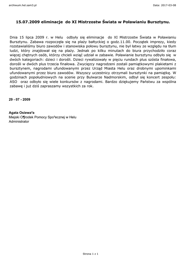 archiwum.hel.sam3.pl Data: 2017-03-08 15.07.2009 eliminacje do XI Mistrzostw Świata w Poławianiu Bursztynu. Dnia 15 lipca 2009 r. w Helu odbyły się eliminacje do XI Mistrzostw Świata w Poławianiu Bursztynu. Zabawa rozpoczęła się na plaży bałtyckiej o godz.11.00. Początek imprezy, kiedy rozstawialiśmy biuro zawodów i stanowiska połowu bursztynu, nie był łatwy ze względu na tłum ludzi, który znajdował się na plaży. Jednak po kilku minutach do biura przychodziło coraz więcej chętnych osób, którzy chcieli wziąć udział w zabawie. Poławianie bursztynu odbyło się w dwóch kategoriach: dzieci i dorośli. Dzieci rywalizowały w pięciu rundach plus szósta finałowa, dorośli w dwóch plus trzecia finałowa. Zwycięzcy nagrodzeni zostali pamiątkowymi plakietami z bursztynem, nagrodami ufundowanymi przez Urząd Miasta Helu oraz drobnymi upominkami ufundowanymi przez biuro zawodów. Wszyscy uczestnicy otrzymali bursztynki na pamiątkę. W godzinach popołudniowych na scenie przy Bulwarze Nadmorskim, odbył się koncert zespołu: ASO oraz odbyło się wiele konkursów z nagrodami. Bardzo dziękujemy Państwu za wspólna zabawę i już dziś zapraszamy wszystkich za rok. 29 - 07 - 2009 Agata Osiewa³a Miejski O¶rodek Pomocy Spo³ecznej w Helu Administrator Strona 1 z 1