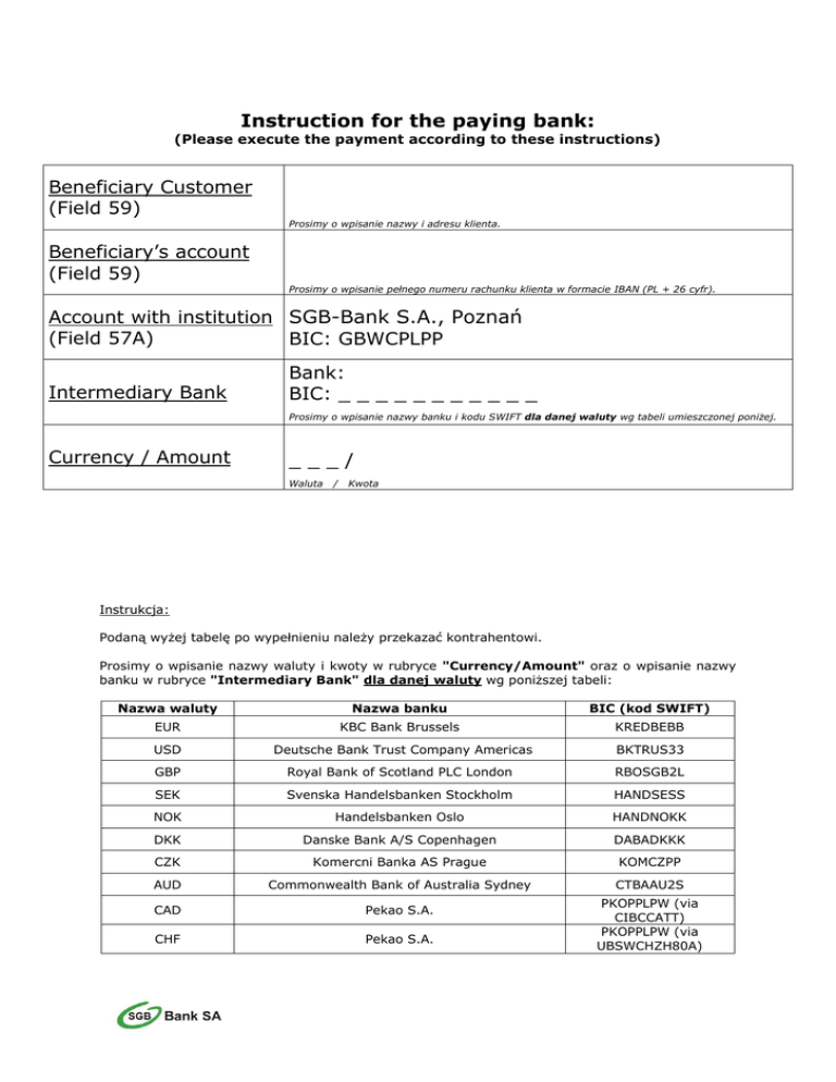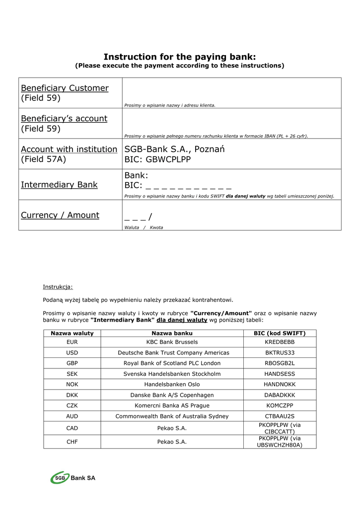 Instruction for the paying bank: (Please execute the payment according to these instructions) Beneficiary Customer (Field 59) Prosimy o wpisanie nazwy i adresu klienta. Beneficiary’s account (Field 59) Prosimy o wpisanie pełnego numeru rachunku klienta w formacie IBAN (PL + 26 cyfr). Account with institution SGB-Bank S.A., Poznań (Field 57A) BIC: GBWCPLPP Intermediary Bank Bank: BIC: _ _ _ _ _ _ _ _ _ _ _ Prosimy o wpisanie nazwy banku i kodu SWIFT dla danej waluty wg tabeli umieszczonej poniżej. Currency / Amount ___/ Waluta / Kwota Instrukcja: Podaną wyżej tabelę po wypełnieniu należy przekazać kontrahentowi. Prosimy o wpisanie nazwy waluty i kwoty w rubryce "Currency/Amount" oraz o wpisanie nazwy banku w rubryce "Intermediary Bank" dla danej waluty wg poniższej tabeli: Nazwa waluty Nazwa banku BIC (kod SWIFT) EUR KBC Bank Brussels KREDBEBB USD Deutsche Bank Trust Company Americas BKTRUS33 GBP Royal Bank of Scotland PLC London RBOSGB2L SEK Svenska Handelsbanken Stockholm HANDSESS NOK Handelsbanken Oslo HANDNOKK DKK Danske Bank A/S Copenhagen DABADKKK CZK Komercni Banka AS Prague KOMCZPP AUD Commonwealth Bank of Australia Sydney CTBAAU2S CAD Pekao S.A. CHF Pekao S.A. PKOPPLPW (via CIBCCATT) PKOPPLPW (via UBSWCHZH80A)