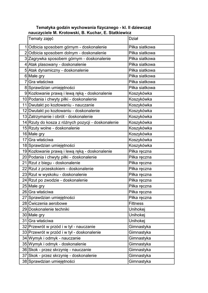 Tematyka godzin wychowania fizycznego - kl. II dziewcząt nauczyciele M. Krotowski, B. Kuchar, E. Statkiewicz Tematy zajęć Dział 1 2 3 4 5 6 7 8 9 10 11 12 13 14 15 16 17 18 19 20 21 22 23 24 25 26 27 28 29 30 31 32 33 34 35 36 37 38 Odbicia sposobem górnym - doskonalenie Odbicia sposobem dolnym - doskonalenie Zagrywka sposobem górnym - doskonalenie Atak plasowany - doskonalenie Atak dynamiczny - doskonalenie Małe gry Gra właściwa Sprawdzian umiejętności Kozłowanie prawą i lewą ręką - doskonalenie Podania i chwyty piłki - doskonalenie Dwutakt po kozłowaniu - nauczanie Dwutakt po kozłowaniu - doskonalenie Zatrzymanie i obrót - doskonalenie Rzuty do kosza z różnych pozycji - doskonalenie Rzuty wolne - doskonalenie Małe gry Gra właściwa Sprawdzian umiejętności Kozłowanie prawą i lewą ręką - doskonalenie Podania i chwyty piłki - doskonalenie Rzut z biegu - doskonalenie Rzut z przeskokiem - doskonalenie Rzut w wyskoku - doskonalenie Rzut po zwodzie - doskonalenie Małe gry Gra właściwa Sprawdzian umiejętności Ćwiczenia aerobowe Doskonalenie techniki Małe gry Gra właściwa Przewrót w przód i w tył - nauczanie Przewrót w przód i w tył - doskonalenie Wymyk i odmyk - nauczanie Wymyk i odmyk - doskonalenie Skok - przez skrzynię - nauczanie Skok - przez skrzynię - doskonalenie Sprawdzian umiejętności Piłka siatkowa Piłka siatkowa Piłka siatkowa Piłka siatkowa Piłka siatkowa Piłka siatkowa Piłka siatkowa Piłka siatkowa Koszykówka Koszykówka Koszykówka Koszykówka Koszykówka Koszykówka Koszykówka Koszykówka Koszykówka Koszykówka Piłka ręczna Piłka ręczna Piłka ręczna Piłka ręczna Piłka ręczna Piłka ręczna Piłka ręczna Piłka ręczna Piłka ręczna Fittness Unihokej Unihokej Unihokej Gimnastyka Gimnastyka Gimnastyka Gimnastyka Gimnastyka Gimnastyka Gimnastyka 39 40 41 42 43 44 Sprawdzian siły Gry i zabawy rekreacyjne Mała zabawa biegowa Duża zabawa biegowa Atletyka terenowa Atletyka terenowa - nordic walking 45 Biegi sprinterskie - 100 m 46 Biegi średnie - 400 m 47 Biegi średnie - 1500 m 48 Nauka jazdy na łyżwach 49 Doskonalenie jazdy na łyżwach 50 Gry i zabawy na lodowisku Wybór tematu oraz ilość godzin uzależniona jest od: - warunków pogodowych - warunków bazowych - dostępu do przyborów, sprzętu sportowego - liczebności grupy - poziomu motorycznego grupy - sprawności psychofizycznej ucznia Gimnastyka Gry i zabawy LA LA LA LA LA LA LA Łyżwiarstwo Łyżwiarstwo Łyżwiarstwo