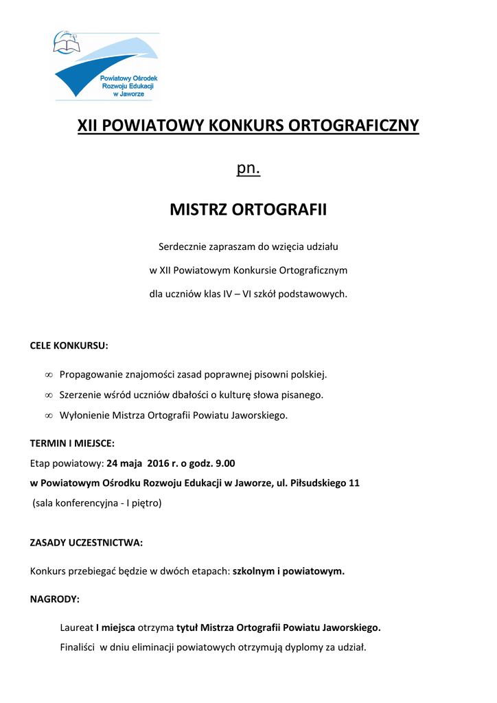 XII POWIATOWY KONKURS ORTOGRAFICZNY pn. MISTRZ ORTOGRAFII Serdecznie zapraszam do wzięcia udziału w XII Powiatowym Konkursie Ortograficznym dla uczniów klas IV – VI szkół podstawowych. CELE KONKURSU: • Propagowanie znajomości zasad poprawnej pisowni polskiej. • Szerzenie wśród uczniów dbałości o kulturę słowa pisanego. • Wyłonienie Mistrza Ortografii Powiatu Jaworskiego. TERMIN I MIEJSCE: Etap powiatowy: 24 maja 2016 r. o godz. 9.00 w Powiatowym Ośrodku Rozwoju Edukacji w Jaworze, ul. Piłsudskiego 11 (sala konferencyjna - I piętro) ZASADY UCZESTNICTWA: Konkurs przebiegać będzie w dwóch etapach: szkolnym i powiatowym. NAGRODY: Laureat I miejsca otrzyma tytuł Mistrza Ortografii Powiatu Jaworskiego. Finaliści w dniu eliminacji powiatowych otrzymują dyplomy za udział. ETAP SZKOLNY 1. Konkurs obejmuje materiał z zakresu zasad ortograficznych obowiązujących na sprawdzianie szóstoklasistów. Są to: pisownia wyrazów z ó, u, rz, ż, ch, h oraz wyjątków; pisownia zmiękczeń; pisownia spółgłosek dźwięcznych i bezdźwięcznych; pisownia wyrazów z ę, ą, en, em, on, om; pisownia partykuły nie z różnymi częściami mowy; pisownia cząstek –bym, - byś, -by; pisownia wielką i małą literą; pisownia wyrażeń przyimkowych i przyimków złożonych; interpunkcja w zdaniach pojedynczych, złożonych, wyliczeniach itp. 2. Etap szkolny organizują i przeprowadzają komisje szkolne powołane przez dyrektorów szkół. (można wykorzystać teksty dyktand z poprzednich lat) 3. Do etapu powiatowego szkoła zgłasza, w przypadku: 1- 2 oddziałów - 2 laureatów; 3- 4 oddziałów - 3 laureatów; 5 - 6 oddziałów (i więcej) - 4 laureatów etapu szkolnego (uczniów, którzy popełnili najmniejszą ilość błędów ortograficznych i interpunkcyjnych). W przypadku remisu prosimy o przeprowadzenie dogrywki. 4. Protokół z etapu szkolnego należy przesłać do Powiatowego Ośrodka Rozwoju Edukacji w Jaworze, ul. Piłsudskiego 11, 59-400 Jawor do 18 maja 2016 r. 5. Zgłoszenie szkoły do konkursu jest jednocześnie wyrażeniem zgody dyrektora, nauczycieli i rodziców uczniów biorących udział w konkursie na przetwarzanie wykorzystanie danych osobowych oraz wizerunku do celów związanych z organizacją konkursu. ETAP POWIATOWY 1. Forma konkursu: dyktando 2. Zasady oceniania: 1 błąd ortograficzny – 1 p., 3 błędy interpunkcyjne – 1 p. 3. Podczas pisania tekstu dyktanda nie wolno korzystać z żadnych pomocy naukowych. Dyktowanego tekstu nie wolno pisać drukowanymi literami. Nieczytelny i niejednoznaczny zapis wyrazu i znaku interpunkcyjnego będzie rozstrzygany na niekorzyść piszącego. Ewentualne poprawki i przekreślenia muszą być wyraźnie zaznaczone. 4. Konkurs obejmuje materiał z zakresu następujących zasad ortograficznych: pisownia wyrazów z ó, u, rz, ż, ch, h oraz wyjątków; pisownia zmiękczeń; pisownia spółgłosek dźwięcznych i bezdźwięcznych; pisownia wyrazów z ę, ą, en, em, on, om; pisownia zakończeń – ii, -ji, -i. pisownia partykuły nie z różnymi częściami mowy; pisownia cząstek –bym, - byś, -by; pisownia wielką i małą literą; pisownia wyrażeń przyimkowych i przyimków złożonych; interpunkcja w zdaniach pojedynczych, złożonych, wyliczeniach, dialogach itp. 5. Skład Komisji Konkursowej: W skład komisji wchodzą nauczyciele języka polskiego. Komisja sporządza protokół z uzyskanych wyników. Organizatorzy zastrzegają sobie prawo do przeprowadzenia dogrywki między uczestnikami, którzy zdobyli taką samą liczbę punktów. Pieczęć szkoły ……………………………………………...……………… Miejscowość, data PROTOKÓŁ z przebiegu ETAPU SZKOLNEGO XII POWIATOWEGO KONKURSU ORTOGRAFICZNEGO DLA KLAS IV – VI SZKÓŁ PODSTAWOWYCH który odbył się dnia……………………………………………..………….. w ……………………………………………….……………………………………………… 1. Godzina rozpoczęcia konkursu: ……………………………… 2. Godzina zakończenia konkursu: ……………………..……… 3. Skład Komisji Konkursowej: Przewodniczący ……………………………………..………………………….……………… Imię i nazwisko ……………………… podpis Członek jury ………………………………………………………………………………… ……………………… Członek jury …………………………………………………….…….…………………… ……………………… 4. Liczba uczniów, którzy przystąpili do konkursu: …………………….. 5. Wyniki konkursu (Uczniowie, którzy zakwalifikowali się do następnego etapu): PROSZĘ WPISAĆ DRUKOWANYMI LITERAMI Imię i nazwisko laureata konkursu Miejsce Klasa Imię i nazwisko opiekuna laureata konkursu 6. Uwagi o przebiegu konkursu: ………………………………………………………..………………………………………….………………… ……………………………………………………………………………………………………………………..……………………………..…………………………………… pieczątka i podpis dyrektora