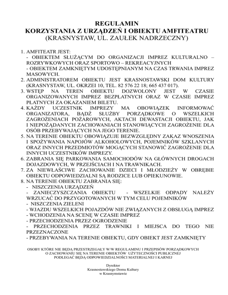 REGULAMIN KORZYSTANIA Z URZĄDZEŃ I OBIEKTU AMFITEATRU (KRASNYSTAW, UL. ZAUŁEK NADRZECZNY) 1. AMFITEATR JEST: - OBIEKTEM SŁUŻĄCYM DO ORGANIZACJI IMPREZ KULTURALNO – ROZRYWKOWYCH ORAZ SPORTOWO – REKREACYJNYCH - OBIEKTEM ZAMKNIĘTYM UDOSTĘPNIANYM NA CZAS TRWANIA IMPREZ MASOWYCH. 2. ADMINISTRATOREM OBIEKTU JEST KRASNOSTAWSKI DOM KULTURY (KRASNYSTAW, UL. OKRZEI 10, TEL. 82 576 22 18; 665 437 017). 3. WSTĘP NA TEREN OBIEKTU DOZWOLONY JEST W CZASIE ORGANIZOWANYCH IMPREZ BEZPŁATNYCH ORAZ W CZASIE IMPREZ PŁATNYCH ZA OKAZANIEM BILETU. 4. KAŻDY UCZESTNIK IMPREZY MA OBOWIĄZEK INFORMOWAĆ ORGANIZATORA, BĄDŹ SŁUŻBY PORZĄDKOWE O WSZELKICH ZAGROŻENIACH POŻAROWYCH, AKTACH DEWASTACJI OBIEKTU, JAK I NIEPOŻĄDANYCH ZACHOWANIACH STANOWIĄCYCH ZAGROŻENIE DLA OSÓB PRZEBYWAJĄCYCH NA JEGO TERENIE. 5. NA TERENIE OBIEKTU OBOWIĄZUJE BEZWZGLĘDNY ZAKAZ WNOSZENIA I SPOŻYWANIA NAPOJÓW ALKOHOLOWYCH, POJEMNIKÓW SZKLANYCH ORAZ INNYCH PRZEDMIOTÓW MOGĄCYCH STANOWIĆ ZAGROŻENIE DLA INNYCH UCZESTNIKÓW IMPREZY. 6. ZABRANIA SIĘ PARKOWANIA SAMOCHODÓW NA GŁÓWNYCH DROGACH DOJAZDOWYCH, W PRZEJŚCIACH I NA TRAWNIKACH. 7. ZA NIEWŁAŚCIWE ZACHOWANIE DZIECI I MŁODZIEŻY W OBRĘBIE OBIEKTU ODPOWIEDZIALNI SĄ RODZICE LUB OPIEKUNOWIE. 8. NA TERENIE OBIEKTU ZABRANIA SIĘ: - NISZCZENIA URZĄDZEŃ - ZANIECZYSZCZANIA OBIEKTU - WSZELKIE ODPADY NALEŻY WRZUCAĆ DO PRZYGOTOWANYCH W TYM CELU POJEMNIKÓW - NISZCZENIA ZIELENI - WJAZDU WSZELKICH POJAZDÓW NIE ZWIĄZANYCH Z OBSŁUGĄ IMPREZ - WCHODZENIA NA SCENĘ W CZASIE IMPREZ - PRZECHODZENIA PRZEZ OGRODZENIE - PRZECHODZENIA PRZEZ TRAWNIKI I MIEJSCA DO TEGO NIE PRZEZNACZONE - PRZEBYWANIA NA TERENIE OBIEKTU, GDY OBIEKT JEST ZAMKNIĘTY OSOBY KTÓRE NIE BĘDĄ PRZESTRZEGAŁY W/W REGULAMINU I PRZEPISÓW PORZĄDKOWYCH O ZACHOWANIU SIĘ NA TERENIE OBIEKTÓW UŻYTECZNOŚCI PUBLICZNEJ PODLEGAĆ BĘDĄ ODPOWIEDZIALNOŚCI MATERIALNEJ I KARNEJ Dyrektor Krasnostawskiego Domu Kultury w Krasnymstawie