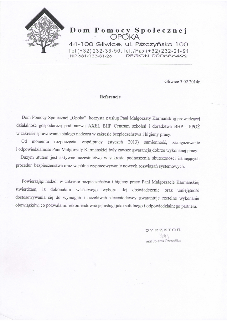 Dom Pomoc_y Spoleczlnej OPOKA^ 44-l OO (3liwic€, rrl, Pszczyfiskcl I OO Tel(*32)232-33-50,Te1. lFax (+32) 232-21Nf P 631 -'l 33-31-26 REGOI\| 00(f6A6492 91 Gliwice 3.02.2014r. Referencje Dom Pomocy Spolecznej ,,Opoka" korzysta z uslug Pani Malgorzaty Karmariskiej prowadz4cej dzialalnoSi gospodarczq pod nazwq AXEL BHP Centrum szkoleri i doradztwa BHp i ppOZ w zakresie sprawowania stalego nadzoru w zakresie bezpieczefstwa i higieny pracy. Od momentu rozpoczgcia wsp6lpracy (styczeri 2013) sumiennoSi, zaangaiowanie i odpowiedzialnoSc Pani Matgorzaty Karmanskiej byly zawsze gwarancj4dobrze wykonanej pracy. Duzym atutem jest aktywne uczestnictwo w zak'resie podnoszenia skuteczno$ci istniej4cych procedur bezpieczeristwa oraz wsp6lne wypracowywanie nowych rozwrqzari systemowych. i higieny pracy Pani Malgoruacie Karmanskiej stwierdzam, i2 dokonalam wlafciwego wyboru. Jej doSwiadczenie oruz umiejEtnoSi Powierzaj4c nadz6r w zakresie bezpieczeristwa dostosowywania siQ do wymagan i oczekiwari zleceniodawcy gwarantuje rzetelne wykonanie obowiqgk6w, co pozwala mi rekomendowa6 jej uslugi jako solidnego i odpowiedzialnego partnera. DY!RgKT(}rl' i,l,*,'' ngr Jchriit'* Fa;:c;*ilia