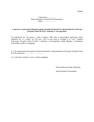 Projekt Uchwała nr ................ Rady Miejskiej w Kamieniu Pomorskiem z dnia ............................. w sprawie wyznaczenia Delegata gminy Kamień Pomorski do Zgromadzenia Celowego Związku Gmin R-XXI z siedzibą w Nowogardzie. Na podstawie art. 70 ustawy z dnia 8 marca 1990 roku o samorządzie gminnym (tekst jednolity Dz. U. z 2001r. Nr 142, poz. 1591 ze zm.) oraz w związku z § 7 ust. 2 Statutu Celowego Związku Gmin R-XXI z siedzibą w Nowogardzie; Rada Miejska w Kamieniu Pomorskim ustala co następuje: § 1. Do reprezentowania gminy Kamień Pomorski w Zgromadzeniu Celowego Związku Gmin R-XXI wyznacza........................................ § 2. Uchwała wchodzi w Ŝycie z dniem podjęcia. Przewodnicząca Rady Miejskiej mgr Kazimiera Szymańska