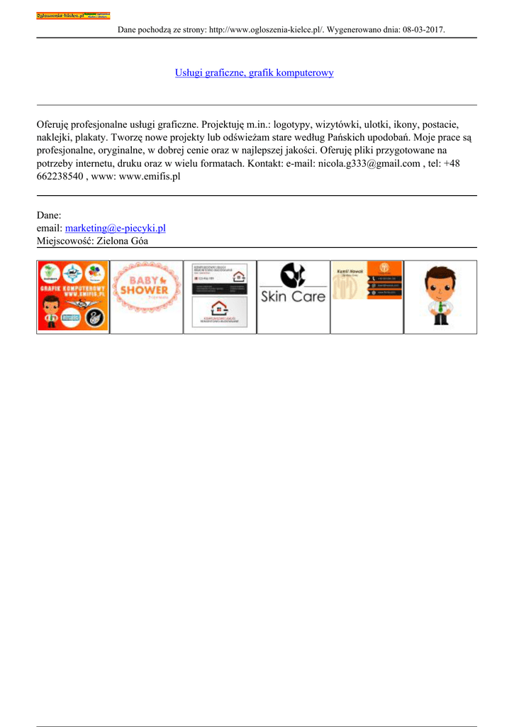 Dane pochodzą ze strony: http://www.ogloszenia-kielce.pl/. Wygenerowano dnia: 08-03-2017. Usługi graficzne, grafik komputerowy Oferuję profesjonalne usługi graficzne. Projektuję m.in.: logotypy, wizytówki, ulotki, ikony, postacie, naklejki, plakaty. Tworzę nowe projekty lub odświeżam stare według Pańskich upodobań. Moje prace są profesjonalne, oryginalne, w dobrej cenie oraz w najlepszej jakości. Oferuję pliki przygotowane na potrzeby internetu, druku oraz w wielu formatach. Kontakt: e-mail: [email protected] , tel: +48 662238540 , www: www.emifis.pl Dane: email: [email protected] Miejscowość: Zielona Góa