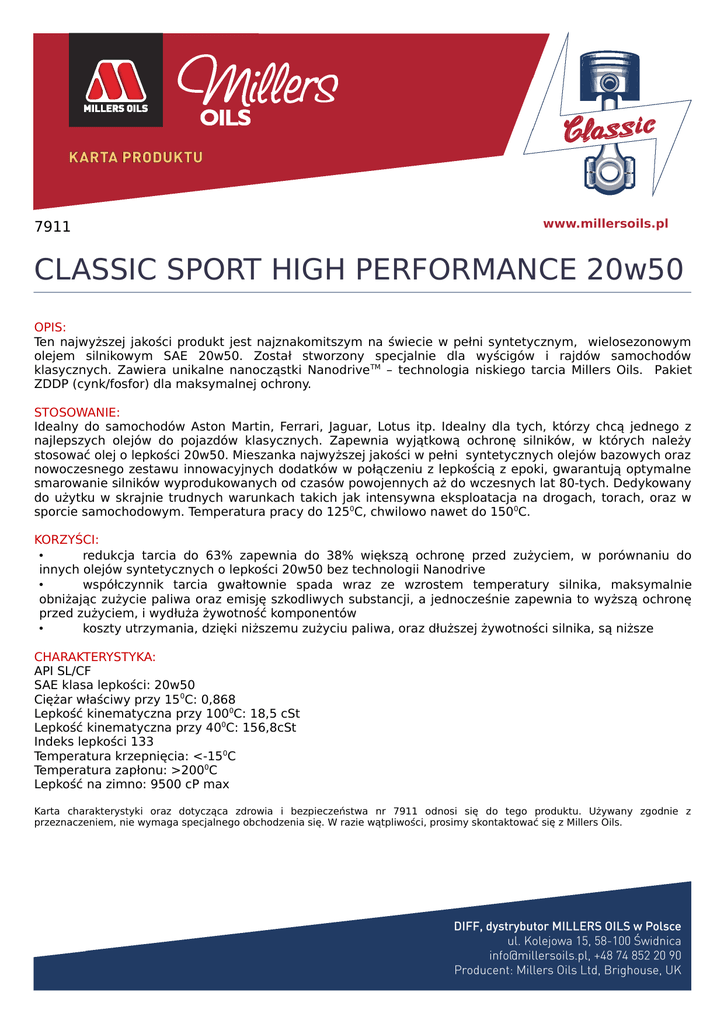 7911 CLASSIC SPORT HIGH PERFORMANCE 20w50 OPIS: Ten najwyższej jakości produkt jest najznakomitszym na świecie w pełni syntetycznym, wielosezonowym olejem silnikowym SAE 20w50. Został stworzony specjalnie dla wyścigów i rajdów samochodów klasycznych. Zawiera unikalne nanocząstki Nanodrive TM – technologia niskiego tarcia Millers Oils. Pakiet ZDDP (cynk/fosfor) dla maksymalnej ochrony. STOSOWANIE: Idealny do samochodów Aston Martin, Ferrari, Jaguar, Lotus itp. Idealny dla tych, którzy chcą jednego z najlepszych olejów do pojazdów klasycznych. Zapewnia wyjątkową ochronę silników, w których należy stosować olej o lepkości 20w50. Mieszanka najwyższej jakości w pełni syntetycznych olejów bazowych oraz nowoczesnego zestawu innowacyjnych dodatków w połączeniu z lepkością z epoki, gwarantują optymalne smarowanie silników wyprodukowanych od czasów powojennych aż do wczesnych lat 80-tych. Dedykowany do użytku w skrajnie trudnych warunkach takich jak intensywna eksploatacja na drogach, torach, oraz w sporcie samochodowym. Temperatura pracy do 1250C, chwilowo nawet do 1500C. KORZYŚCI: • redukcja tarcia do 63% zapewnia do 38% większą ochronę przed zużyciem, w porównaniu do innych olejów syntetycznych o lepkości 20w50 bez technologii Nanodrive • współczynnik tarcia gwałtownie spada wraz ze wzrostem temperatury silnika, maksymalnie obniżając zużycie paliwa oraz emisję szkodliwych substancji, a jednocześnie zapewnia to wyższą ochronę przed zużyciem, i wydłuża żywotność komponentów • koszty utrzymania, dzięki niższemu zużyciu paliwa, oraz dłuższej żywotności silnika, są niższe CHARAKTERYSTYKA: API SL/CF SAE klasa lepkości: 20w50 Ciężar właściwy przy 150C: 0,868 Lepkość kinematyczna przy 1000C: 18,5 cSt Lepkość kinematyczna przy 400C: 156,8cSt Indeks lepkości 133 Temperatura krzepnięcia: <-150C Temperatura zapłonu: >2000C Lepkość na zimno: 9500 cP max Karta charakterystyki oraz dotycząca zdrowia i bezpieczeństwa nr 7911 odnosi się do tego produktu. Używany zgodnie z przeznaczeniem, nie wymaga specjalnego obchodzenia się. W razie wątpliwości, prosimy skontaktować się z Millers Oils.