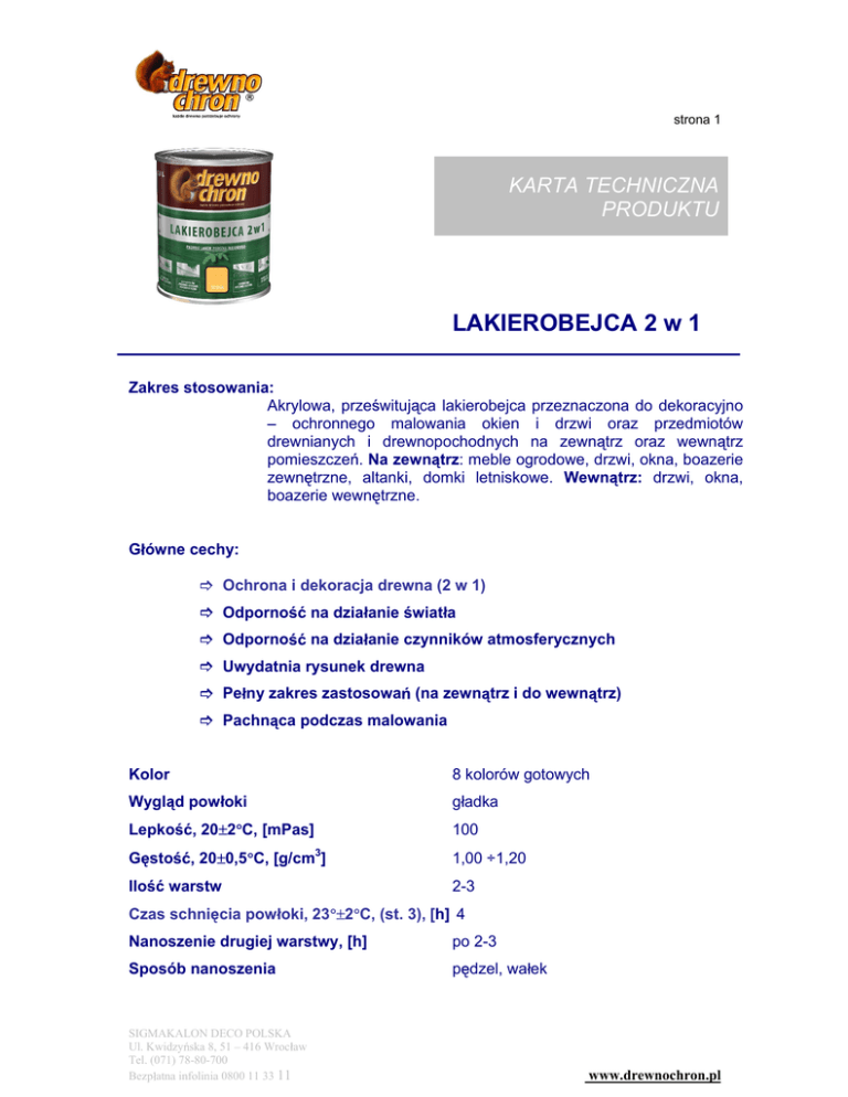 strona 1 KARTA TECHNICZNA PRODUKTU LAKIEROBEJCA 2 w 1 Zakres stosowania: Akrylowa, prze wituj ca lakierobejca przeznaczona do dekoracyjno ochronnego malowania okien i drzwi oraz przedmiotów drewnianych i drewnopochodnych na zewn trz oraz wewn trz pomieszcze . Na zewn trz: meble ogrodowe, drzwi, okna, boazerie zewn trzne, altanki, domki letniskowe. Wewn trz: drzwi, okna, boazerie wewn trzne. G ówne cechy: Ochrona i dekoracja drewna (2 w 1) Odporno na dzia anie wiat a Odporno na dzia anie czynników atmosferycznych Uwydatnia rysunek drewna Pe ny zakres zastosowa (na zewn trz i do wewn trz) Pachn ca podczas malowania Kolor 8 kolorów gotowych Wygl d pow oki g adka Lepko , 20 2 C, [mPas] 100 G sto , 20 0,5 C, [g/cm3] 1,00 ÷1,20 Ilo warstw 2-3 Czas schni cia pow oki, 23 2 C, (st. 3), [h] 4 Nanoszenie drugiej warstwy, [h] po 2-3 Sposób nanoszenia p dzel, wa ek SIGMAKALON DECO POLSKA Ul. Kwidzy ska 8, 51 416 Wroc aw Tel. (071) 78-80-700 Bezp atna infolinia 0800 11 33 11 www.drewnochron.pl strona 2 Wydajno przy jednej warstwie Rozcie czalnik do 10-12 m2/l woda Sposób u ycia 1.Przygotowanie pod o a Pod o e przeznaczone do malowania nale y wyrówna , przeszlifowa i odpyli . Powierzchnia przeznaczona do malowania powinna by czysta i sucha. Przedmioty wcze niej niemalowane, eksploatowane na zewn trz pomieszcze nale y zaimpregnowa DREWNOCHRONEM Impregnatem bezbarwnym. Nie nale y malowa na powierzchniach zaimpregnowanymi preparatami solnymi. Przy renowacji wymalowa , stare pow oki nale y zmatowi papierem ciernym i odpyli . Pow oki sp kane i uszcz ce si nale y przed malowaniem usun . 2. Malowanie Przed u yciem wyrób nale y dok adnie wymiesza . Surowe drewno, uprzednio niezgruntowane malowa Lakierobejc w postaci rozcie czonej (1 cz wody na 5 cz ci Lakierobejcy). Na zagruntowane drewno nak ada 2 warstwy wyrobu bez rozcie czania. W przypadku malowania renowacyjnego wystarczy naniesienie 1-2 warstw bez gruntowania. Pomi dzy warstwami zachowa przerw 2-3 h. Pe ne wyschni cie pow oki uzyskuje si po 4 h. Dla uzyskania lepszego efektu dekoracyjnego poprzedni warstw nale y przeszlifowa drobnoziarnistym papierem ciernym nr 180 i usun py . 3. Dodatkowe informacje Malowa przy temperaturze pod o a od +10 °C do +25 °C. Niska temperatura i wysoka wilgotno wyd u aj czas schni cia. Narz dzia po zako czeniu prac malarskich nale y umy starannie pod bie wod . Produkt wodorozcie czalny, nieodporny na mróz. Przechowywa w temp. powy ej 0°C. c 4. Wskazówki BHP i PPO W trakcie prac malarskich i po ich zako czeniu pomieszczenia wietrzy do zaniku charakterystycznego zapachu Chroni przed dzie mi. W razie po kni cia niezw oczne zasi gnij porady lekarza poka opakowanie lub etykiet . Stosowa si do zalece podanych na opakowaniu. Szczegó owe informacje zamieszczone s w Karcie Charakterystyki. Norma: Atesty: PKWiU: Data wa no ci: SIGMAKALON DECO POLSKA Ul. Kwidzy ska 8, 51 416 Wroc aw Tel. (071) 78-80-700 Bezp atna infolinia 0800 11 33 11 ZN-SKDP-034 Posiada Atest Higieniczny PZH 24.30.11-50.00 36 miesi cy od daty produkcji www.drewnochron.pl strona 3 Znak termometru 00C ÷ +300C Limit zawarto ci LZO wg Dyrektywy 2004/42/WE dla tego produktu (kat.A/e): 150 g/l (2007)/ 130 g/l (2010). Produkt ten zawiera maks. 130 g/l VOC. Opakowanie handlowe SIGMAKALON DECO POLSKA Ul. Kwidzy ska 8, 51 416 Wroc aw Tel. (071) 78-80-700 Bezp atna infolinia 0800 11 33 11 0,8L www.drewnochron.pl