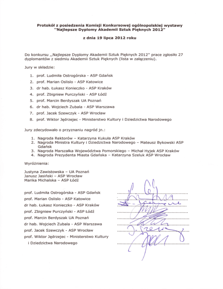 Protokół z posiedzenia Komisji Konkursowej ogólnopolskiej wystawy ''Najlepsze Dyplomy Akademii Sztuk Pięknych 2oI2" z dnia 19 lipca 2O12 roku Do konkursu ,,Najlepsze Dyplomy Akademii Sztuk Pięknych 2oI2" prace zgłosiło27 dyplomantów z siedmiu Akademii Sztuk Pięknych (lista w załączeniu). Jury w składzie: 1' prof. Ludmiła ostrogórska - ASP Gdańsk 2, 3. 4. prof. Marian Oslislo - ASP Katowice 5' 6. 7. B. dr hab. Łukasz Konieczko - AsP Kraków prof. Zbigniew Purczyński - ASP Łódź prof. Marcin Berdyszak UA Poznań dr hab. Wojciech Zubala - ASP Warszawa prof. Jacek Szewczyk - AsP Wrocław prof. Wiktor Jędrzejec - Ministerstwo Kultury i Dziedzictwa Narodowego Jury zdecydowało o przYznaniu nagród jn.: 1. 2. 3. 4. Nagroda Nagroda Gdańsk Nagroda Nagroda Rektorów * Katarzyna Kukuła ASP Kraków Ministra Kultury i Dziedzictwa Narodowego - Mateusz Bykowski ASP Marszałka Województwa Pomorskiego - Michał Hyjek ASP Kraków Prezydenta Miasta Gdańska _ Katarzyna Szeluk ASP Wrocław Wyróznienia: Justyna Zawistowska _ UA Poznań Janusz Jasiński - ASP Wrocław Marika Michalska - AsP Łódź prof. Ludmiła ostrogórska - ASP Gdańsk prof. Marian Oslislo - ASP Katowice dr hab' Łukasz Konieczko - AsP Kraków prof. Zbigniew Purczyński - ŁódŹ ^sP prof' Marcin Berdyszak UA Poznań dr hab. Wojciech Zubala - ASP Warszawa prof. Jacek Szewczyk - ASP Wrocław prof. Wiktor Jędrzejec - Ministerstwo Kultury i Dziedzictwa Narodowego