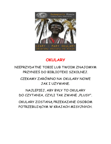 OKULARY NIEPRZYDATNE TOBIE LUB TWOIM ZNAJOMYM PRZYNIEŚ DO BIBLIOTEKI SZKOLNEJ. CZEKAMY ZARÓWNO NA OKULARY NOWE JAK I UŻYWANE. NAJLEPIEJ, ABY BYŁY TO OKULARY DO CZYTANIA, CZYLI TAK ZWANE „PLUSY”. OKULARY ZOSTANĄ PRZEKAZANE OSOBOM POTRZEBUJĄCYM W KRAJACH MISYJNYCH.