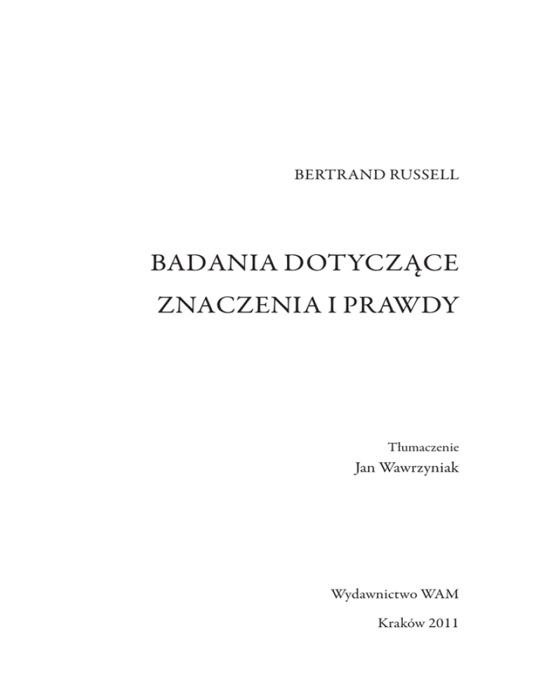 3 BERTRAND RUSSELL BADANIA DOTYCZĄCE ZNACZENIA I PRAWDY Tłumaczenie Jan Wawrzyniak Wydawnictwo WAM Kraków 2011 2 m y ś l f i l o z o f i c z n a Wprowadzenia Panorama zagadnień Historia myśli filozoficznej Monografie Rozprawy Komitet Naukowy prof. dr hab. Adam Węgrzecki ks. dr hab. Józef Bremer SJ, prof. WSFP „Ignatianum”/UJ B. Russell, Badania dotyczące znaczenia i prawdy W przygotowaniu: D. v. Hildebrand, Metafizyka wspólnoty D. Zahawi, Wprowadzenie do fenomenologii Husserla Seria Myśl Filozoficzna poświęcona jest kluczowym dylematom nurtującym od zawsze umysł i serce człowieka i stanowiącym punkty ogniskujące refleksję filozoficzną w dziejach myśli, szczególnie zachodnioeuropejskiej. Jej zamiarem jest udostępnienie fachowych opracowań poszczególnych zagadnień filozoficznych oraz zachęcenie do podjęcia, samodzielnie, przygody filozofowania. Publikacje Serii, przygotowane przez wybitnych specjalistów, adresowane są do osób zajmujących się filozofią oraz do tych, którzy nie będąc profesjonalistami w tej dziedzinie, pragną rzetelnej wiedzy oraz panoramicznego oglądu problematyki filozoficznej. 4 Tytuł oryginału An Inquiry into Meaning and Truth. The William James Lectures for 1940 Delivered at Harvard University by Bertrand Russell © 1980 Unwin Hyman Ltd All Rights Reserved Authorised translation from English language edition published by Spokesman, the imprint of the Bertrand Russell Peace Foundation Ltd. © Wydawnictwo WAM, 2011 Redaktor serii dr Tomasz Homa SJ Redakcja naukowa dr hab. Józef Bremer SJ Redakcja Małgorzata Płazowska Projekt okładki Andrzej Sochacki ISBN 978-83-7505-721-8 WYDAWNICTWO WAM ul. Kopernika 26 • 31-501 Kraków tel. 12 62 93 200 • faks 12 42 95 003 e-mail: [email protected] www.wydawnictwowam.pl DZIAŁ HANDLOWY tel. 12 62 93 254-256 • faks 12 43 03 210 e-mail: [email protected] KSIĘGARNIA INTERNETOWA tel. 12 62 93 260, 12 62 93 446-447 faks 12 62 93 261 e.wydawnictwowam.pl Drukarnia Wydawnictwa WAM • ul. Kopernika 26, 31-501 Kraków 5 SPIS TREŚCI Przedmowa Wstęp I. Czym jest słowo? II. Zdania, składnia oraz części mowy III. Zdania opisujące doświadczenia IV. Język przedmiotowy V. Terminy logiczne VI. Nazwy własne VII. Wyrażenia okazjonalne VIII. Percepcja a wiedza IX. Przesłanki epistemologiczne X. Sądy bazowe XI. Przesłanki faktualne XII. Analiza problemów dotyczących sądów XIII. Sens zdań: A. Ogólny. B. Psychologiczny. C. Syntaktyczny XIV. Język jako środek wyrazu XV. Co „wskazują” zdania? XVI. Prawda i fałsz. Wprowadzenie XVII. Prawda i doświadczenie XVIII. Przekonania ogólne XIX. Ekstensjonalność i atomiczność XX. Prawo wyłączonego środka XXI. Prawda i weryfikacja XXII. Sens i weryfikacja XXIII. Uzasadniona stwierdzalność XXIV. Analiza XXV. Język i metafizyka 7 9 22 28 45 59 74 89 102 110 123 129 140 155 159 192 201 212 221 231 243 257 272 289 301 309 322 Indeks rzeczowy Indeks osób 329 334 9 WSTĘP Celem niniejszej pracy jest zbadanie pewnych problemów dotyczących wiedzy empirycznej. Przyjęta przeze mnie metoda różni się od tej akceptowanej w tradycyjnej teorii wiedzy1, głównie pod względem znaczenia przypisywanego rozważaniom kwestii językowych. Proponuję, by badać język w kontekście dwóch podstawowych problemów, które wstępnie i niezbyt precyzyjnie można ująć w następujący sposób: I. Co znaczy wyrażenie „empiryczne świadectwo na rzecz prawdziwości sądu2”? II. Co można wywnioskować z faktu, że czasami istnieje takie świadectwo? W tym przypadku, jak zwykle w filozofii, pierwszą trudnością jest dostrzeżenie, iż problem jest trudny. Jeśli zapyta się osobę nieobeznaną w filozofii „skąd wiesz, że mam dwoje oczu?”, to odpowie „co za śmieszne pytanie? Przecież widzę”. Nie należy spodziewać się, że gdy nasze badania zostaną zakończone, dojdziemy do wniosku całkowicie różnego od tego niefilozoficznego stanowiska. Rezultat będzie następujący: okaże się, że to, o czym sądziliśmy, iż jest proste, ma skomplikowaną strukturę; uświadomimy sobie, że cień niepewności pada na sytuacje, które nie wzbudzają żadnych wątpliwości; uznamy, że wątpliwości są znacznie częściej uzasadnione, niż przypuszczaliśmy; okaże się, że nawet na podstawie najbardziej wiarygodnych 1 Pomimo iż tradycyjnym tłumaczeniem angielskiej nazwy theory of knowledge jest określenie „teoria poznania”, zdecydowałem się na na przekład „teoria wiedzy”. Moja decyzja jest podyktowana dwoma względami. Po pierwsze, dzięki temu rozstrzygnięciu można w bardziej adekwatny i przejrzysty sposób przetłumaczyć wiele fragmentów książki, w których Russell wskazuje, iż jednym z podstawowych zadań teorii wiedzy (theory of knowledge) jest wyjaśnienie znaczenia słów takich jak „wiedza” (knowledge), „wiedzieć” (know). Po drugie, użycie sformułowania „teoria wiedzy” wskazuje, że tym, co przede wszystkim interesuje klasycznych epistemologów (w tym także Russella), jest kwestia prawomocności naszych przekonań, nie zaś sposób dochodzenia do nich. Wszystkie przypisy oznaczone liczbami, podobnie jak uwagi w nawiasach kwadratowych, pochodzą od tłumacza. 2 W przeważającej większości przypadków termin proposition tłumaczę jako „sąd”. Od tej konwencji odstępuję: (a) w wykorzystanych przeze mnie cudzych przekładach cytowanych przez Russella fragmentów tekstów; (b) w przypadku następujących zwrotów: proposition of logic, proposition of mathematics; (c) gdy autor przedstawia poglądy logicznych pozytywistów. Tłumaczenie proposition jako „sąd” jest, moim zdaniem, uzasadnione ze względu na podane przez Russella wyjaśnienia sensu tego słowa (zob. rozdział XII). Ze względu na to, że termin judgment także tłumaczę jako „sąd”, w przypadkach budzących wątpliwości zaznaczam, o którym terminie jest mowa. 10 Wstęp przesłanek można wyciągnąć niewiarygodn