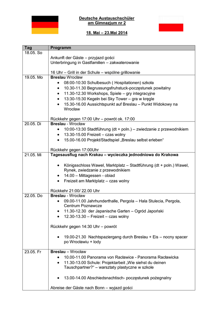 Deutsche Austauschschüler am Gimnazjum nr 2 18. Mai – 23.Mai 2014 Tag 18.05. So Programm Ankunft der Gäste – przyjazd gości Unterbringung in Gastfamilien – zakwaterowanie 19.05. Mo 20.05. Di 21.05. Mi 16 Uhr – Grill in der Schule – wspólne grillowanie Breslau Wrocław 08:00-10:30 Schulbesuch ( Hospitationen) szkoła 10.30-11.30 Begrussungsfruhstuck-poczęstunek powitalny 11.30-12.30 Workshops, Spiele – gry integracyjne 13:30-15:30 Kegeln bei Sky Tower – gra w kręgle 15.30-16.00 Aussichtspunkt auf Breslau – Punkt Widokowy na Wrocław Rückkehr gegen 17:00 Uhr – powrót ok. 17:00 Breslau - Wrocław 10:00-13:30 Stadtführung (dt + poln.) – zwiedzanie z przewodnikiem 13.30-15.00 Freizeit – czas wolny 15.00-16.00 Projekt/Stadtspiel „Breslau selbst erleben“ Rückkehr gegen 17:00Uhr Tagesausflug nach Krakau – wycieczka jednodniowa do Krakowa 22.05. Do Königsschloss Wawel, Marktplatz – Stadtführung (dt + poln.) Wawel, Rynek, zwiedzanie z przewodnikiem 14.00 – Mittagessen - obiad Freizeit am Marktplatz – czas wolny Rückkehr 21:00/ 22.00 Uhr Breslau - Wrocław 09.00-11.00 Jahrhunderthalle, Pergola – Hala Stulecia, Pergola, Centrum Poznawcze 11.30-12.30 der Japanische Garten – Ogród Japoński 12.30-13.30 – Freizeit – czas wolny Rückkehr gegen 14:30 Uhr – powrót 23.05. Fr 19.00-21.30 Nachtspaziergang durch Breslau + Eis – nocny spacer po Wrocławiu + lody Breslau – Wrocław 10.00-11.00 Panorama von Racławice - Panorama Racławicka 11.30-13.00 Schule: Projektarbeit „Wie siehst du deinen Tauschpartner?“ – warsztaty plastyczne w szkole 13.00-14.00 Abschiedsnachtisch- poczęstunek pożegnalny Abreise der Gäste nach Bonn – wyjazd gości