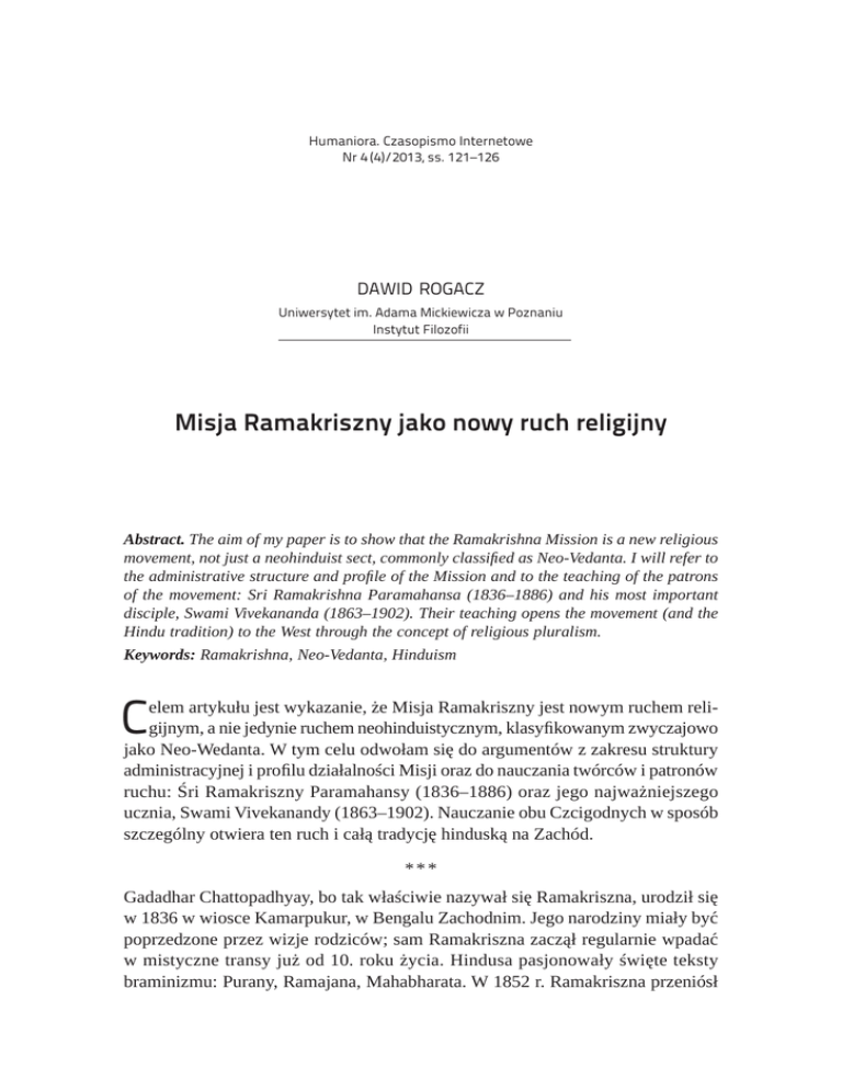 Humaniora. Czasopismo Internetowe Nr 4 (4)/2013, ss. 121–126 dawid rogacz Uniwersytet im. Adama Mickiewicza w Poznaniu Instytut Filozofii Misja Ramakriszny jako nowy ruch religijny Abstract. The aim of my paper is to show that the Ramakrishna Mission is a new religious movement, not just a neohinduist sect, commonly classified as Neo-Vedanta. I will refer to the administrative structure and profile of the Mission and to the teaching of the patrons of the movement: Sri Ramakrishna Paramahansa (1836–1886) and his most important disciple, Swami Vivekananda (1863–1902). Their teaching opens the movement (and the Hindu tradition) to the West through the concept of religious pluralism. Keywords: Ramakrishna, Neo-Vedanta, Hinduism C elem artykułu jest wykazanie, że Misja Ramakriszny jest nowym ruchem religijnym, a nie jedynie ruchem neohinduistycznym, klasyfikowanym zwyczajowo jako Neo-Wedanta. W tym celu odwołam się do argumentów z zakresu struktury administracyjnej i profilu działalności Misji oraz do nauczania twórców i patronów ruchu: Śri Ramakriszny Paramahansy (1836–1886) oraz jego najważniejszego ucznia, Swami Vivekanandy (1863–1902). Nauczanie obu Czcigodnych w sposób szczególny otwiera ten ruch i całą tradycję hinduską na Zachód. * * * Gadadhar Chattopadhyay, bo tak właściwie nazywał się Ramakriszna, urodził się w 1836 w wiosce Kamarpukur, w Bengalu Zachodnim. Jego narodziny miały być poprzedzone przez wizje rodziców; sam Ramakriszna zaczął regularnie wpadać w mistyczne transy już od 10. roku życia. Hindusa pasjonowały święte teksty braminizmu: Purany, Ramajana, Mahabharata. W 1852 r. Ramakriszna przeniósł 122 dawid rogacz się do Kalkuty, gdzie został kapłanem świątyni Kali. Wkrótce ożenił się z Śaradą Devi, która stała się jego uczennicą – zwolennicy Ramakriszny nazywają ją Świętą Matką. Za pośrednictwem Bhairavi Brahmani Ramakriszna rozpoczął praktykowanie tantryzmu, polegającego na recytowaniu mantr i medytacji, pozwalającej dostrzec w świecie przejawy boskiego pierwiastka kobiecego (Śakti ). Później Ramakriszna rozpoczął praktykę wajśnawa bhakti, za przedmiot pobożności obierając awatar Wisznu, Ramę. Hindus pogłębiał mistykę emocjonalną, gdyż ów rodzaj pobożności zakładał, że istnieje pięć nastrojów (bhavas) służących ekspresji miłości do Boga. Kolejnym przystankiem na duchowej drodze Ramakriszny stała się najważniejsza filozofia braminizmu, adwajta-wedanta, przekazana mu przez Totapuri. Po osiągnięciu nirvikalpa samadhi, wskutek uświadomienia sobie iluzoryczności świata, Ramakriszna uznał, że znajduje się w stanie pośrednim pomiędzy naturalną świadomością a enstazą jogiczną, co pozwala mu oświecać ludzkość nowiną o niedwoistości rzeczywistości. Za sprawą Govindy Roya Ramakriszna poznaje w 1866 r. sufizm i islam. Hindus przyjął ubiór i zwyczaje muzułmanów i poświęcił się modlitwie do tego stopnia, że objawił mu się sam Prorok. Za sprawą Shambu Mallika siedem lat później Ramakriszna rozpoczyna lekturę Biblii – porzuca nabożeństwa hinduistyczne, a któregoś dnia objawia mu się Madonna z Dzieciątkiem. W 1875 r. Ramakriszna spotyka Keshaba, lidera uniwersalistycznego ruchu Brahmo Samadź, odrzucającego idolatrię, rytuały, system kastowy i obrzęd sati. Ramakriszna uznał, iż jego misją jest zachęcanie wykształconych, anglojęzycznych elit Indii do oddawania czci jednemu i powszechnemu Bogu, którego nazywał Matką. Umierając, Ramakriszna przekazał swoją moc i nauczanie Swamiemu Vivekanandzie, najważniejszemu uczniowi i członkowi założonego za życia mistrza Zakonu Ramakriszny1. Nauczanie Ramakriszny zostało spisane w formie dialogów sokratycznych i zapisane przez Mahendranatha Guptę w Sri Sri Ramakrishna Katamrita, przetłumaczoną przez Swamiego Nikhilanandę z bengalskiego na angielski jako Gospel of Sri Ramakrishna2. Ramakriszna nauczał, że wyzwolenie z uwarunkowanego sposobu istnienia rozumiane w duchu bhakti jako zjednoczenie z osobowym Bogiem jest celem życia każdego człowieka. Głównymi przeszkodami w osiągnięciu mokszy są: pożądliwość seksualna, związana z pierwiastkem kobiecym (kama), oraz to, co ludzie Zachodu określają za Wergiliuszem mianem auri sacra fames – przeklętej żądzy złota; Ramakriszna nazywał to kanchana i wiązał z pierwiastkiem męskim3. Doświadczenie nirwikalpa samadhi pozwoliło Ramakrisznie wyróżnić dwa poziomy maji, iluzji Biografia Ramakriszny za: M. Müller, Ramakrishna. His Life and Sayings, Longmans Green, London 1898, ss. 30–57. 2 Szczegółowo o tłumaczeniu: M. Maclean, A Translation of the sri-sri-ramakrisnakathamrita with explanatory notes and critical introduction, University of Otago Press, Dunedin 1983. 3 Mahendranath Gupta, Gospel of Sri Ramakrishna, Belurmath, New York 1942, rozdz. 7, s. 198. 1 Misja Ramakriszny jako nowy ruch religijny 123 skrywającej brahmana: iluzję niewiedzy (awidja maja) oraz iluzję wiedzy (widja maja). Pierwsza obejmuje ciemne i nieokiełznane siły przyrody, przejawiające się w człowieku poprzez jego podświadomość i odpowiadające w praktyce za jego uwięzienie w kręgu wcieleń. Druga to „jasna” część świata, obejmująca zdolności umysłowe, cnoty, miłość i poświęcenie, a więc wszystko, co pociąga w stronę wyzwolenia4. Przyjmując istnienie maji, Ramakriszna przyjmował też istnienie brahmana. Uważał, że jest on wszechobecną świadomością, manifestującą się hinduistom jako Śiwa. W duchu wedanty Śankary głosił jednak, iż brahman jest zasadniczo niepoznawalny i pozbawiony jakości (nirguna). Znaczy to, że żadna religia nie określa w pełni tego, jaki jest. Pionierstwo Ramakriszny polegało na tym, iż uznał, że każda z religii czyni to w sposób częściowy; w takim zakresie, w jakim ma to miejsce, każda religia jest słuszna i prawdziwa. Wszystkie religie prowadzą do jed